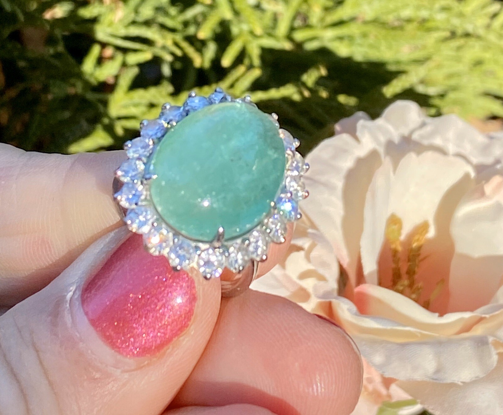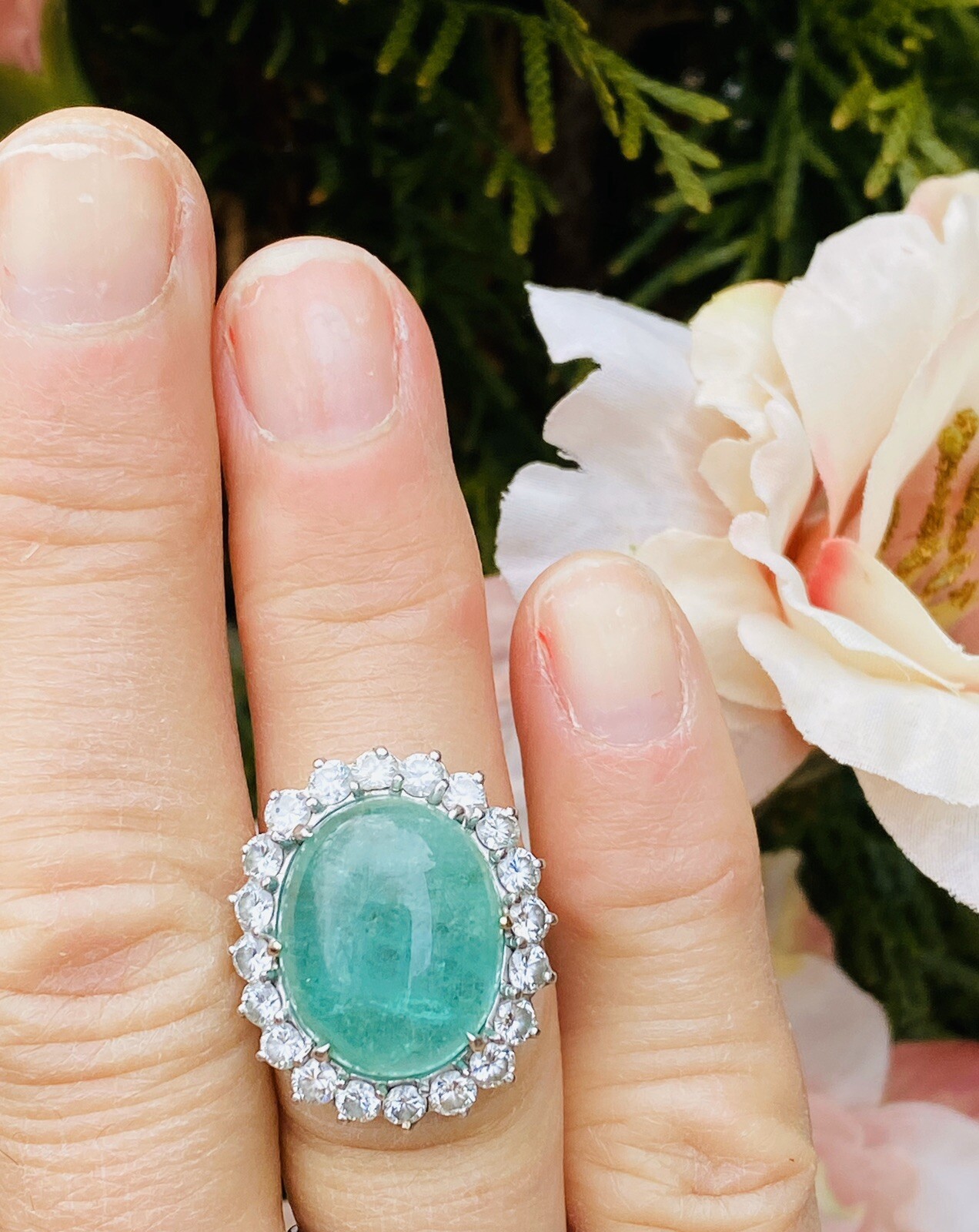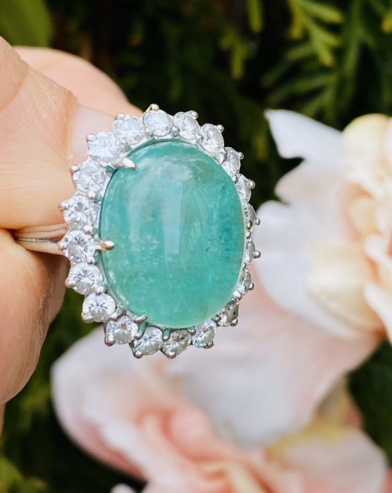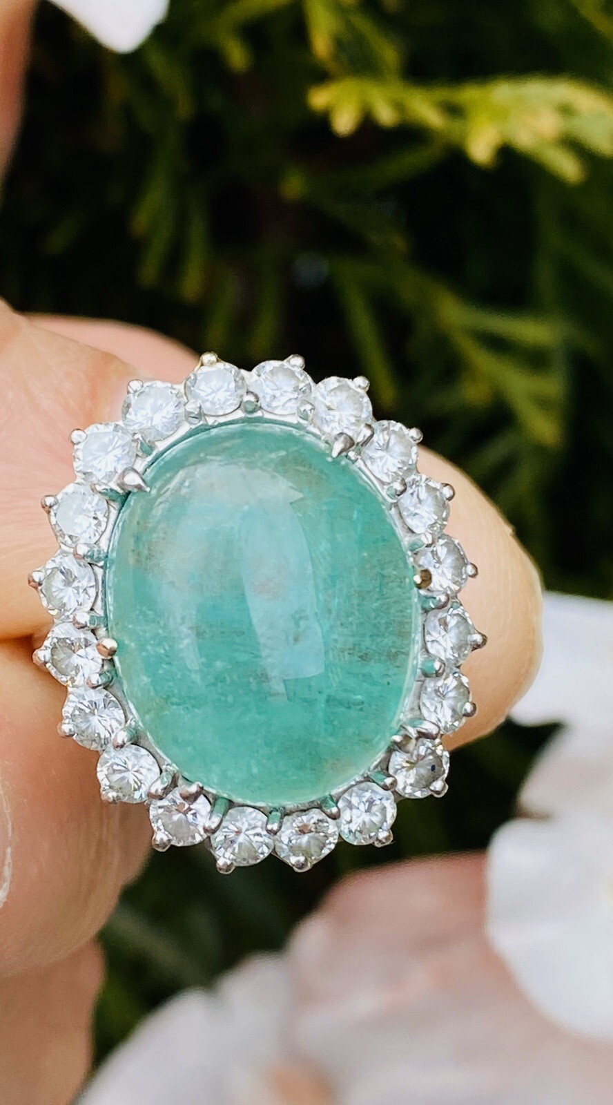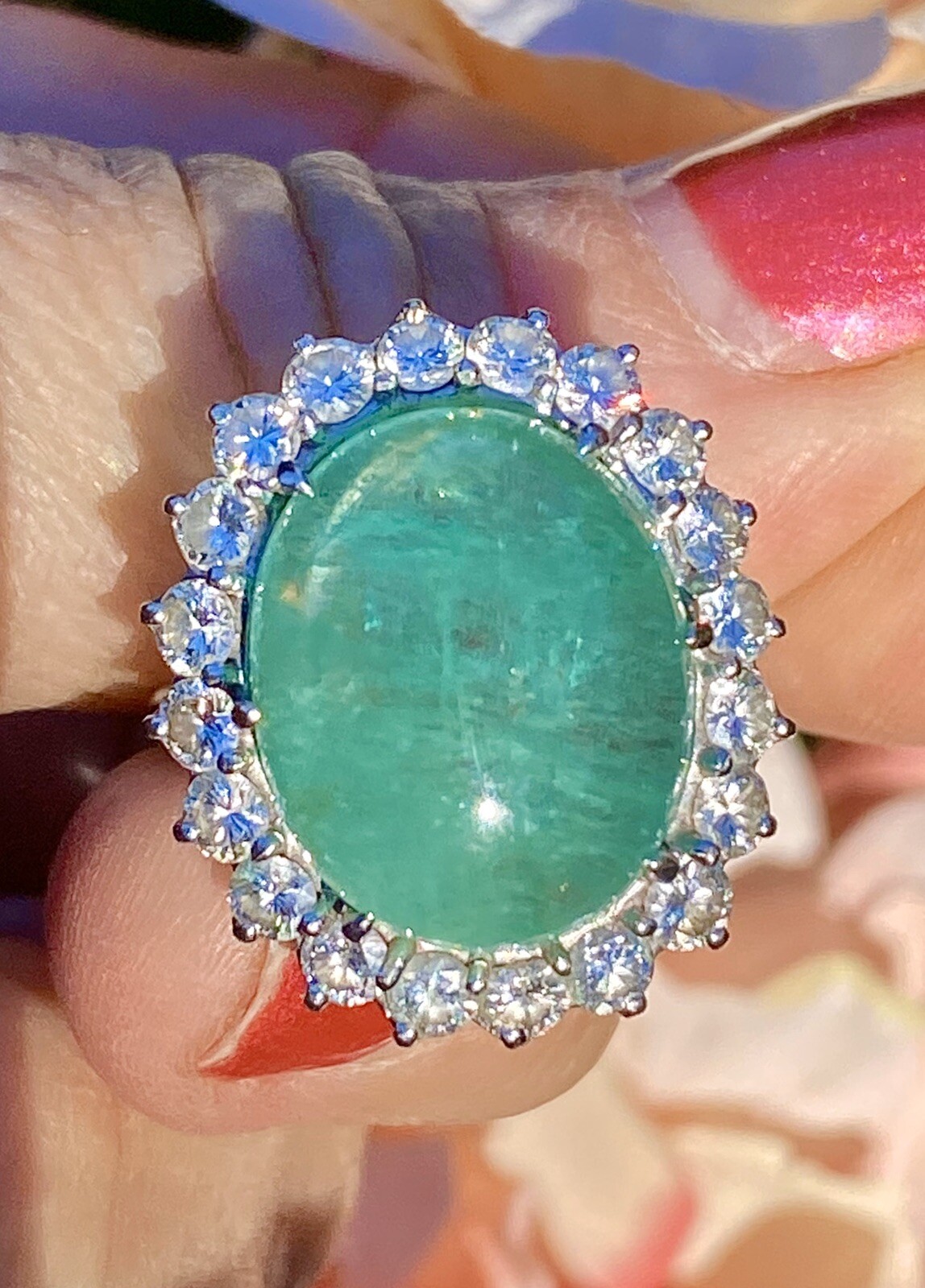 Large Vintage 1950s 10ct Emerald Cabachon VS Diamond Halo Platinum Cocktail Ring