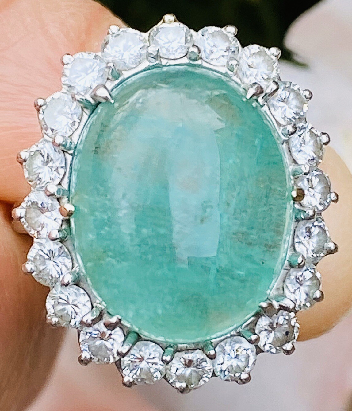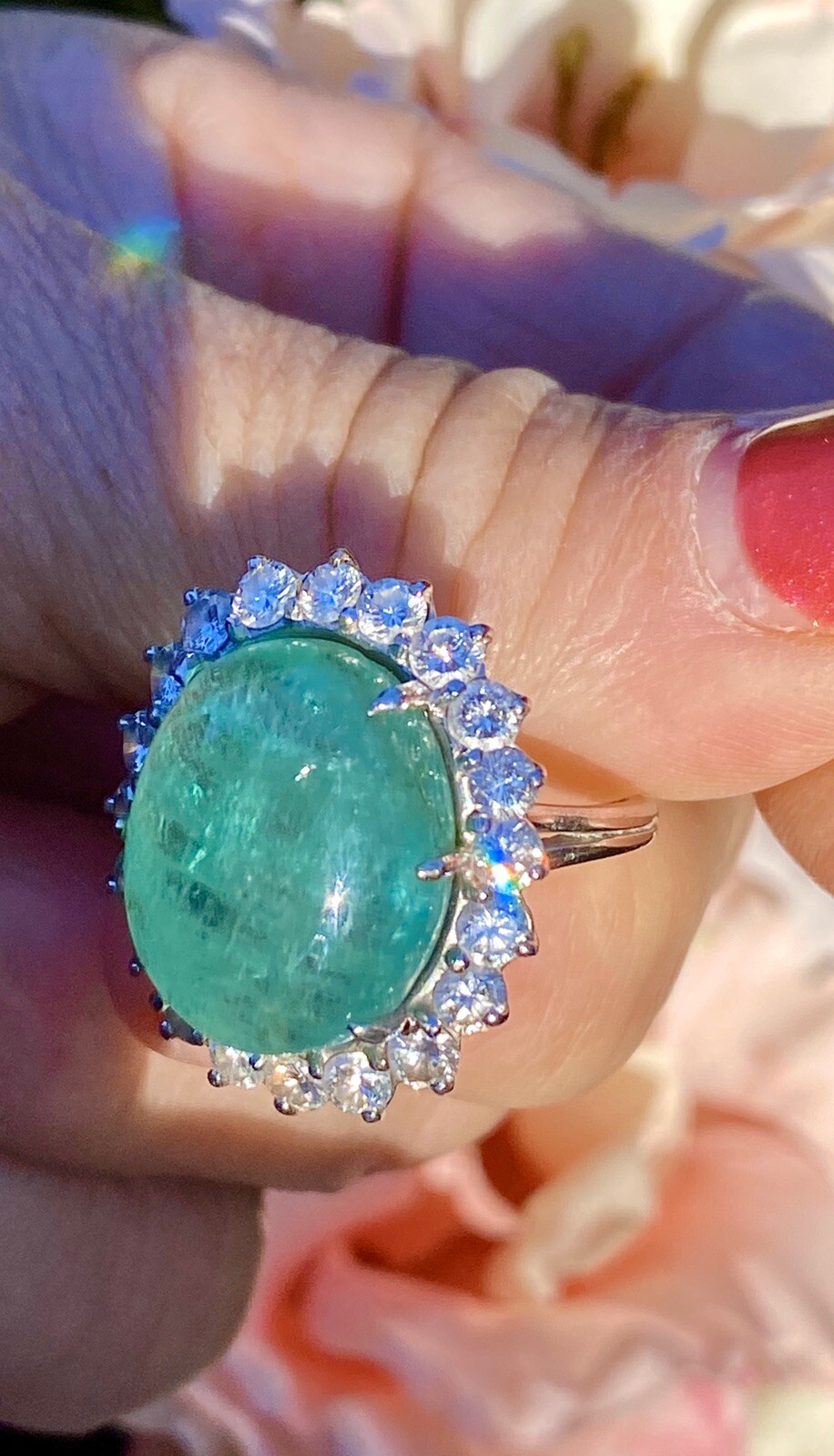 Huge Impressive Vintage 1950s 10ct Emerald Cabachon VS Diamond Halo Platinum Cocktail Ring