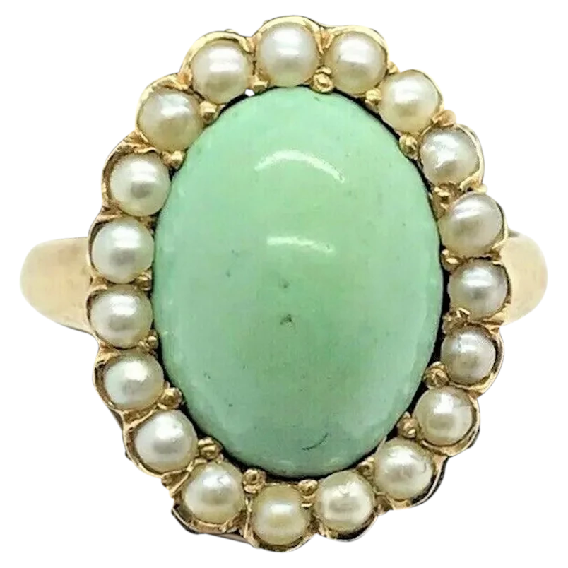 Antique Art Deco / Victorian 14K Green Turquoise Cabachon Seed Pearl Halo Ring