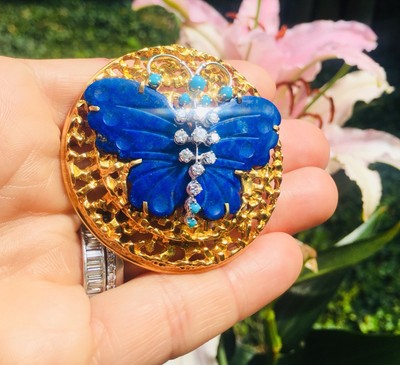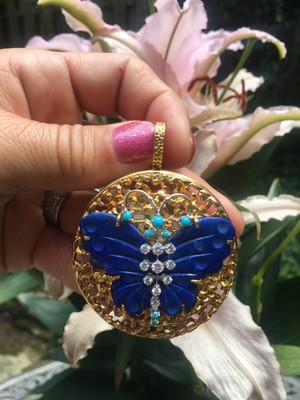 Impressive Handmade 18k Gold Peter Lindeman Carved Lapis Diamond Turquoise Butterfly Pendant Brooch