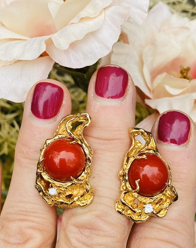 Vintage 1960s Retro 18k Gold Red Coral VS Diamond Drop Freeform Earrings