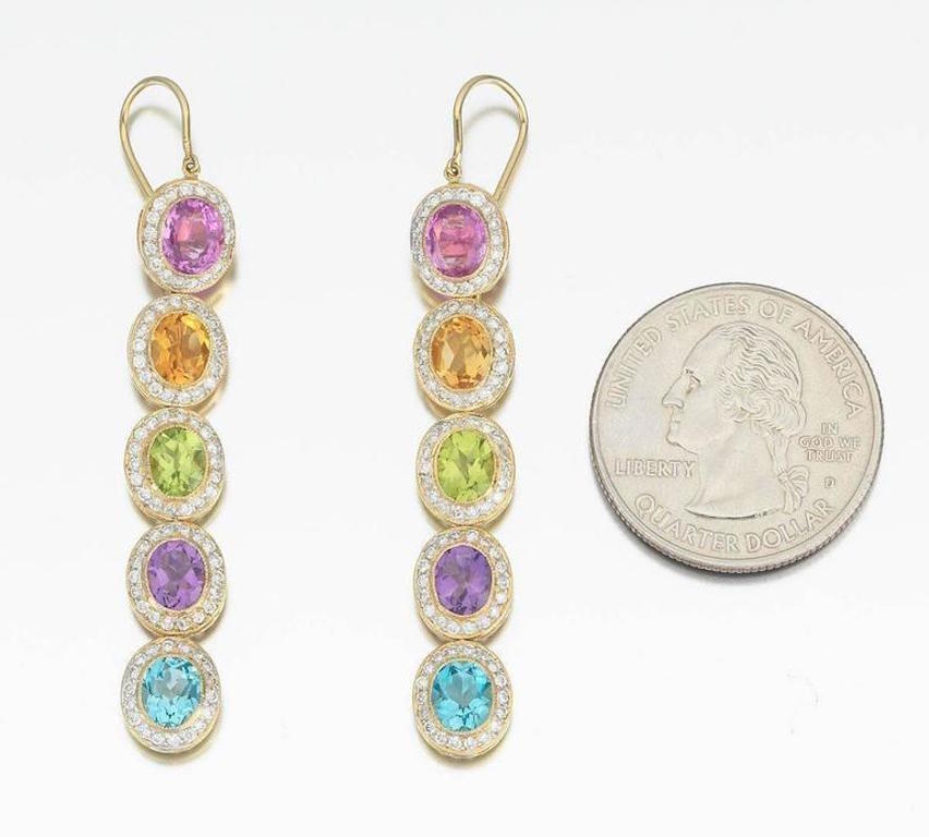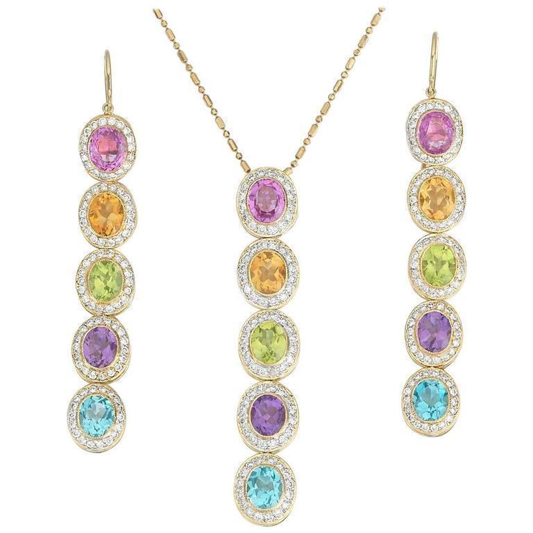 Striking and colorful jewelry set consisting of an 18k yellow gold pendant and earrings set with gemstones including: tourmaline, citrine, peridot, amethyst and topaz.