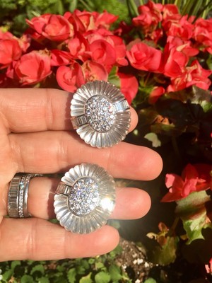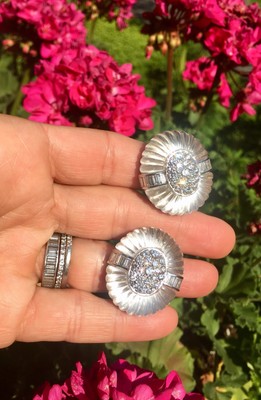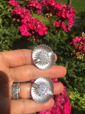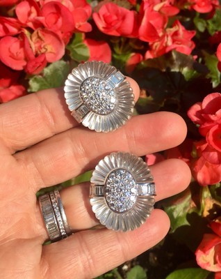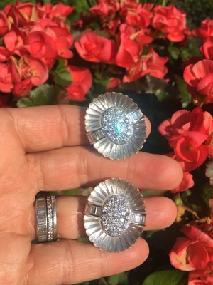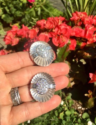 The 18k white gold earrings are a bombé design set with a pave-set circular brilliant cut diamond center flanked by a row of channel-set baguette diamonds, total estimated weight of 2.75 F/G VS diamonds.