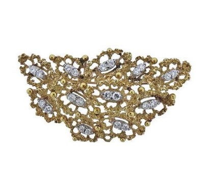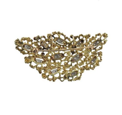 The brooch is unmarked but tested for 14k gold purity.