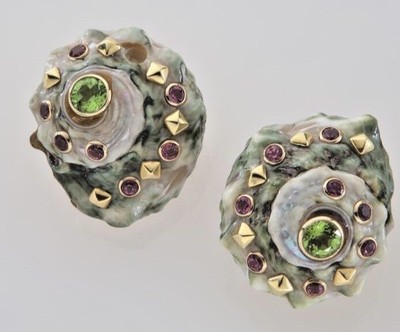 Trianon RARE 14k Gold Gemstone Shell Nautilus Designer Earrings