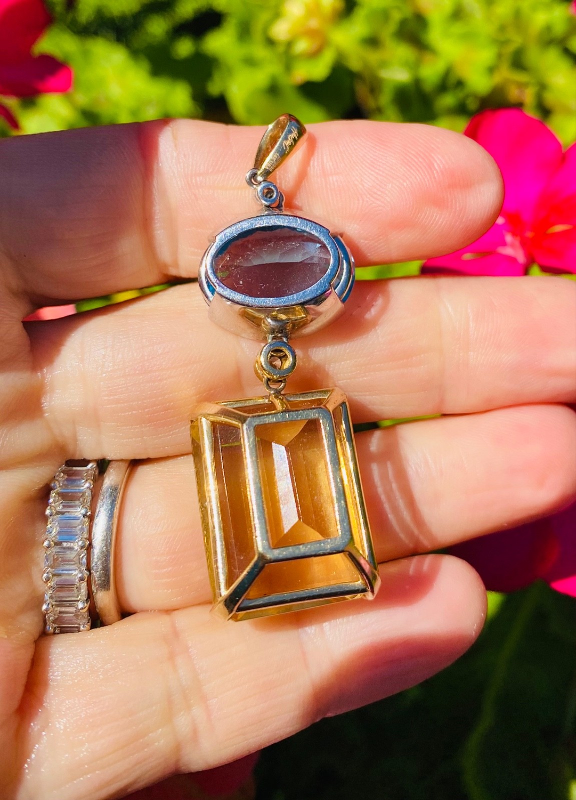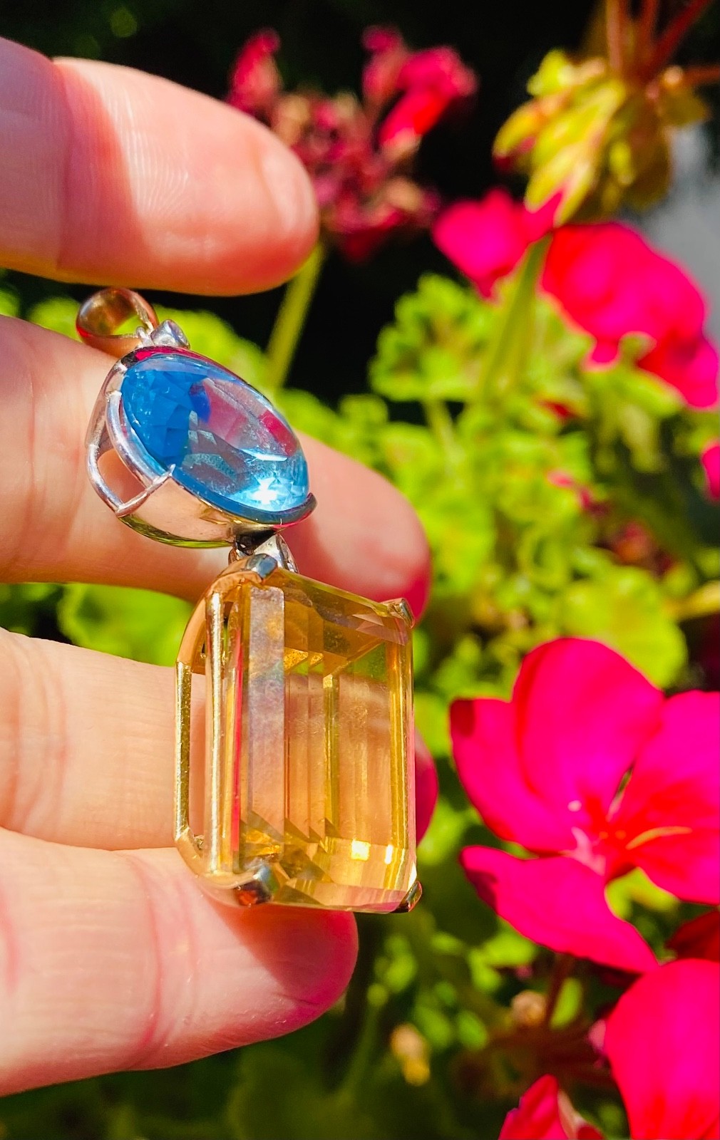 This impressive vintage designer necklace pendant is set in 14k white & yellow gold. The piece features a stunning oval cut blue topaz gemstone measuring approximately 19mm x 18mm and a large emerald cut citrine measuring 22mm x 17mm. Both gemstones are of fine color saturation.