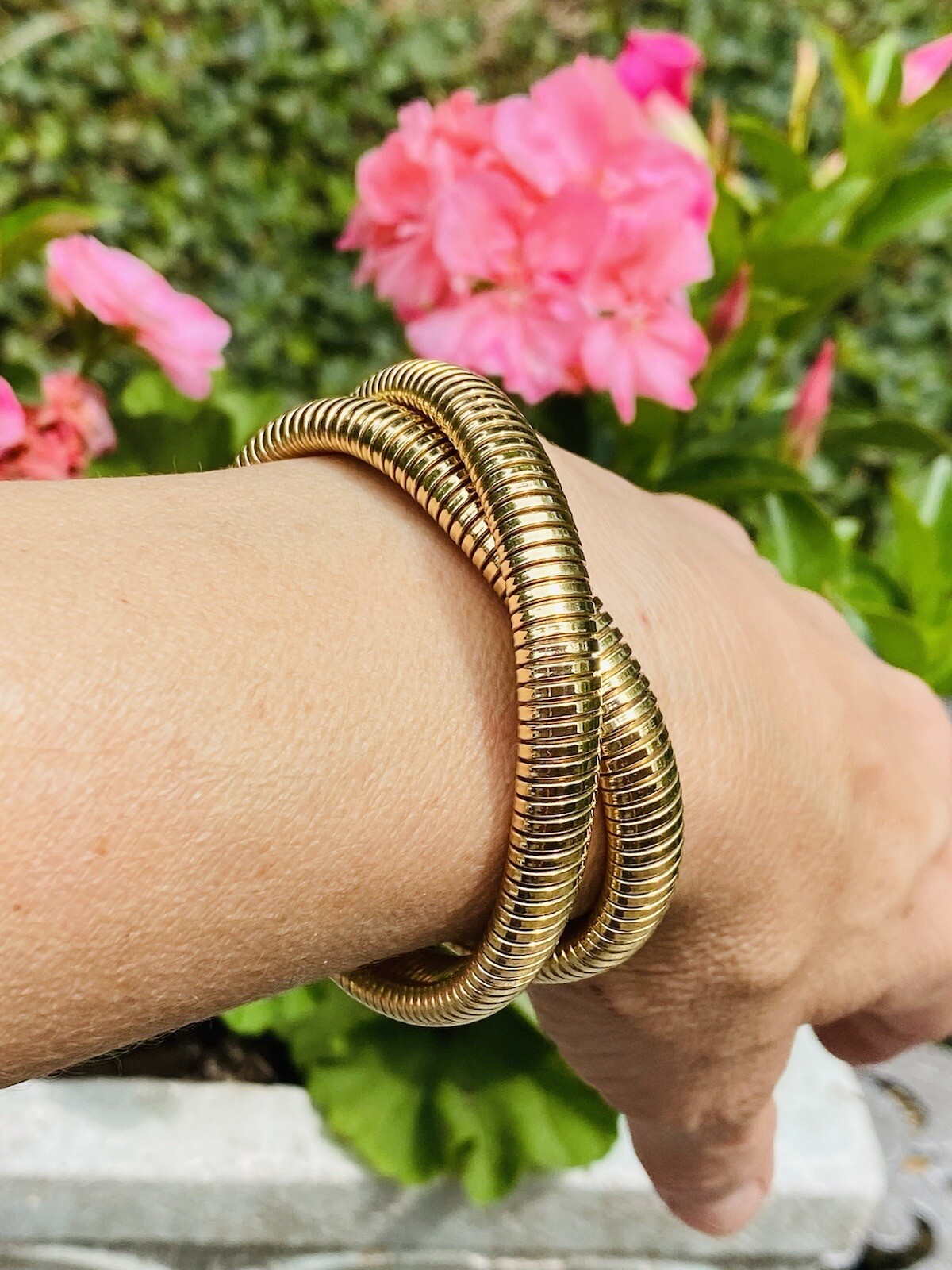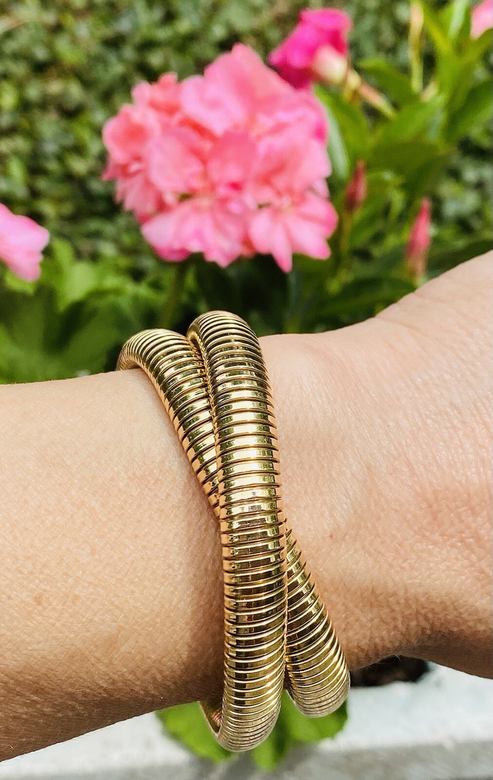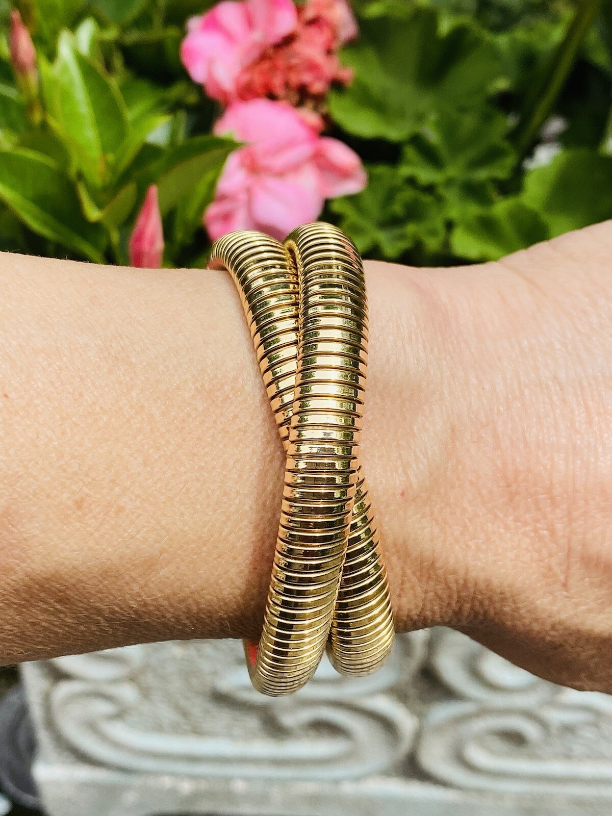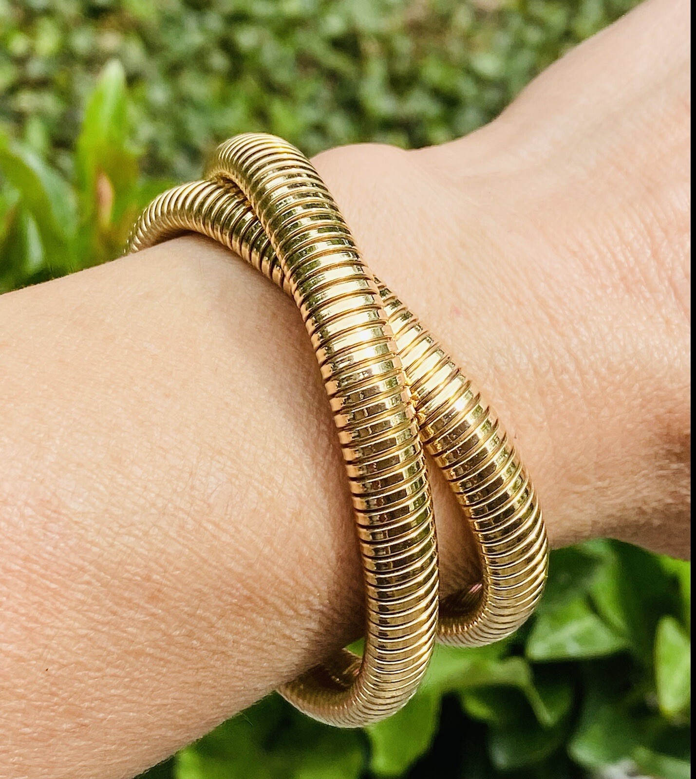 This impressive vintage piece consists of a flexible Tubogas style necklace/bracelet comprised of 62.7 grams of 14k yellow gold. The piece can work as a necklace or be converted to a rolling style bracelet as the current designer fashion of the movie stars. A stunning piece!