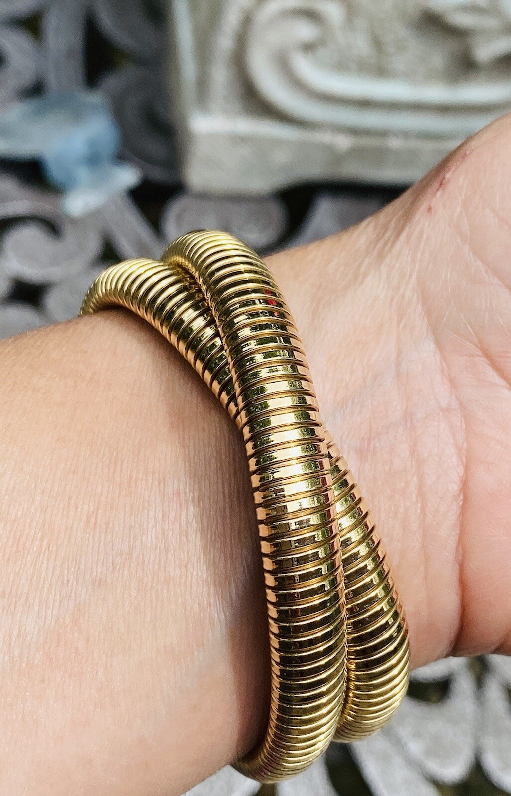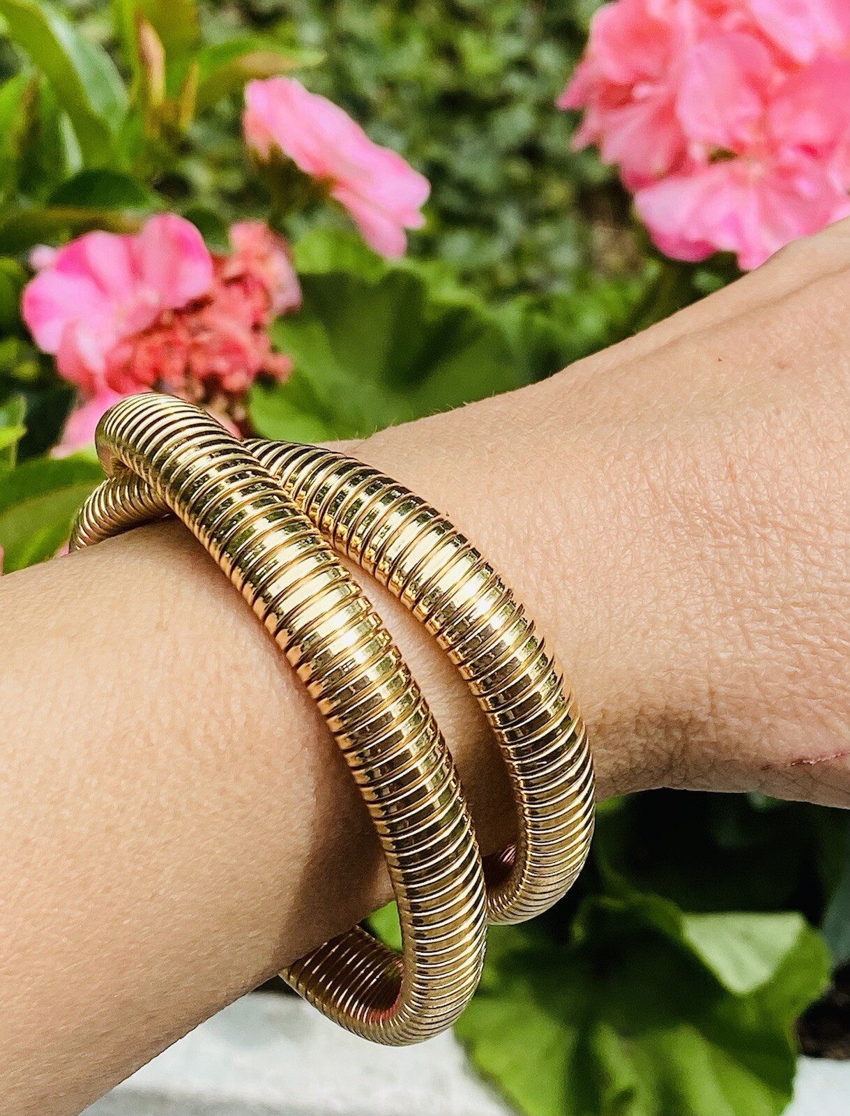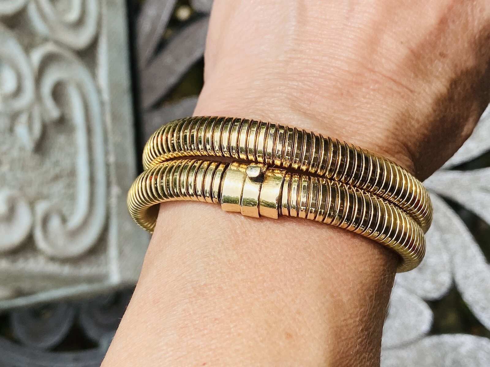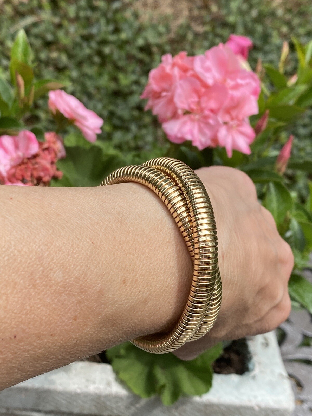 This impressive vintage piece consists of a flexible Tubogas style necklace/bracelet comprised of 62.7 grams of 14k yellow gold. The piece can work as a necklace or be converted to a rolling style bracelet as the current designer fashion of the movie stars. A stunning piece!
