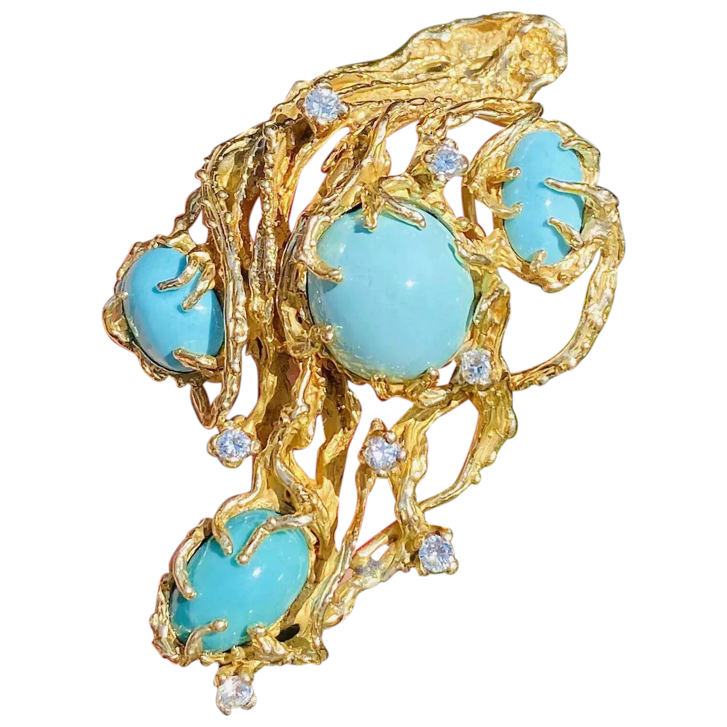 Vintage Brutalist Freeform 1960s 1970s 14k Gold Diamond Turquoise Pendant Brooch