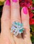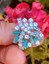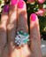 This impressive cluster ring is set in 18k white gold featuring a beautiful spray of white fiery