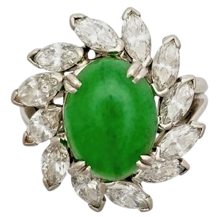 Vintage Deco 1950s Platinum E F VVS Diamond Natural Jadeite Jade Cocktail Ring