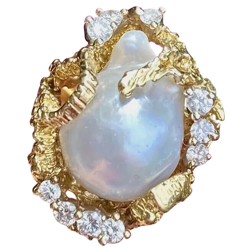 Vintage Heavy 1960s Retro 18k Gold Freeform Baroque South Sea Pearl Diamond Ring