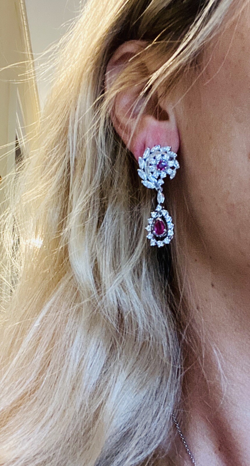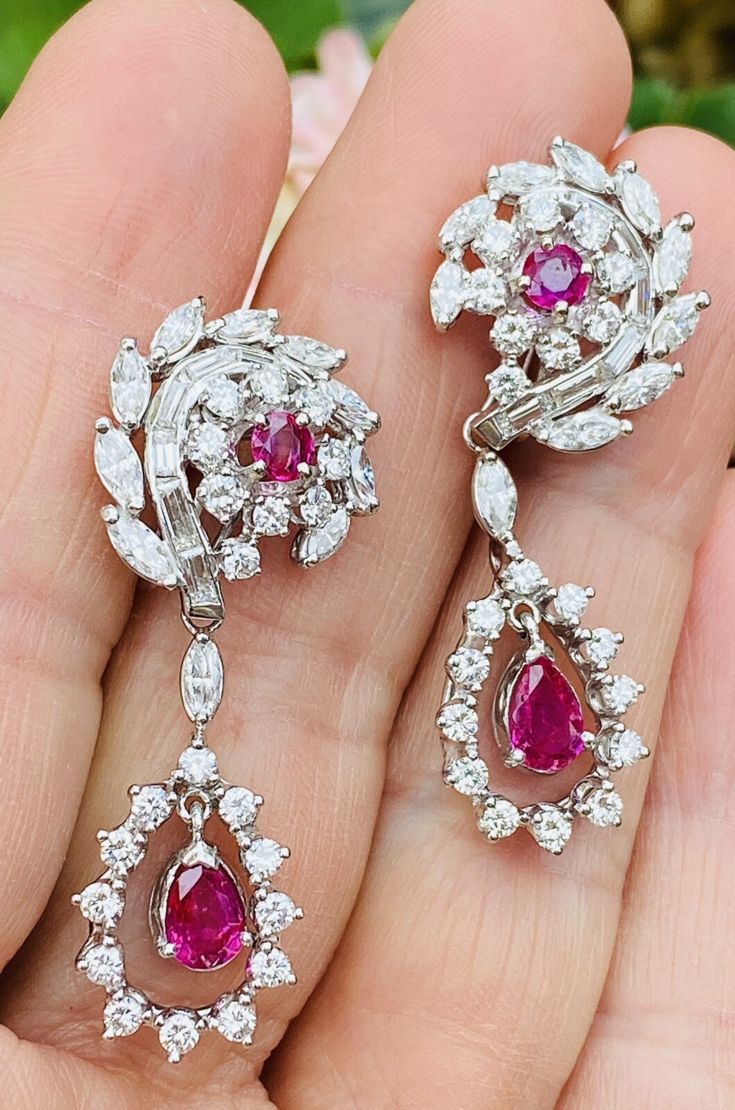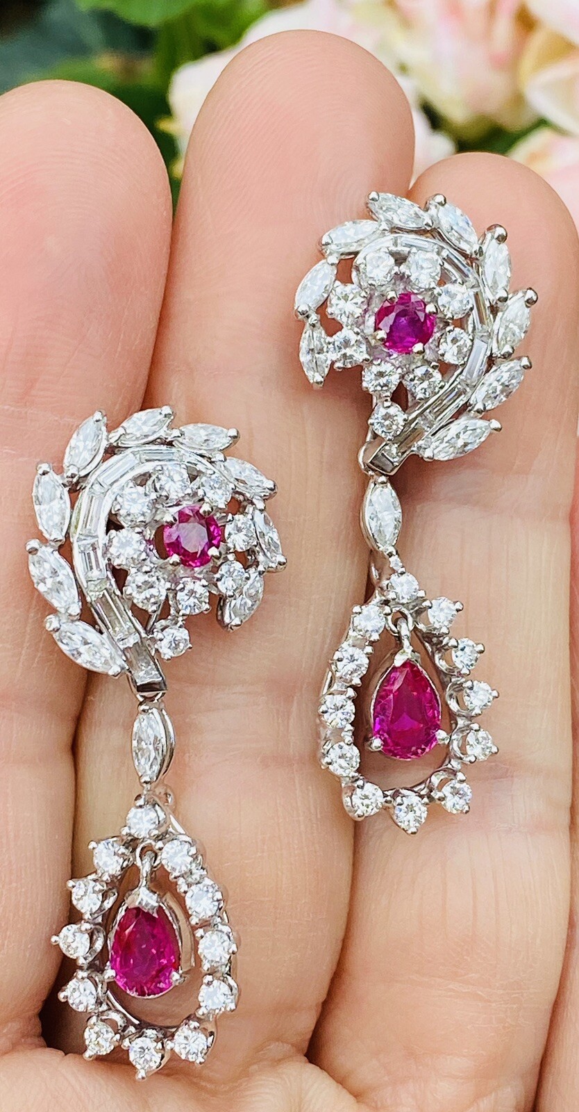 Each earring features two lively red-pink pear shaped and two round brilliant cut natural rubies that weigh about 1.50 carats in total. The rubies are further accented with 12 baguette diamonds (0.60 carats), 20 marquise diamonds (1.40 carats) and 42 round brilliant cut diamonds (1.50 carats). The total diamond weight is 3.50 carats and with rubies, total gemstone weight is 5.00 carats. All diamonds are of outstanding quality - F/G color and VS1 clarity.