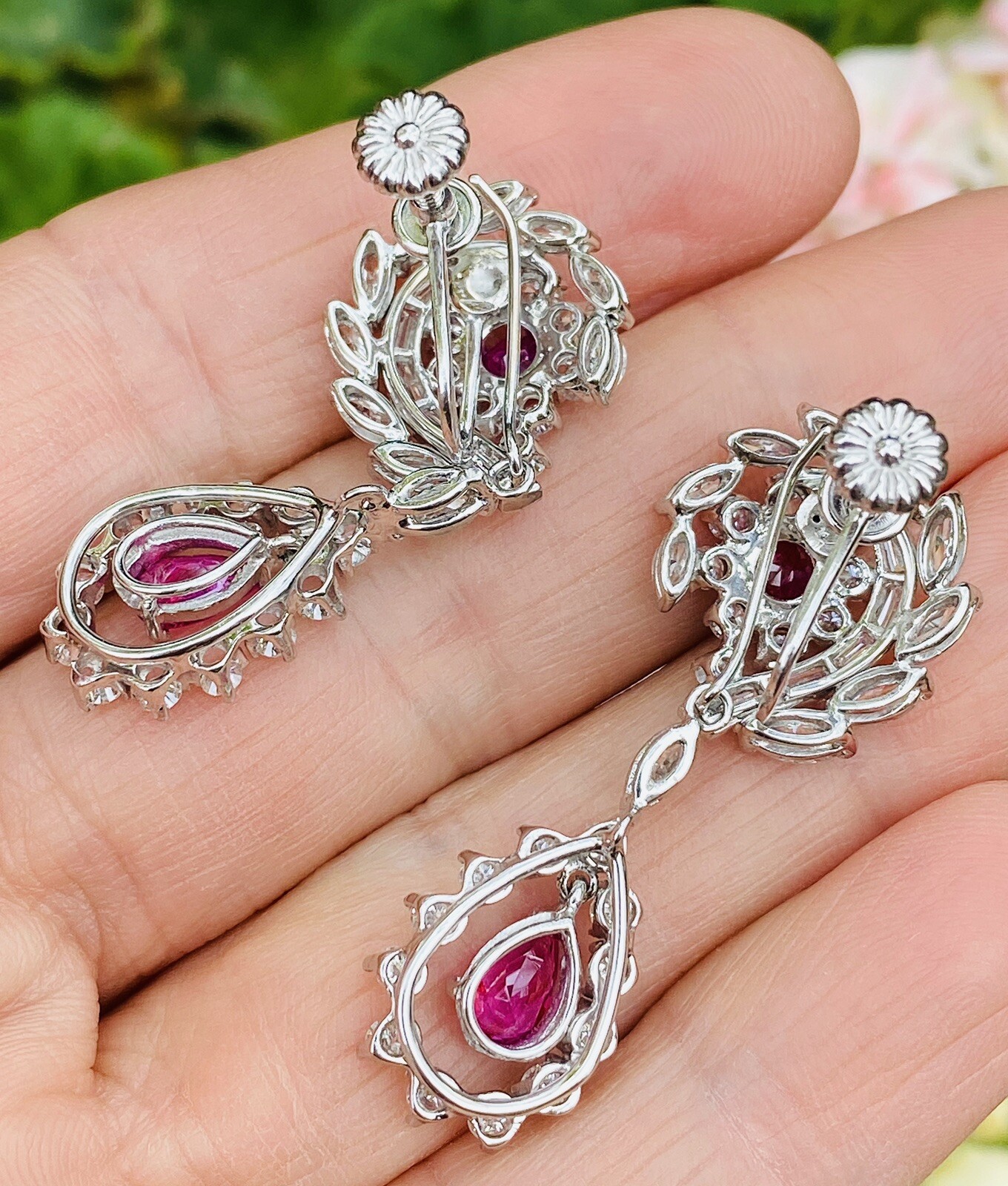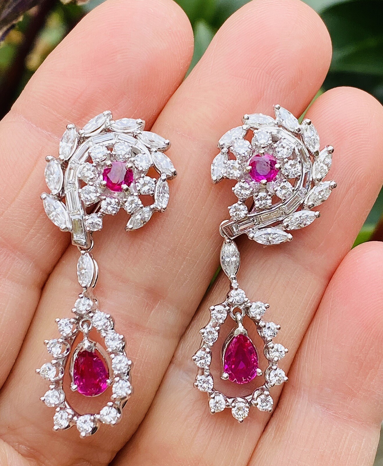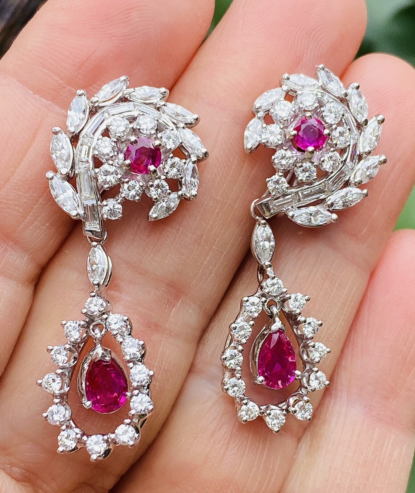 Each earring features two lively red-pink pear shaped and two round brilliant cut natural rubies that weigh about 1.50 carats in total. The rubies are further accented with 12 baguette diamonds (0.60 carats), 20 marquise diamonds (1.40 carats) and 42 round brilliant cut diamonds (1.50 carats). The total diamond weight is 3.50 carats and with rubies, total gemstone weight is 5.00 carats. All diamonds are of outstanding quality - F/G color and VS1 clarity.
