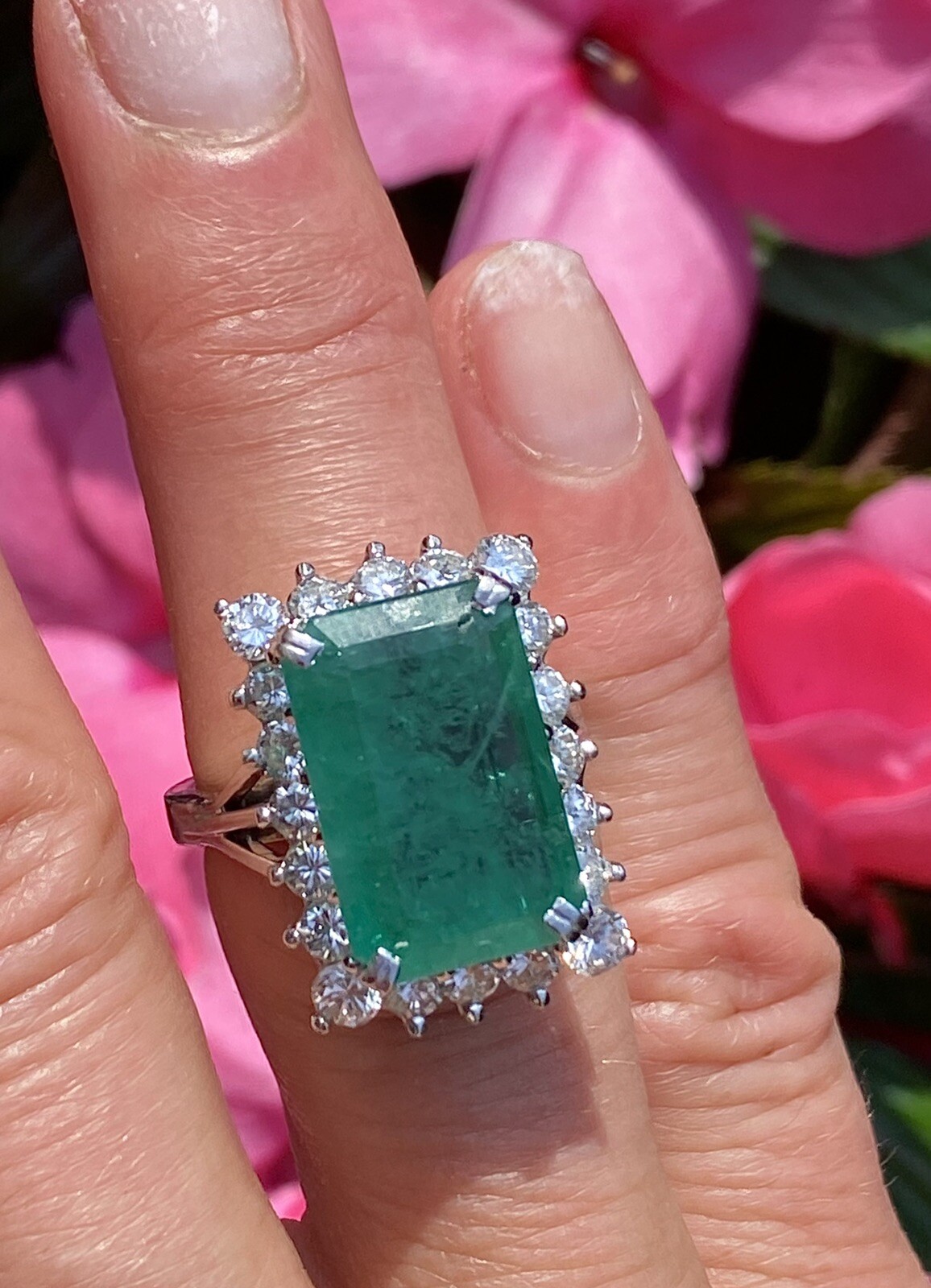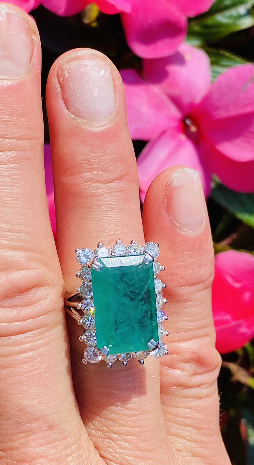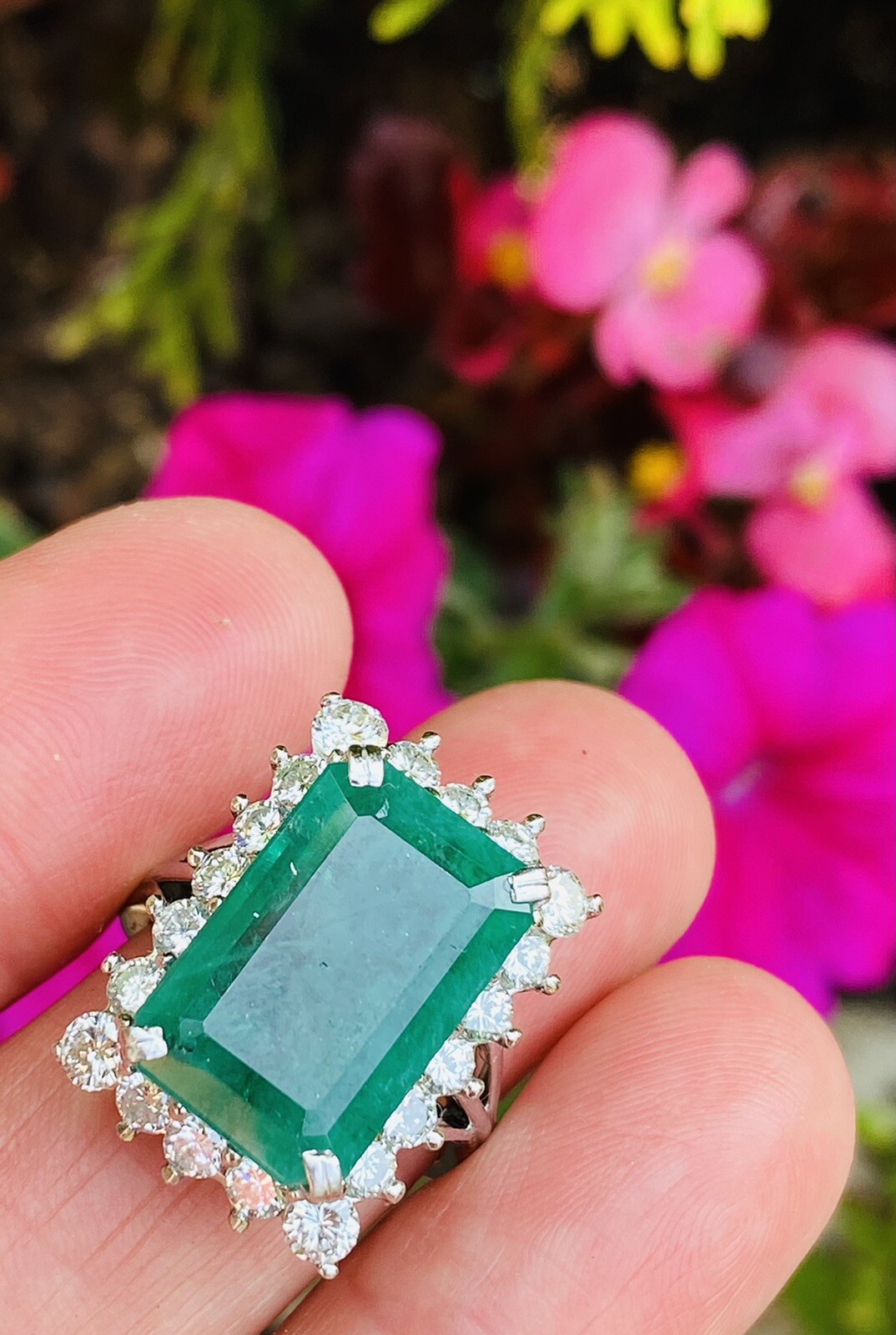 Vintage 1950s Estate 8.20ct Emerald Diamond Halo Cocktail Ring