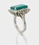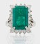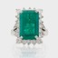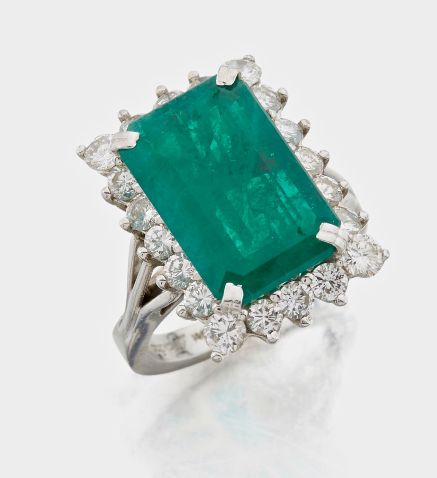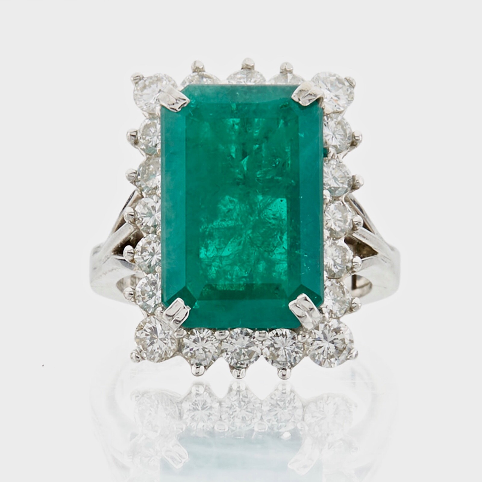 This impressive vintage 1950s estate ring is set in 14k white gold centering an emerald-cut emerald weighing approximately 6.50 carats, surrounded by round brilliant-cut diamonds.  The estimated total diamond weight is 1.70 carats.