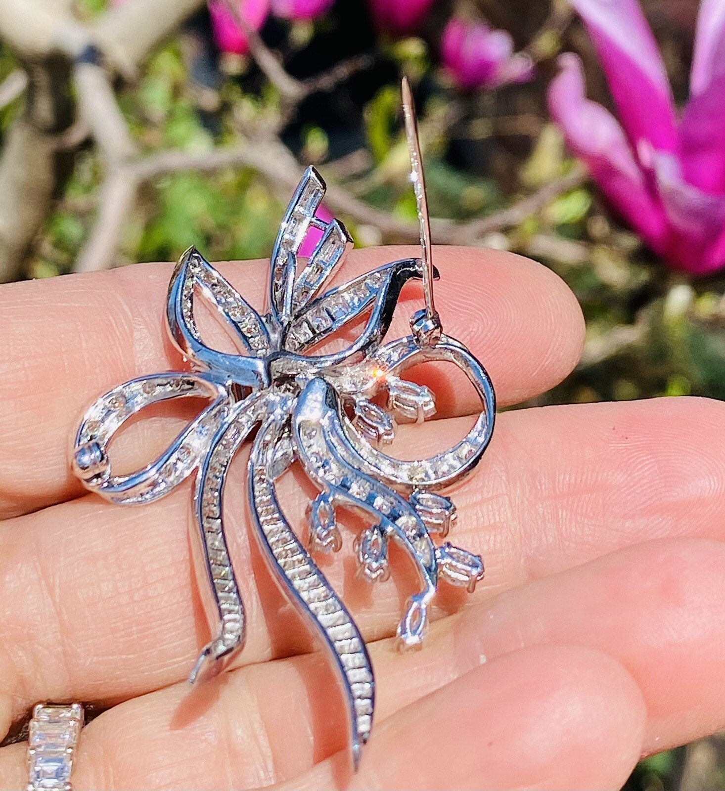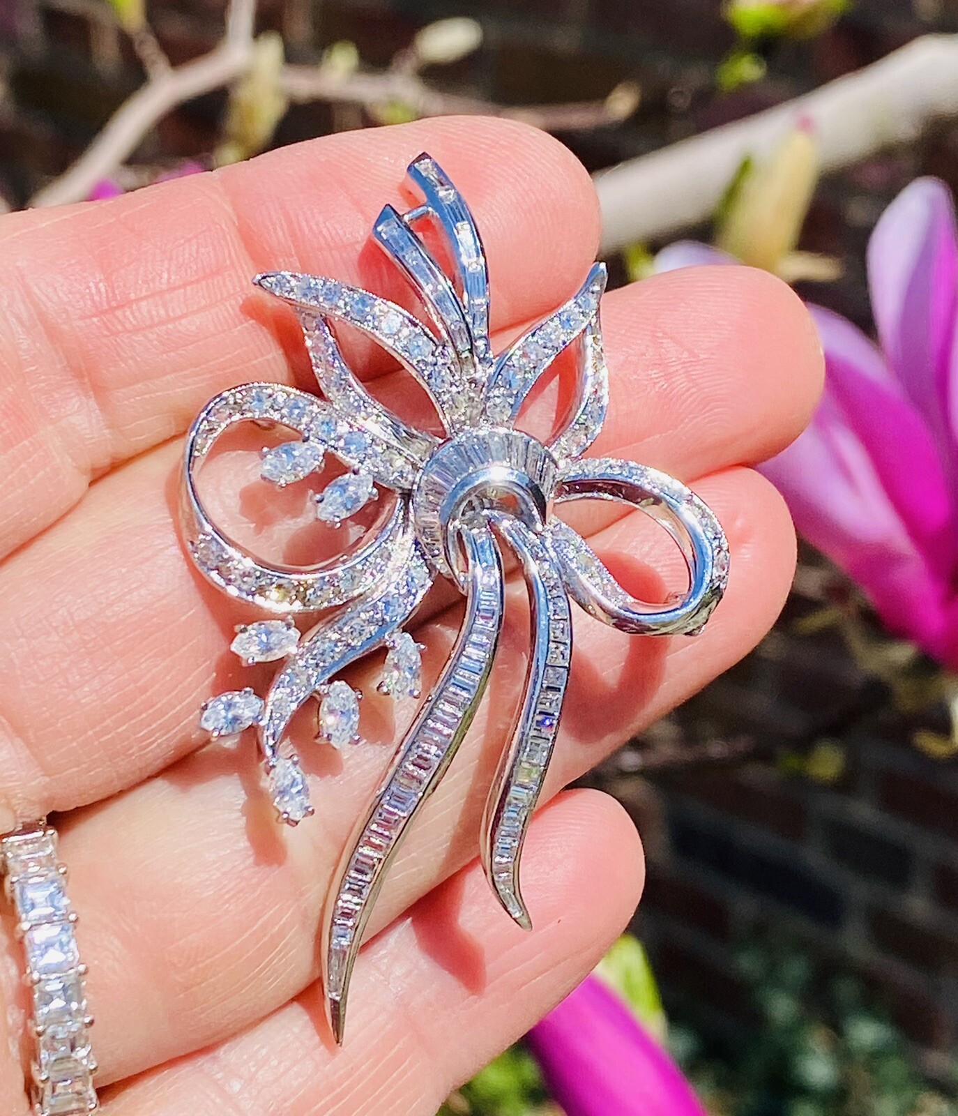 This stunning vintage 1950s estate piece is set in pure white platinum and features a beautiful array of marquise, baguette, single and brilliant cut diamonds. The total diamond weight is approximately 3.44 carats. The piece is set with a pin back and a pendant loupe for hanging on a necklace chain.