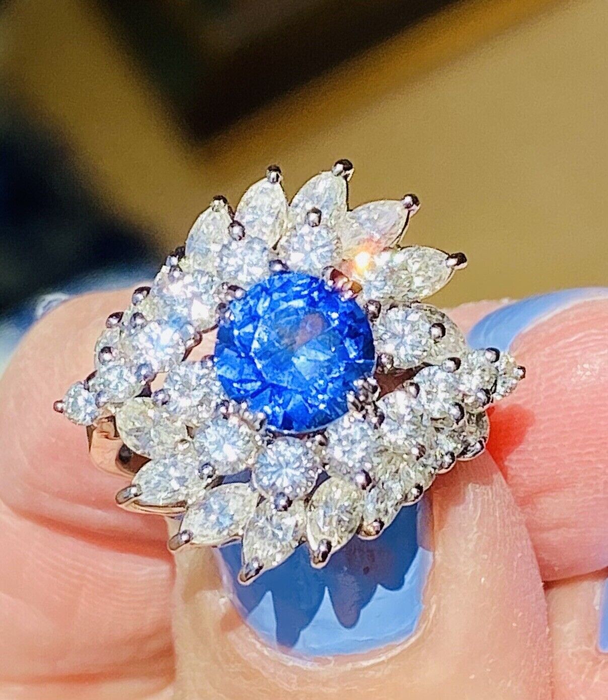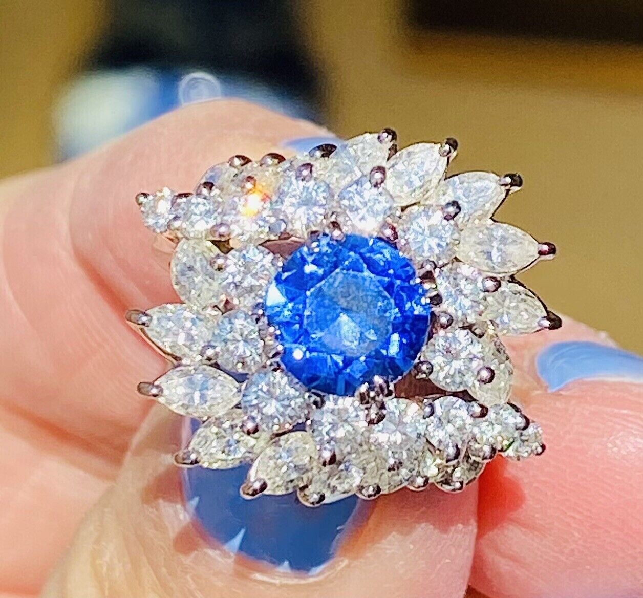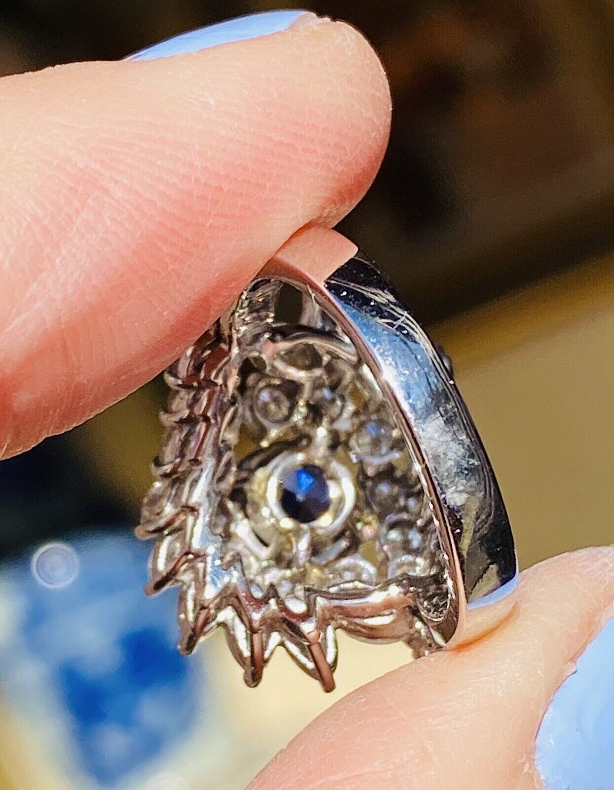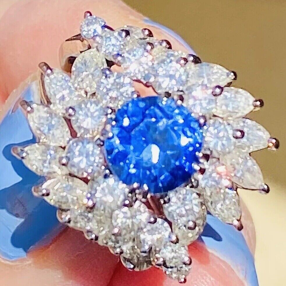 Vintage 1950s Platinum 5ct Blue Sapphire VS Diamond Cluster Cocktail Ring