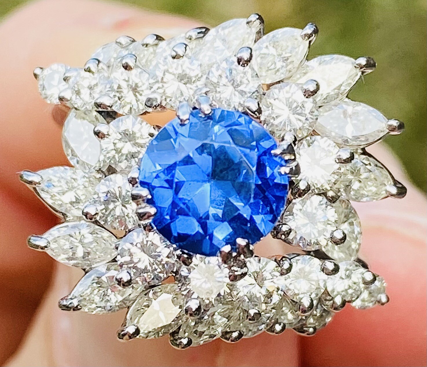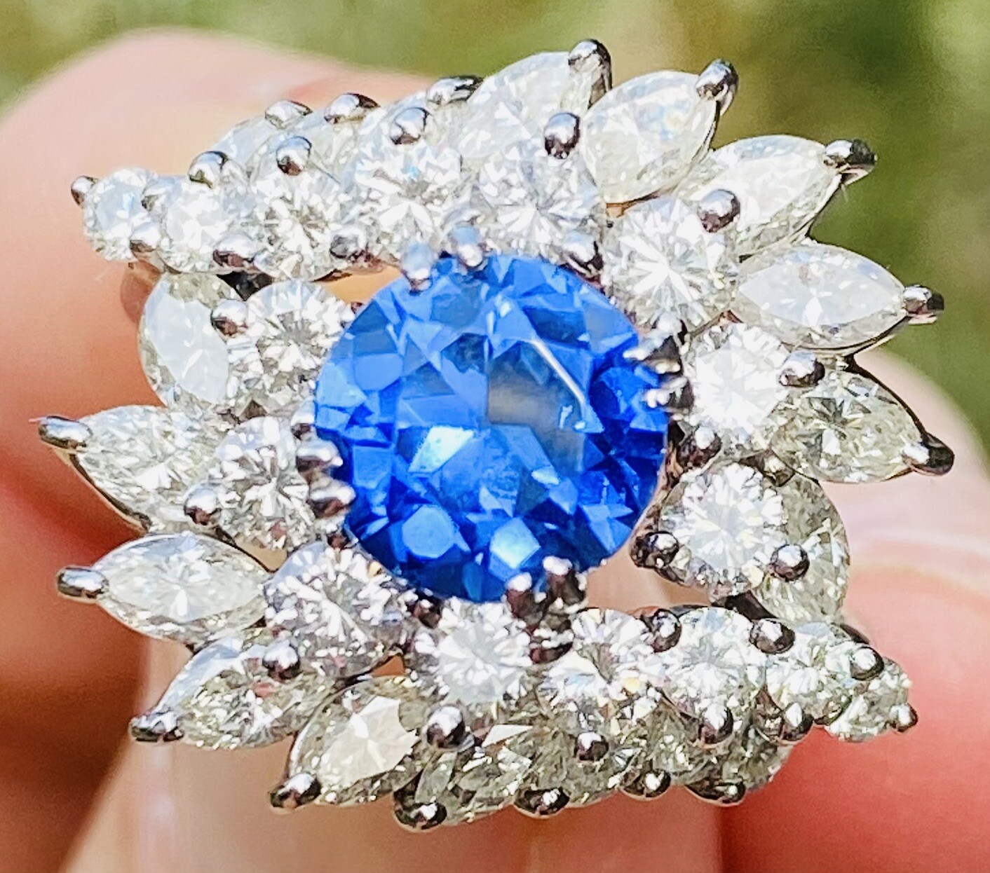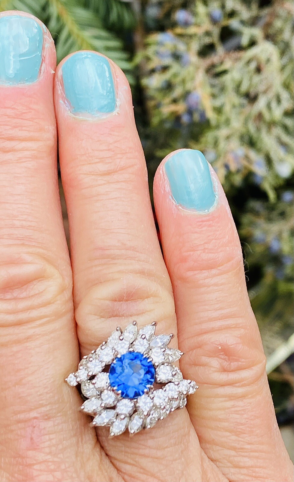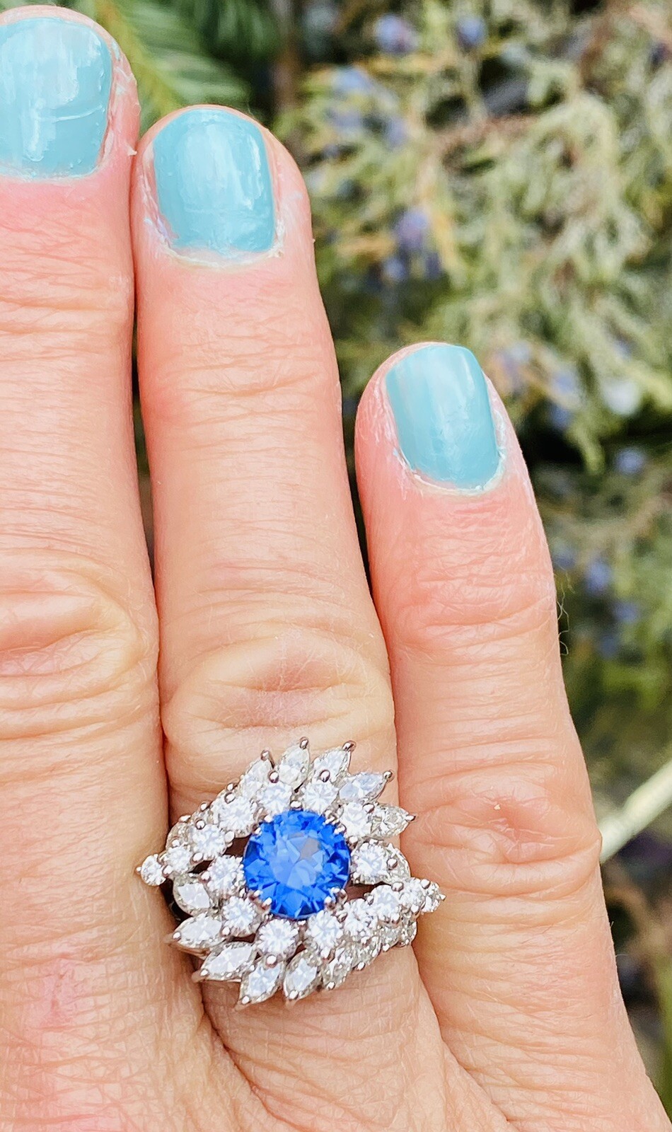 This beautiful midcentury vintage ring is set in pure platinum featuring a brilliant cut bright blue sapphire, the total estimated weight approximately 1.25 carats. The ring is further accented with fiery round brilliant and marquise cut diamonds, the total estimated diamond weight is approximately 3.76 carats.