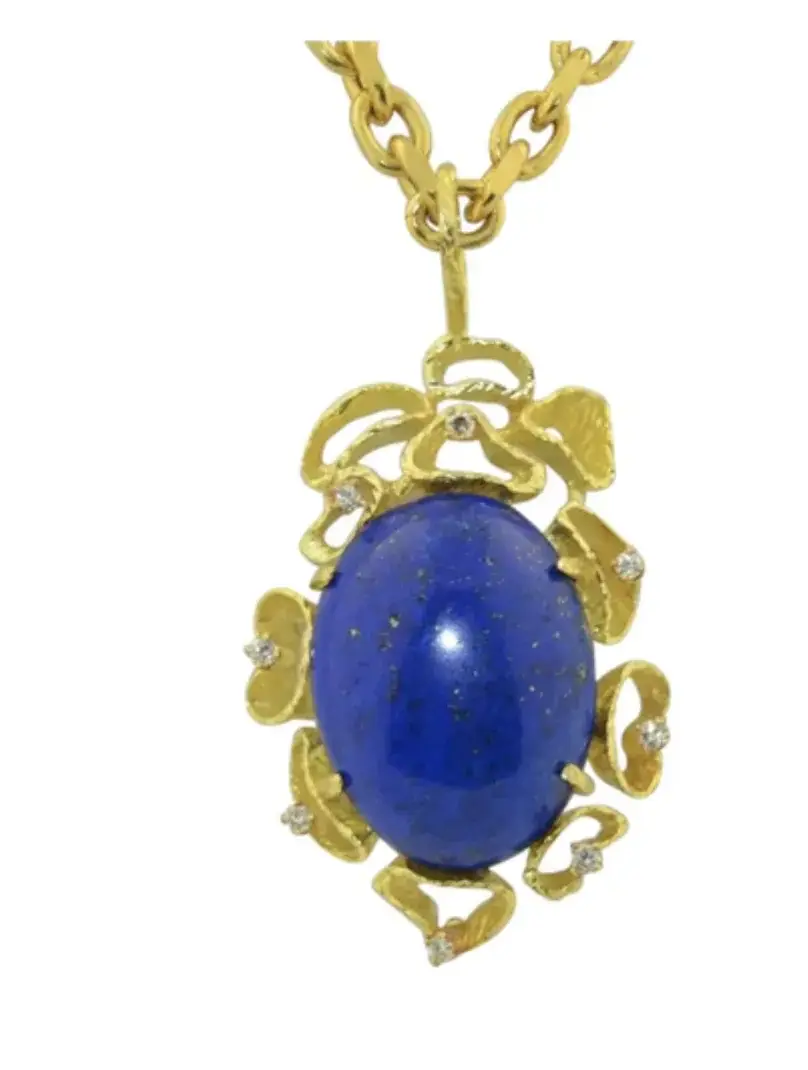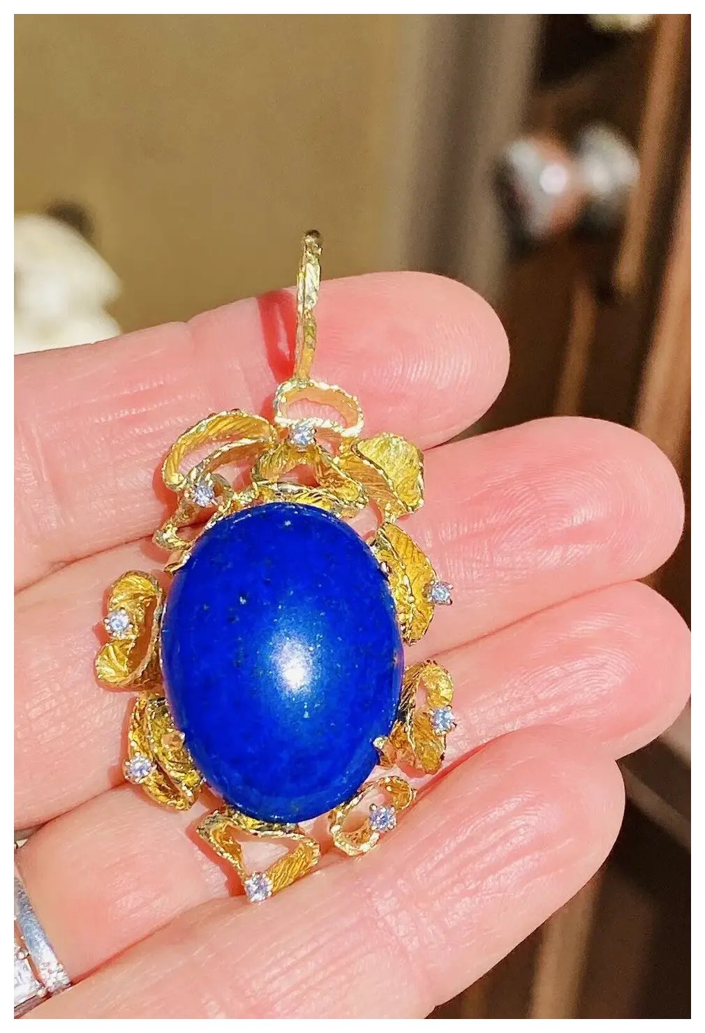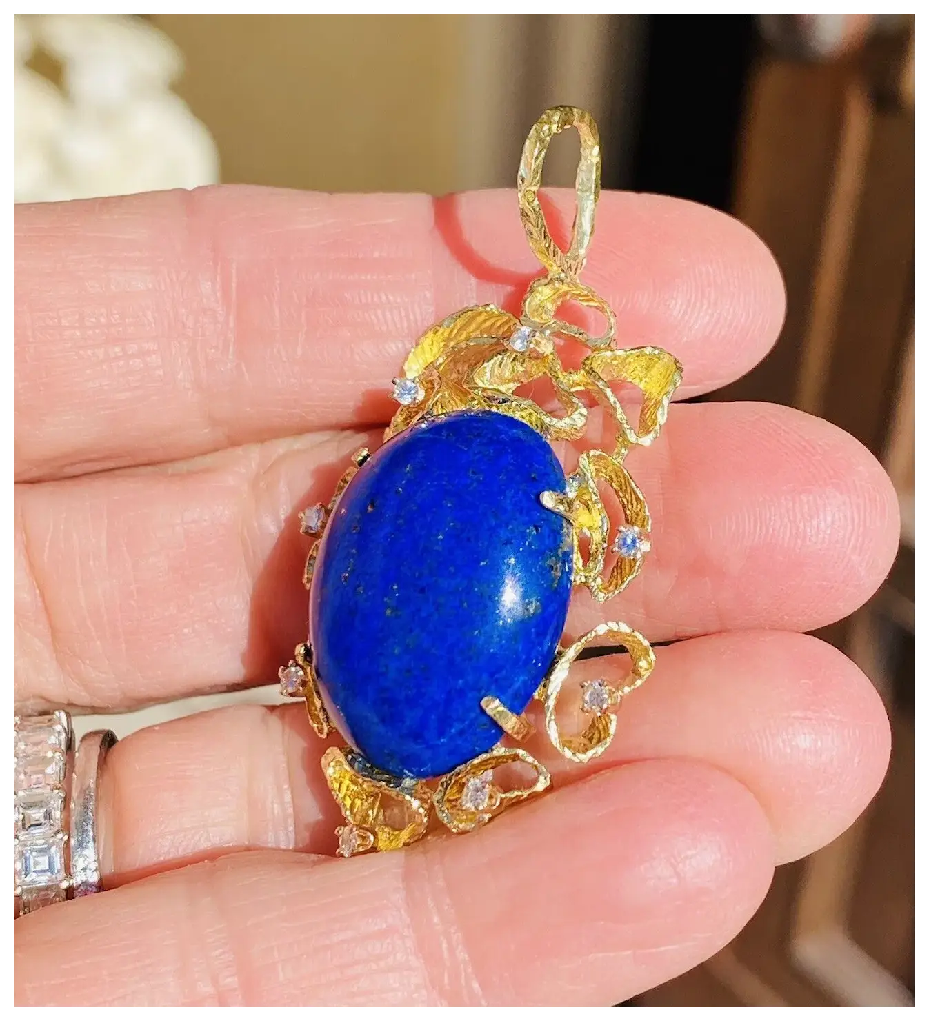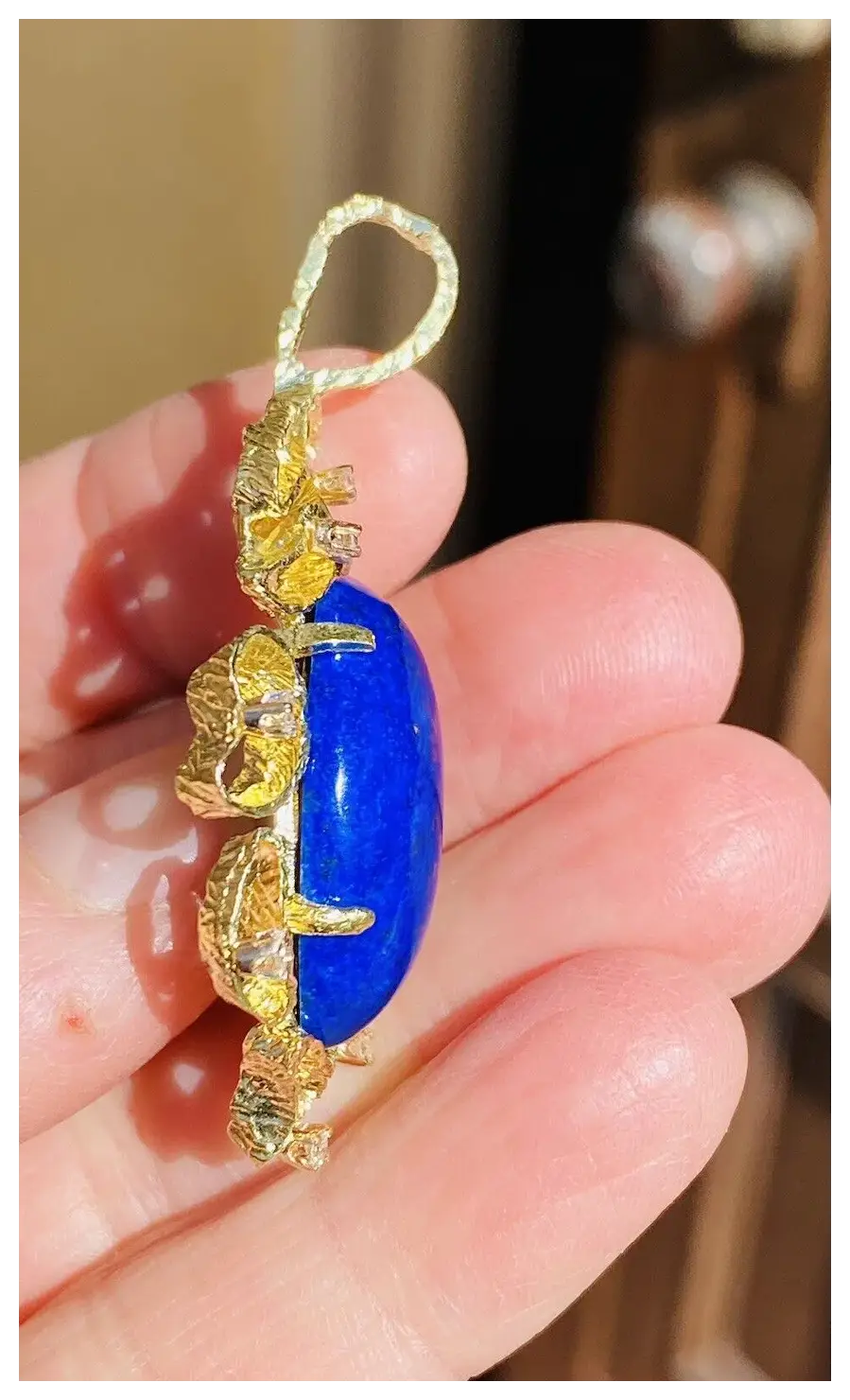 This beautiful vintage 1960s-1970s piece is set in rich 18k yellow gold with an ornate styled frame featuring a lovely large deep royal blue lapis lazuli cabochon gemstone measuring 25mm x 19.25mm and set with 8 brilliant cut small diamond accents. Total carat weight is approximately 0.18cts. The pendant is set with a large wide gold bail on the top.