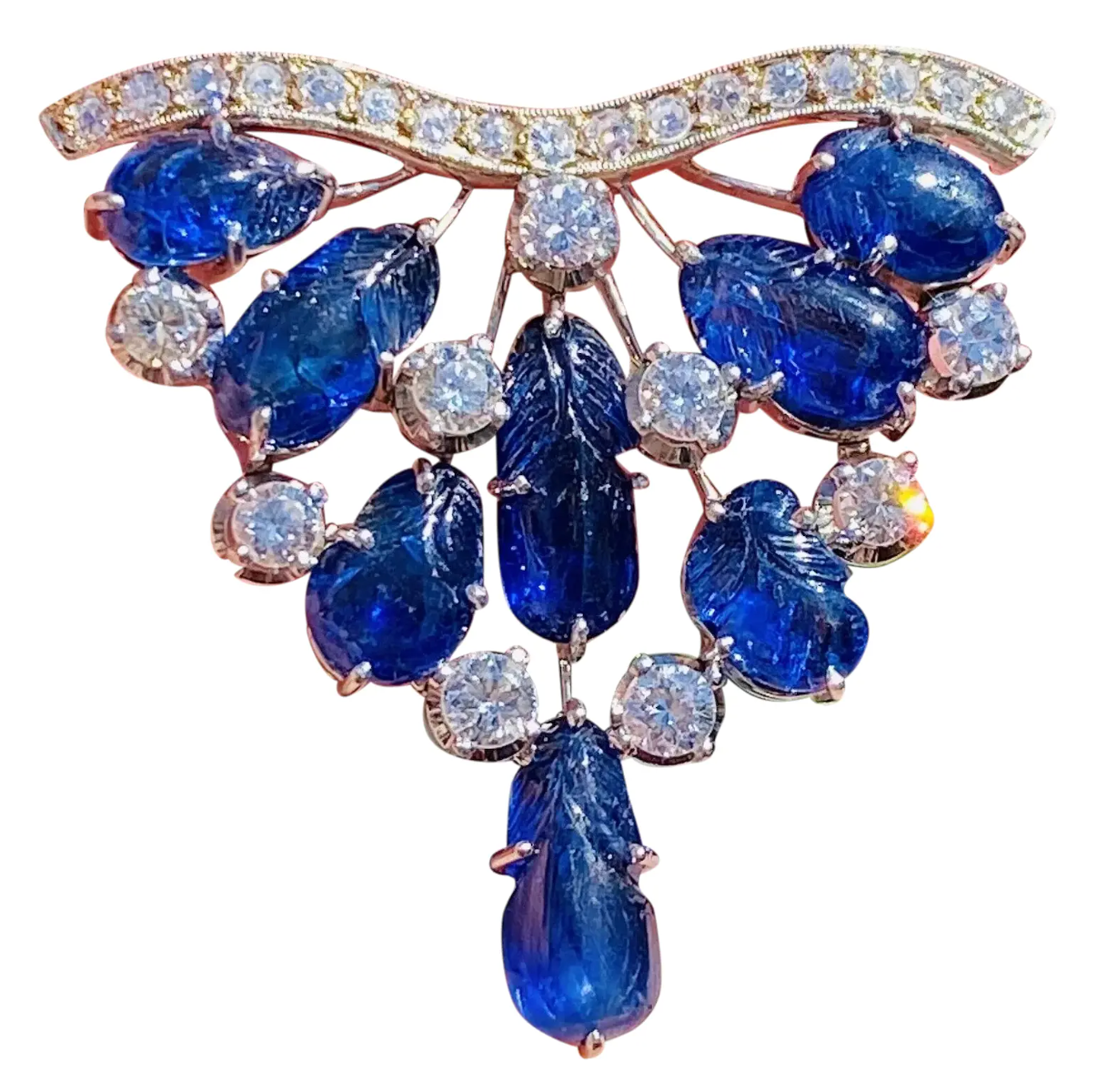 Vintage 1950s Platinum 7ct Carved Blue Sapphire VS Diamond Pendant