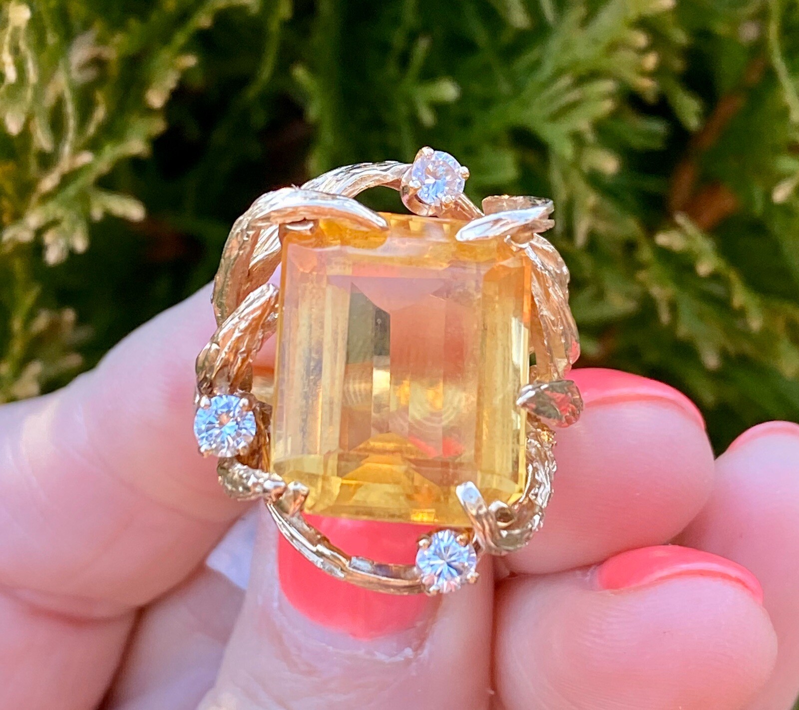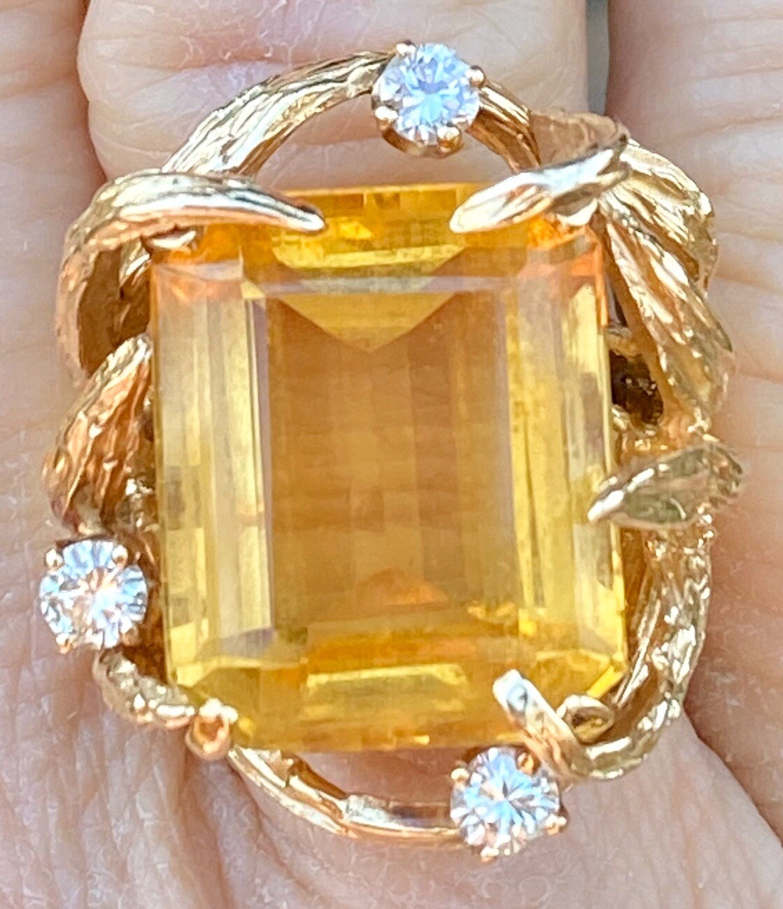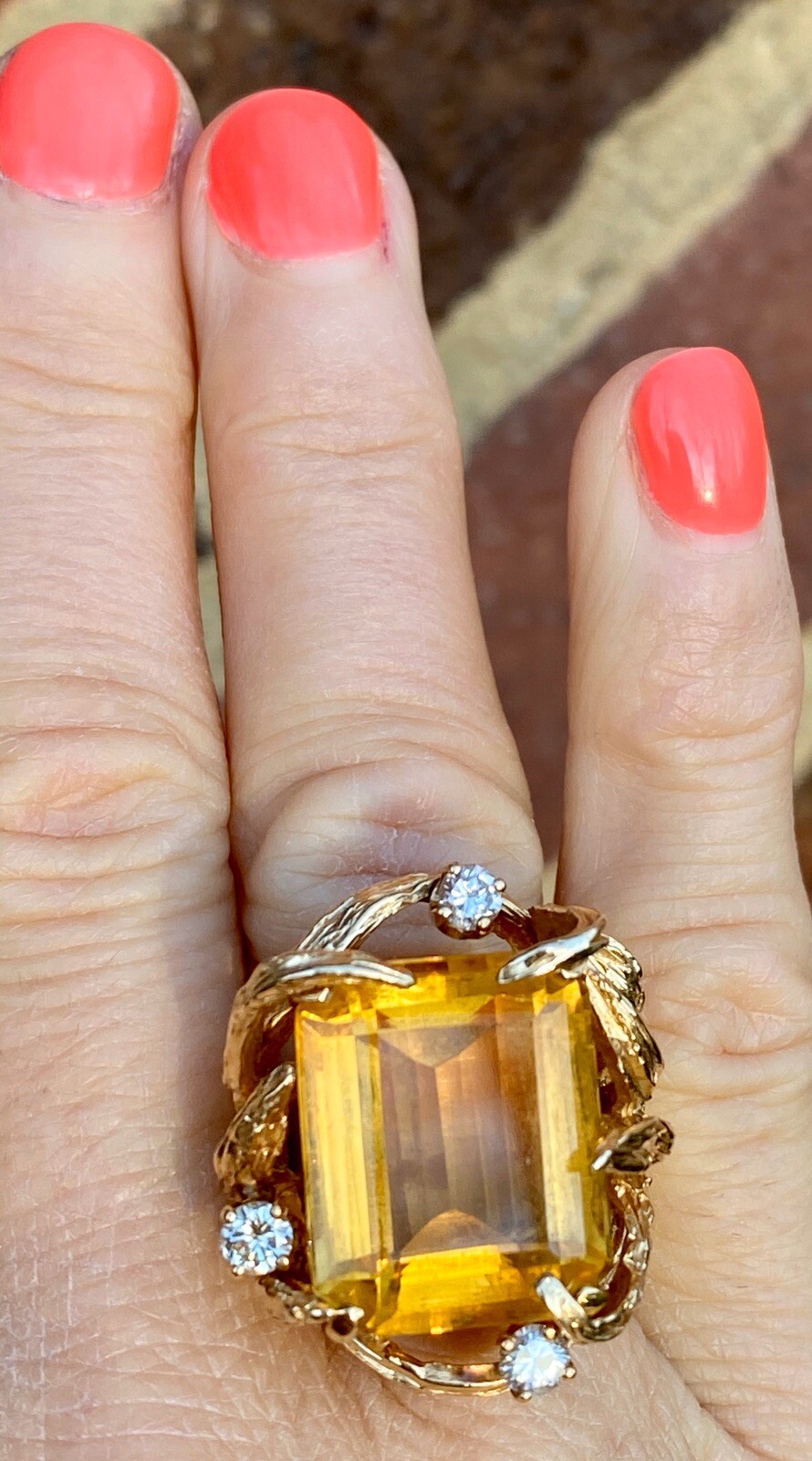 Vintage 1960s Estate Large Heavy 14K Gold Citrine Diamond Cocktail Ring