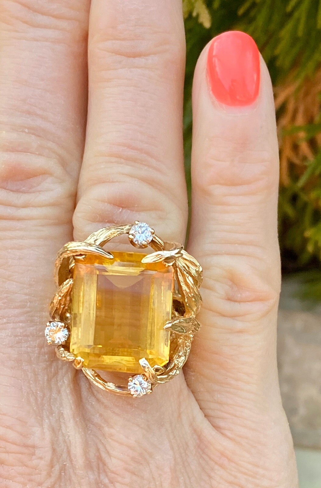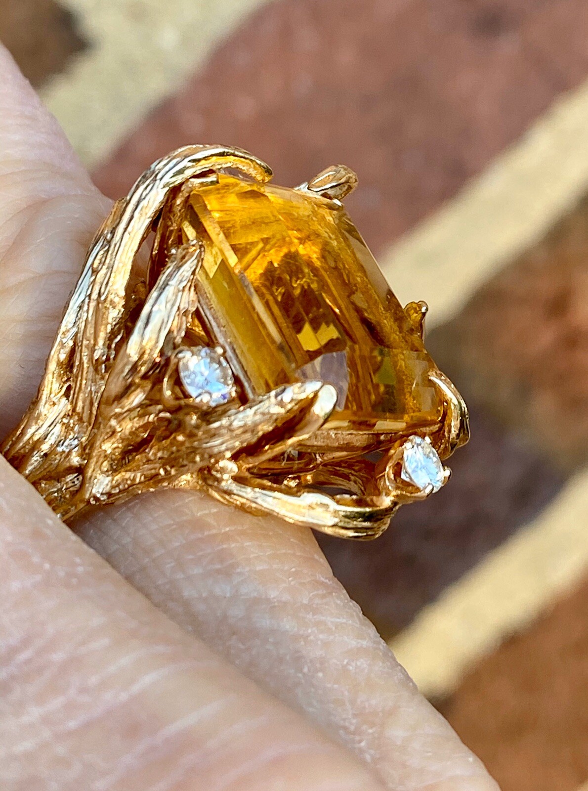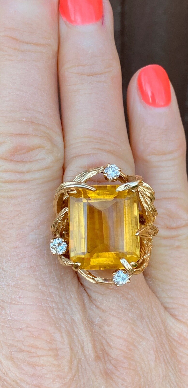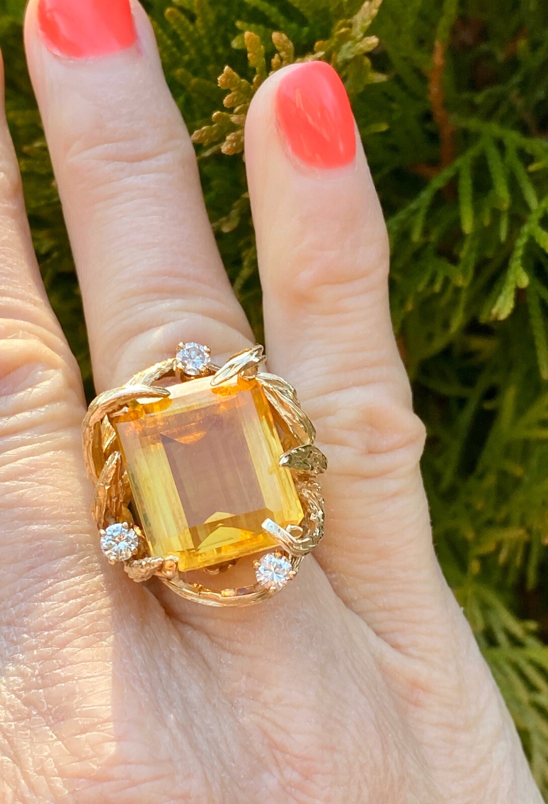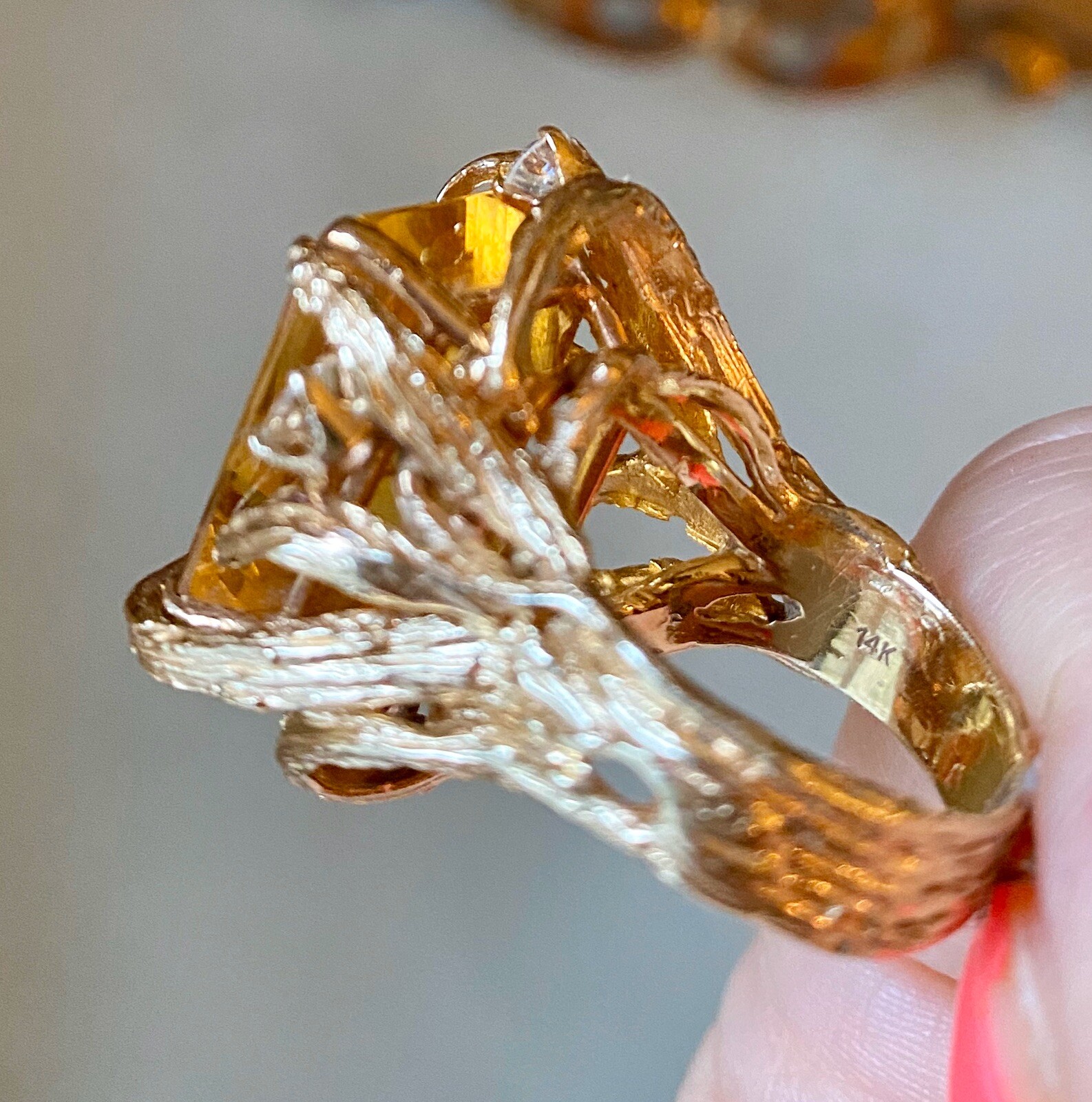 Large 14k Gold Heavy Vintage 1960s 1970s Freeform Organic Modernist Citrine Diamond Cocktail Ring