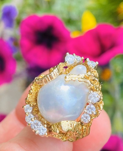 Vintage Heavy 1960s Retro 18k Gold Freeform Turquiose Pearl Diamond Ring