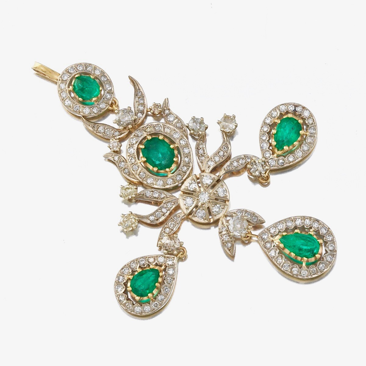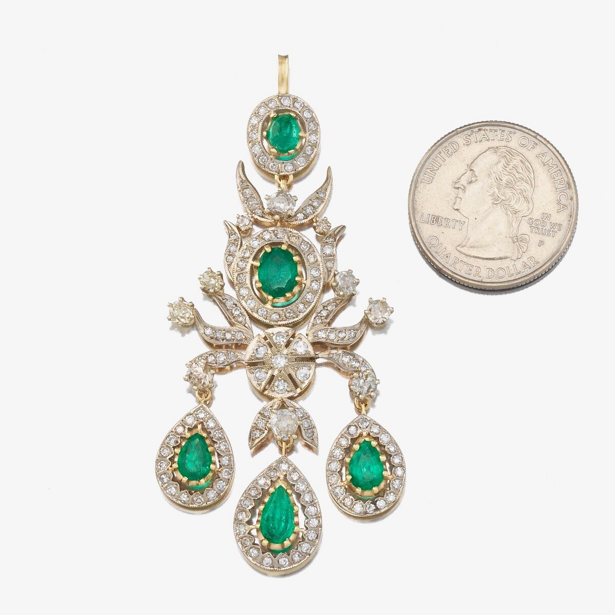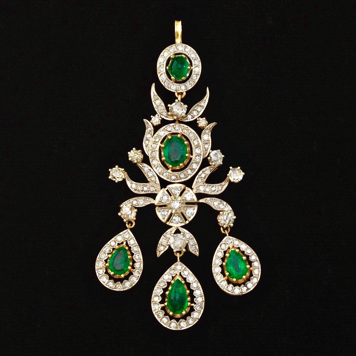 This impressive Art Deco antique girandole pendant features a setting of 14kt and 16kt golds in both white and yellow tones. The large pendant features 3.80 carats of lively green emeralds 2.25 carats of mine cut white diamonds and some brilliant and single cut diamonds of varying color range and clarity (H-I color range and SI1-2 clarity). In person the pendant is extremely lively and sparkling, fiery and twinkling, colorful and impressive!