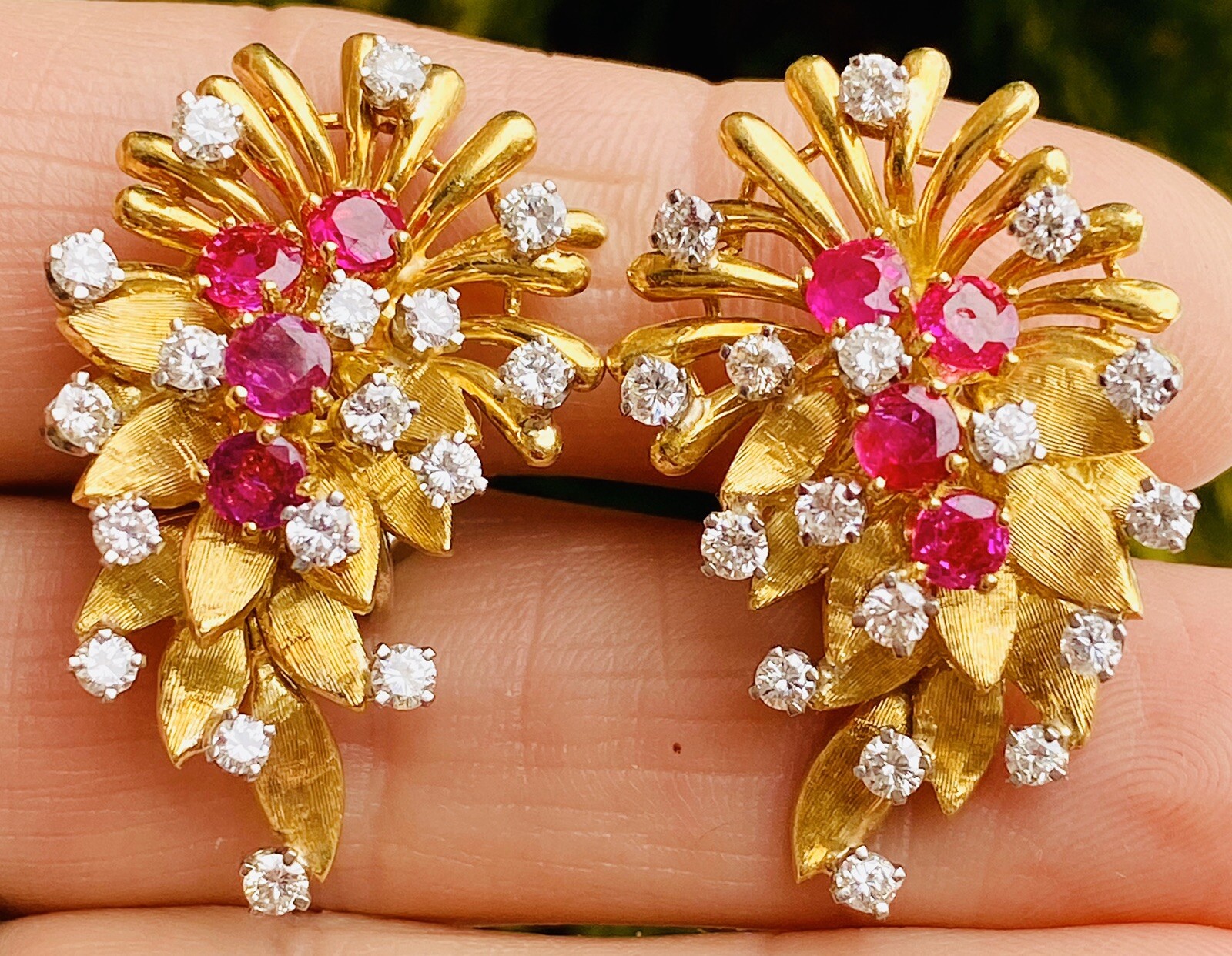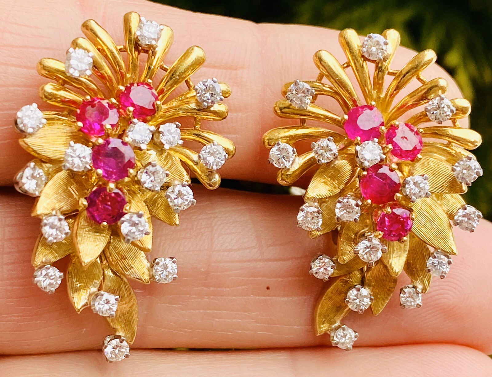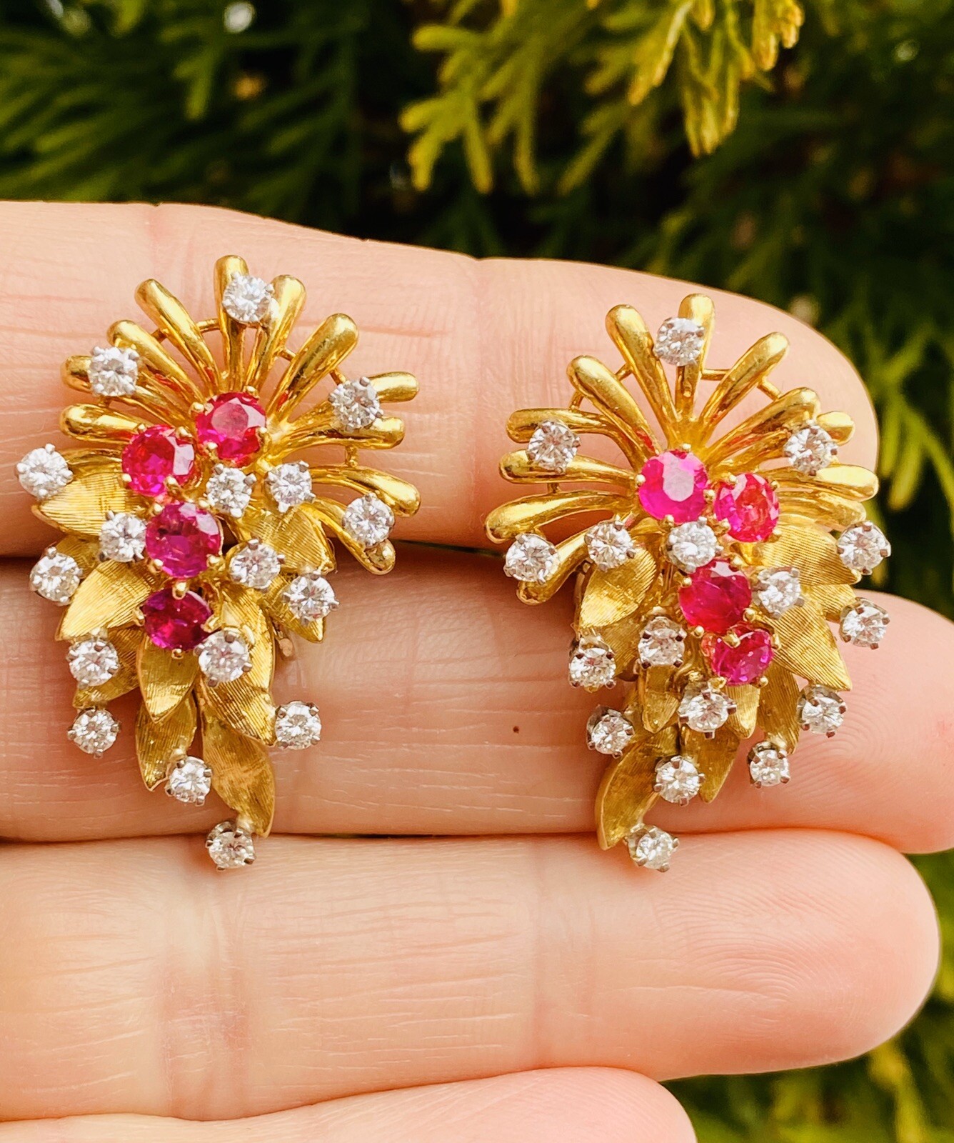 These stunning French designer earclip earrings are set in rich 18k yellow brushed gold with a stunning array of rubies and diamonds.  The earclips are designed as polished flares and cascading textured leaves, centering clusters of 8 round blood red rubies (totaling approximately 2.00 carats) and 34 round brilliant cut white VS diamonds in total, totaling approximately 1.50 carats) for both earrings.