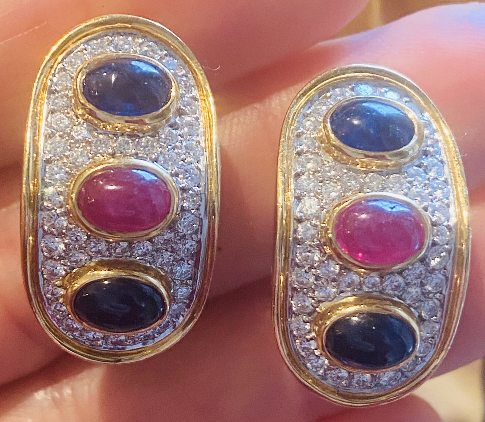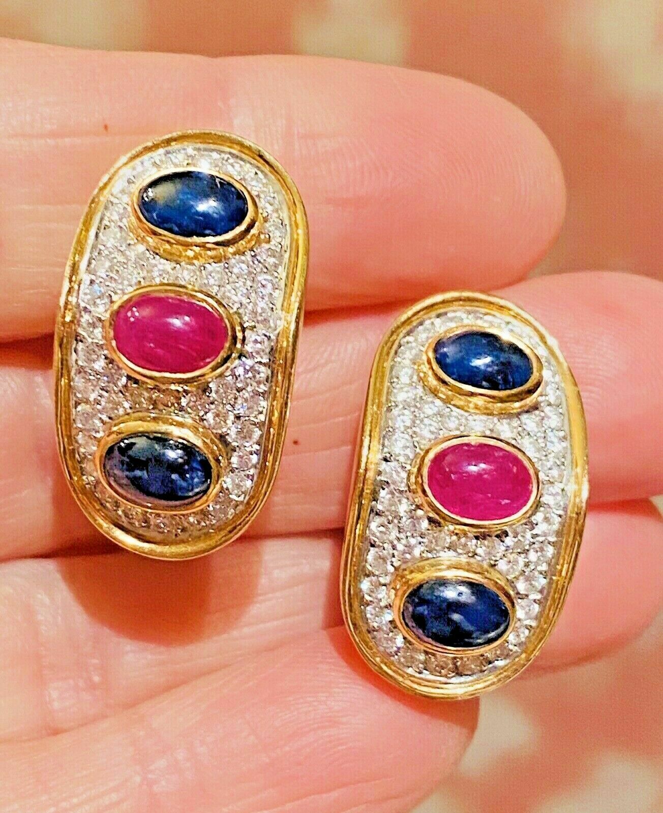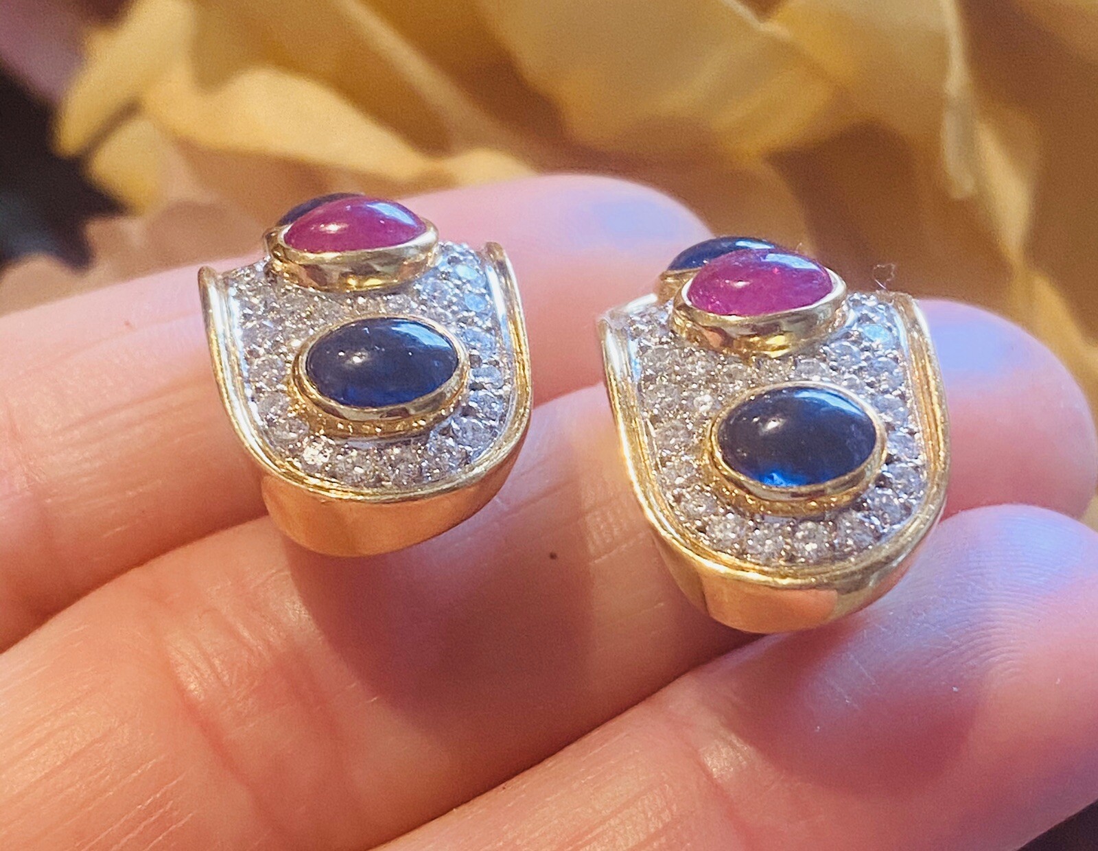 Vintage Estate 14k Gold 1.80ct VS Diamond Sapphire Ruby Cabachon Earrings