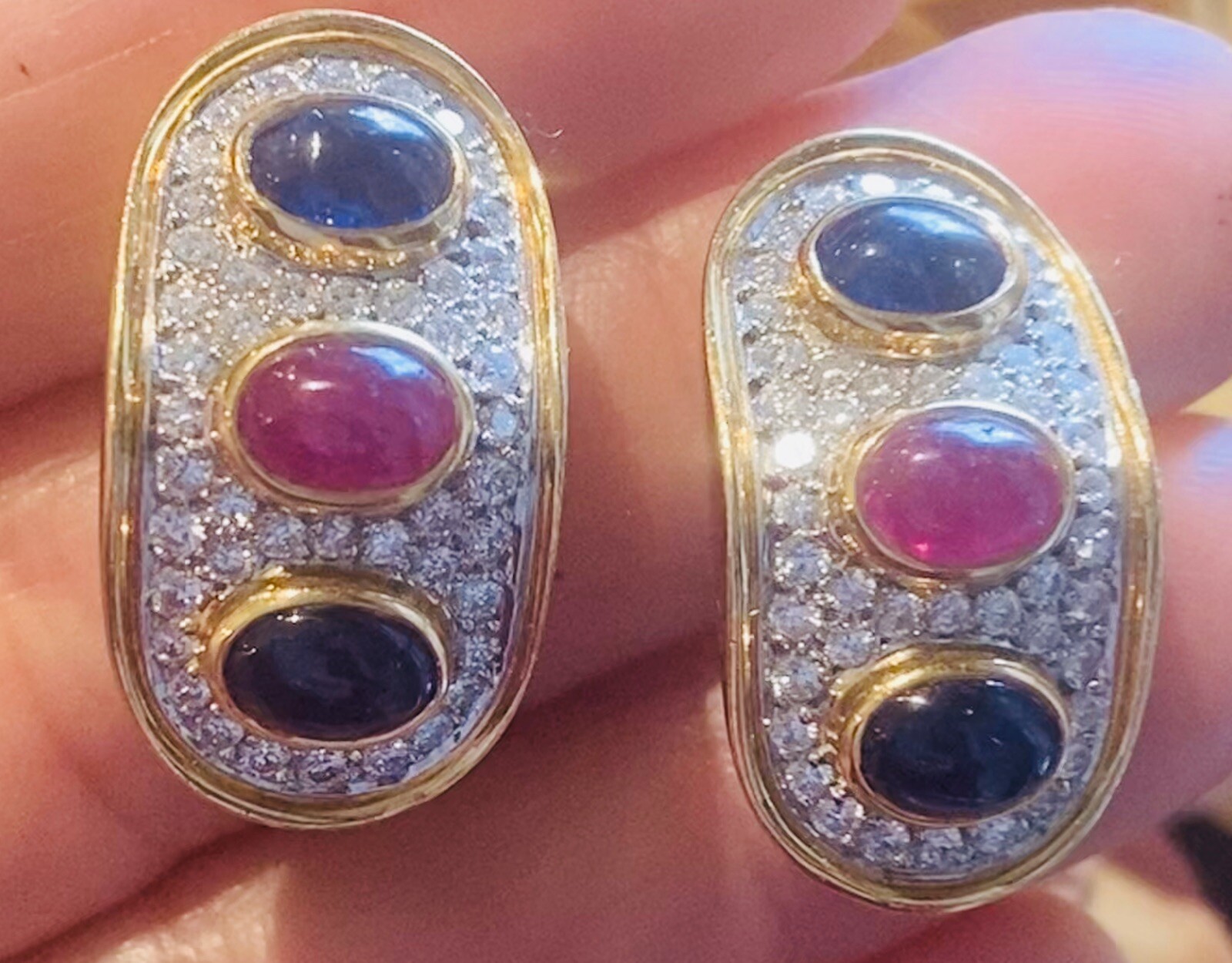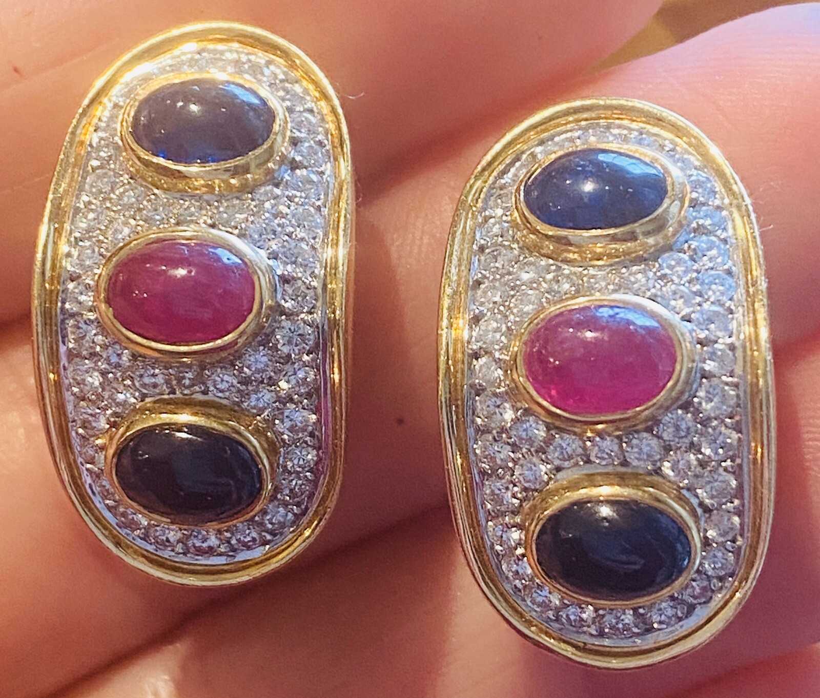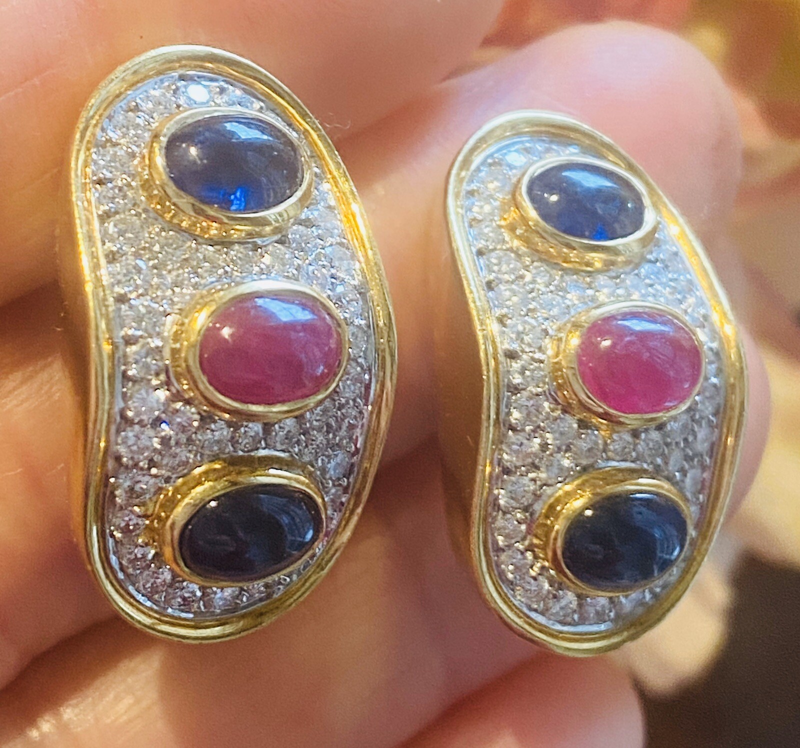 Vintage Estate 14k Gold 1.80ct VS Diamond Sapphire Ruby Cabachon Earrings