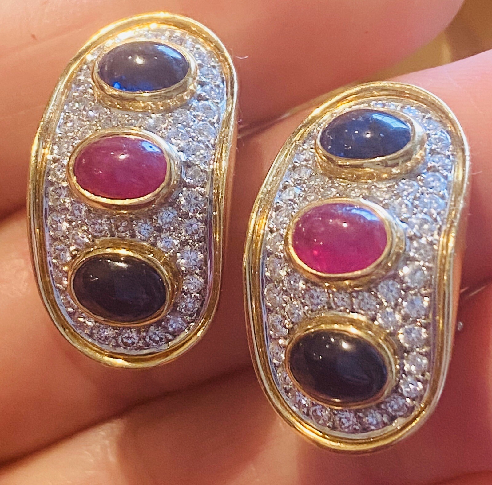 This stunning pair of two-color gold blue sapphire and ruby cabochon gemstone and diamond earclips