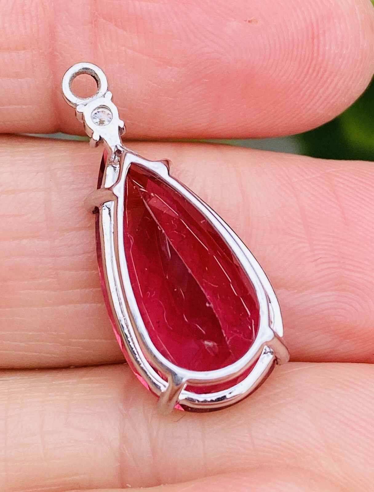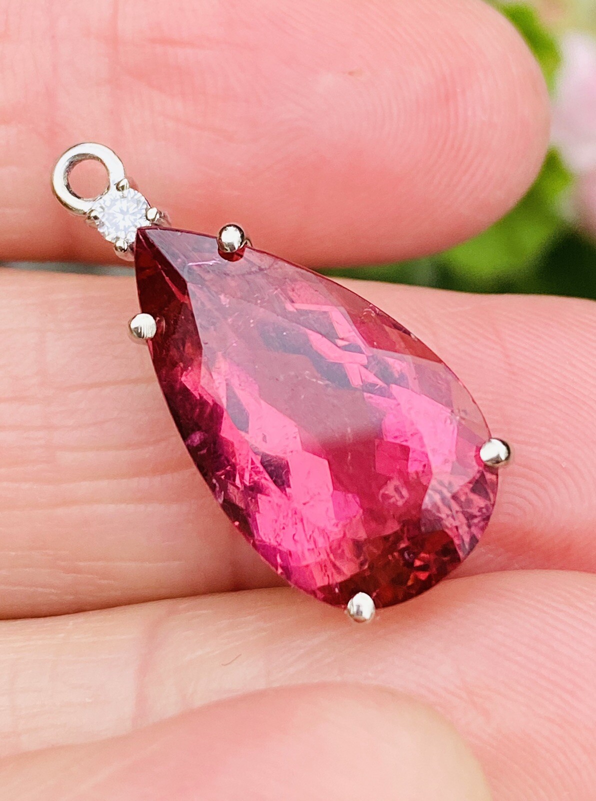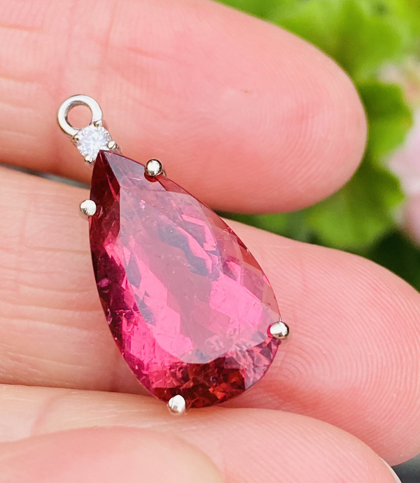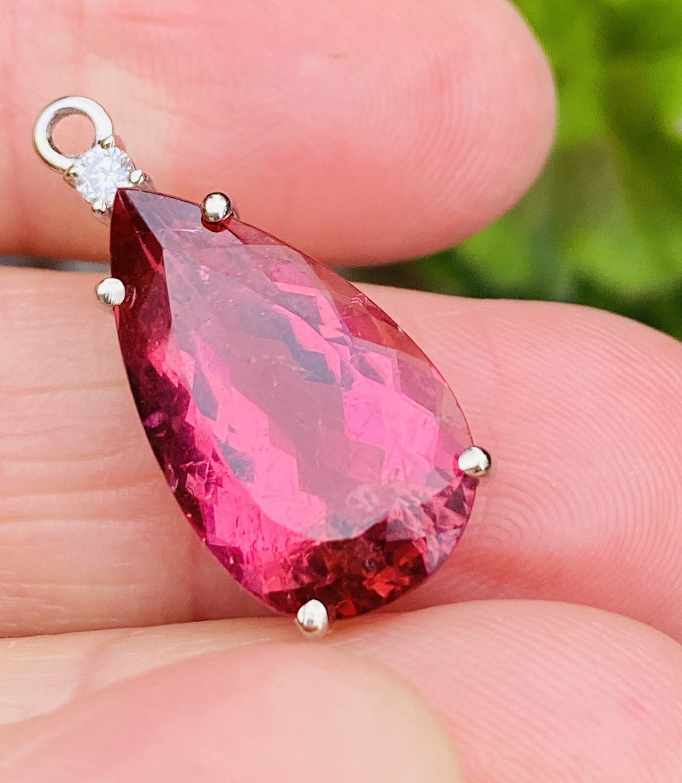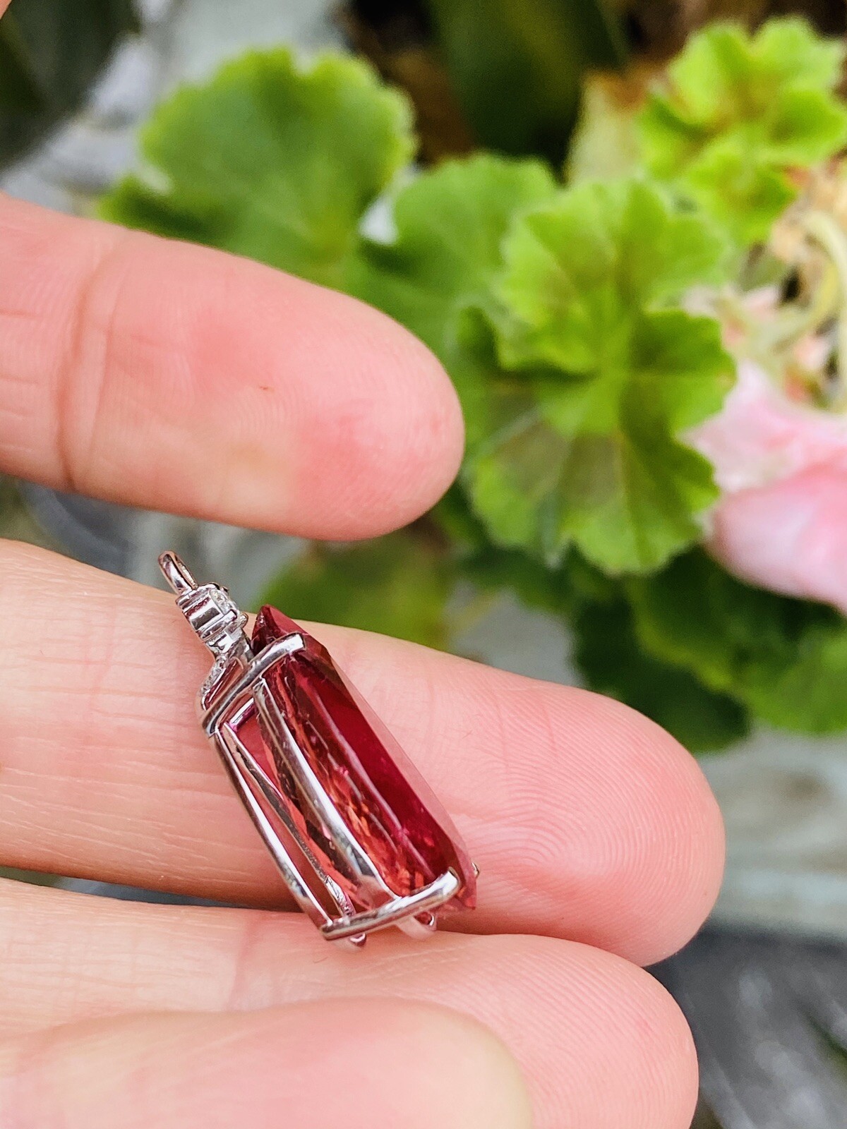 This beautiful vintage gemstone necklace enhancer pendant is crafted in 14k white gold with a beautifullarge 16.5 carat vibrant pink tourmaline gemstone. The pendant is also set with a small white brilliant cut accent diamond and loop to attach as a drop or pendant. The pendant measures a length of 19.75mm and a width of 12mm.