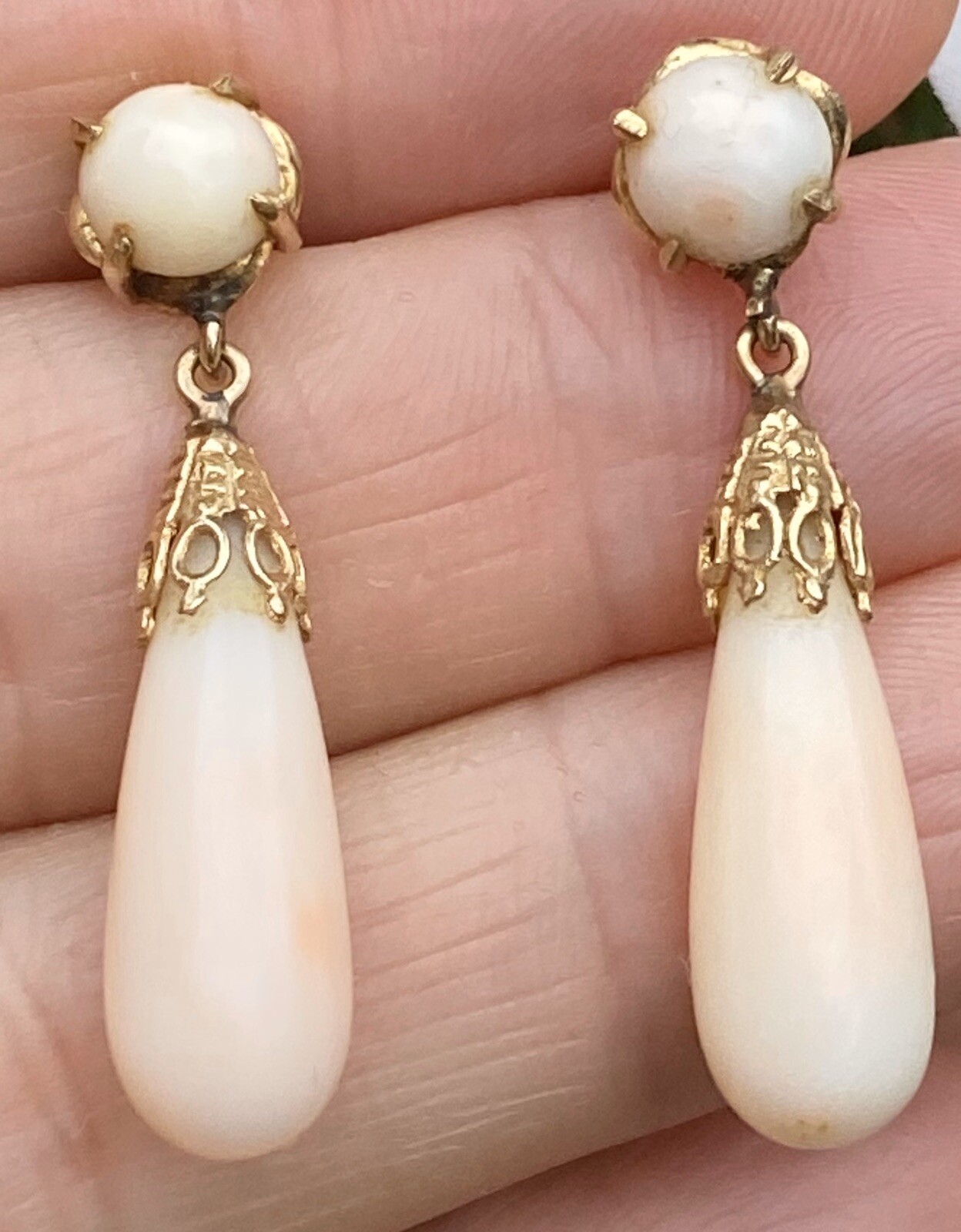 Vintage Estate Natural Angel Skin Coral 14K Gold Drop Dangle Earrings