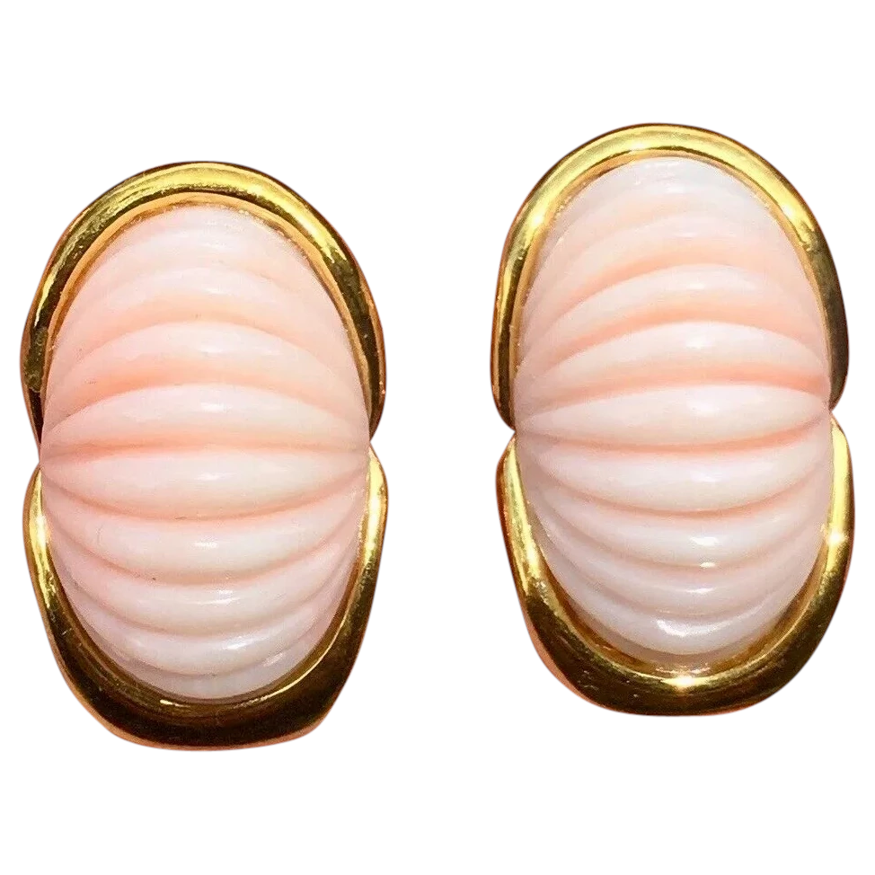 HEAVY Vintage Estate TRIO 14k Gold Carved Angel Skin Coral Cabochon Earrings