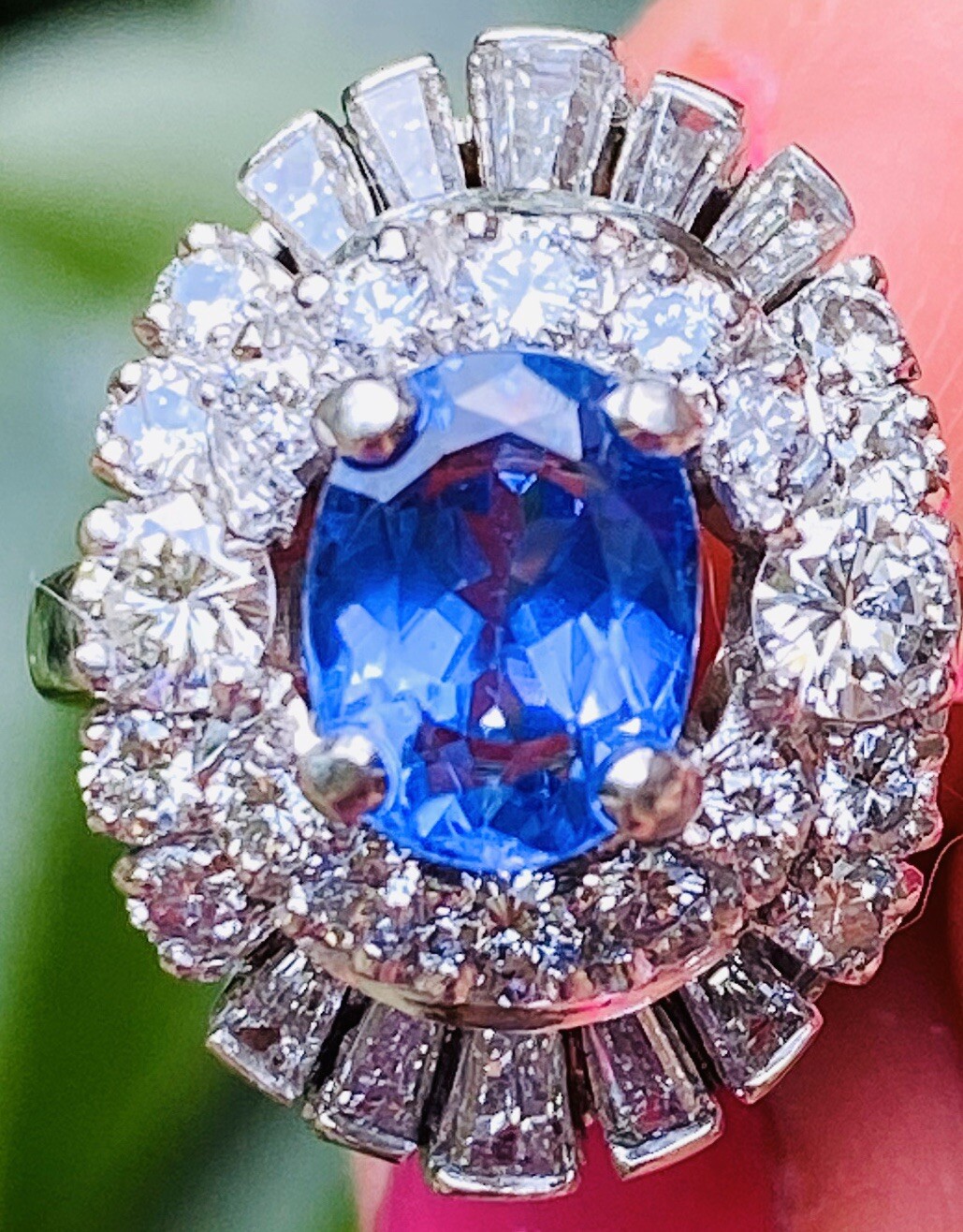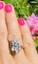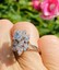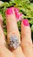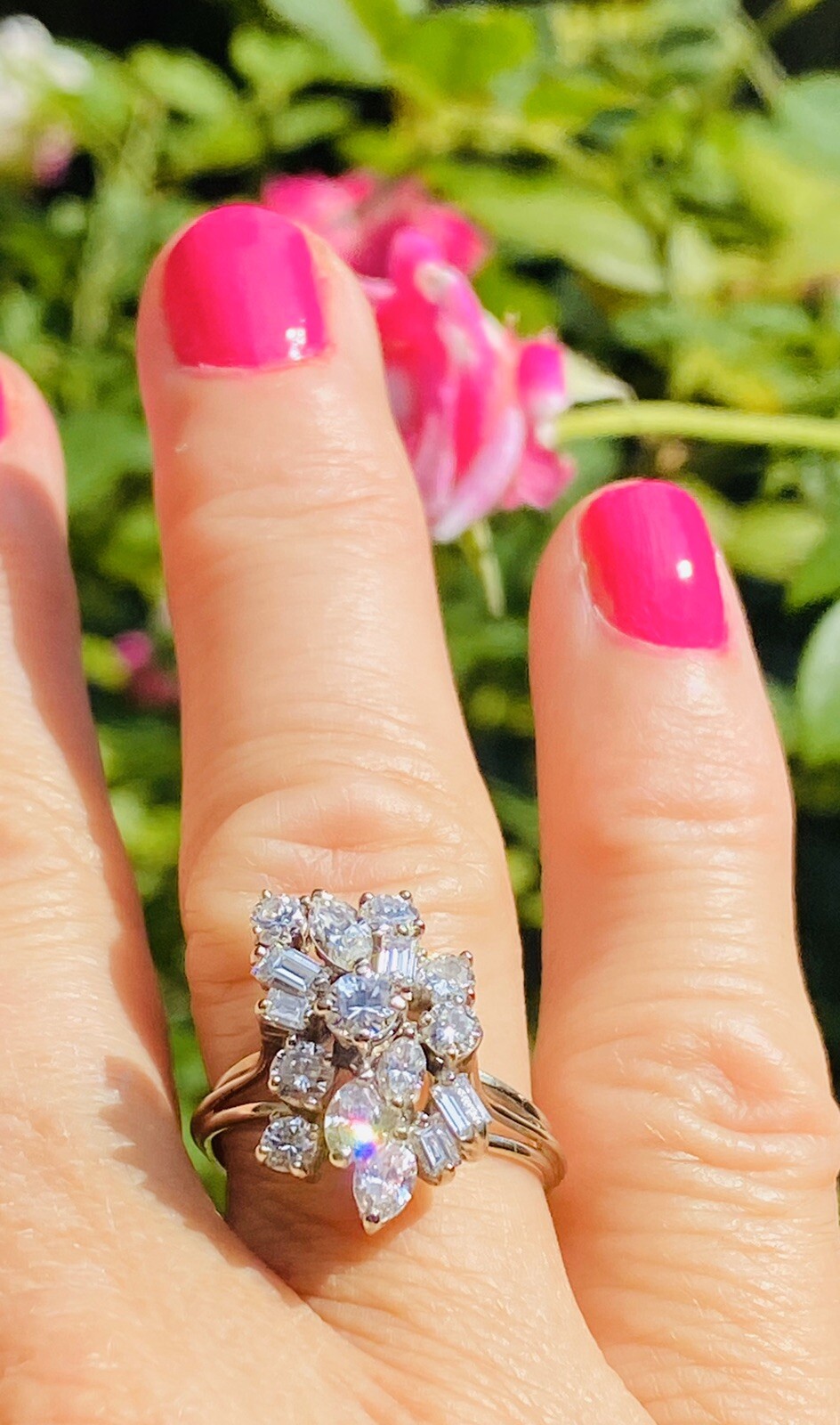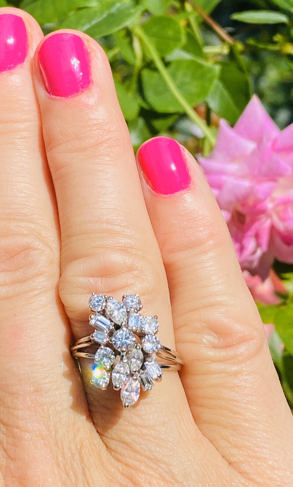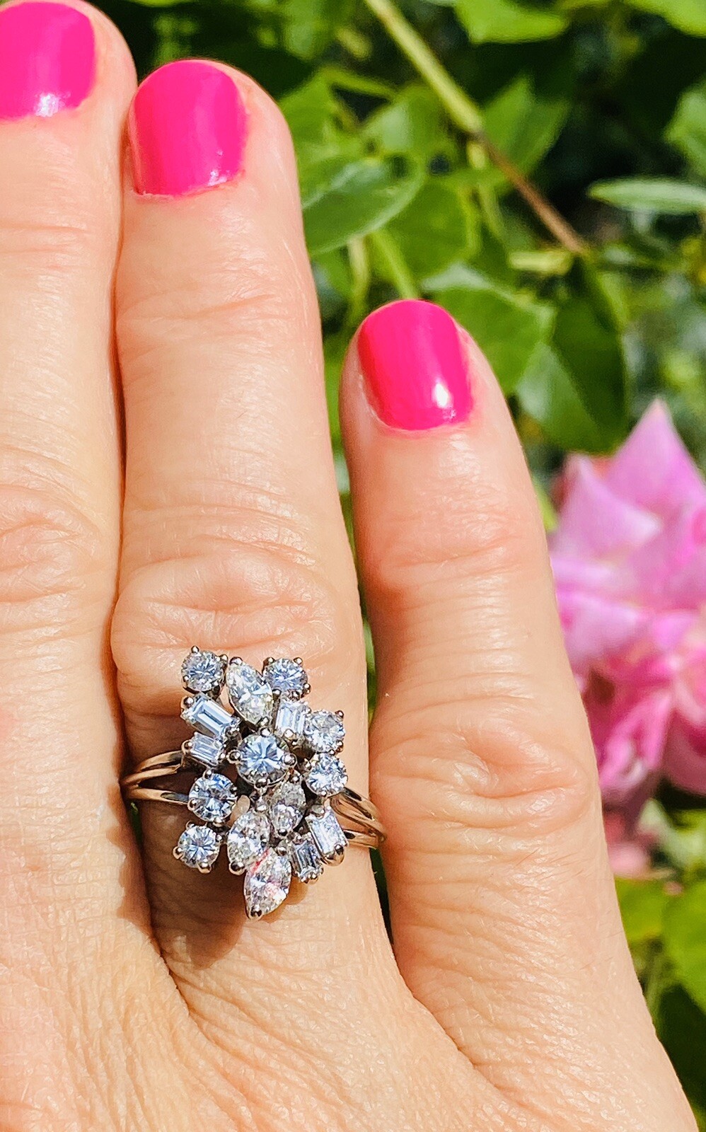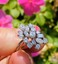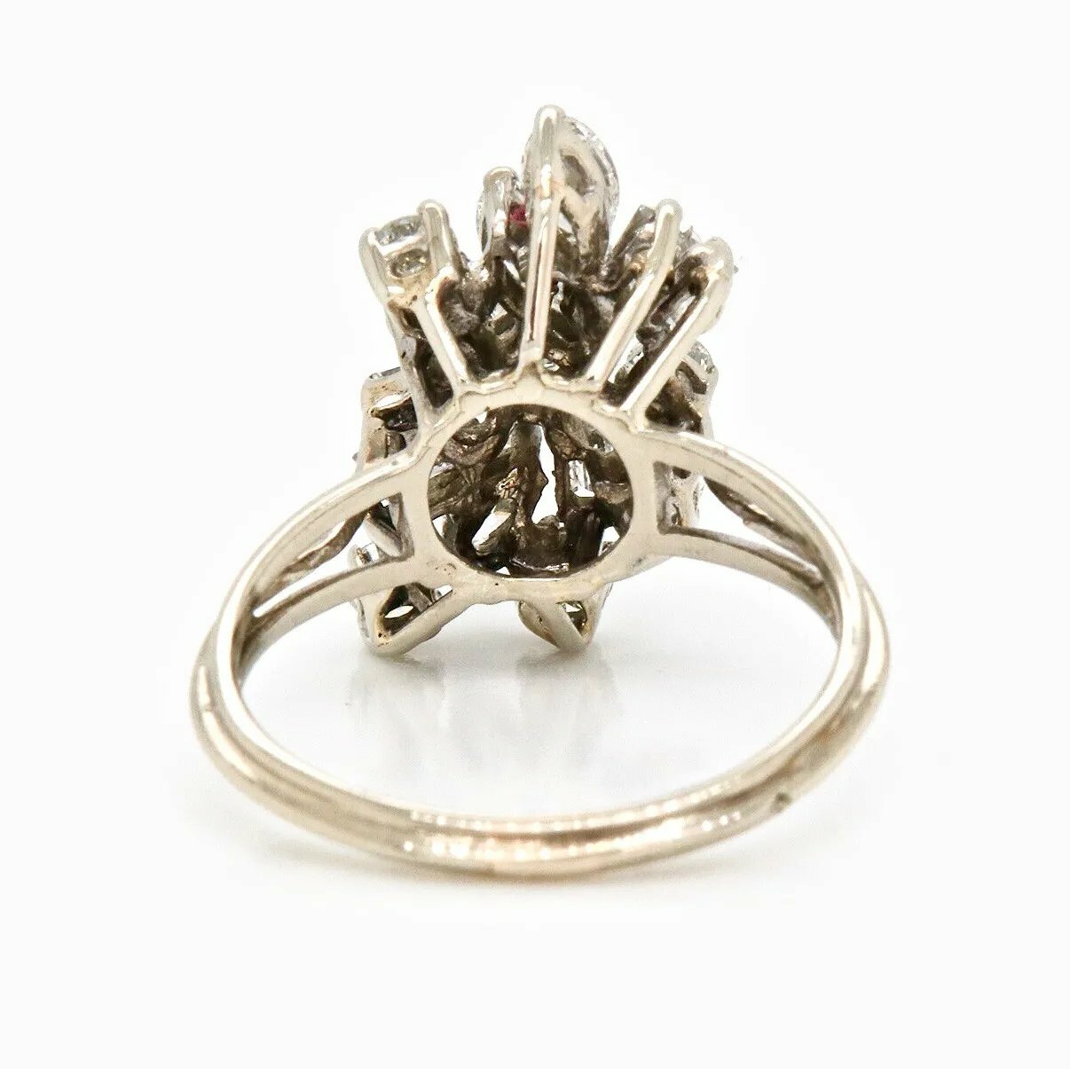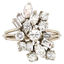 This stunning retro midcentury cluster ring is set in 14k gold (white) with a beautiful