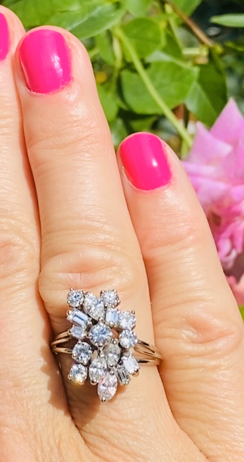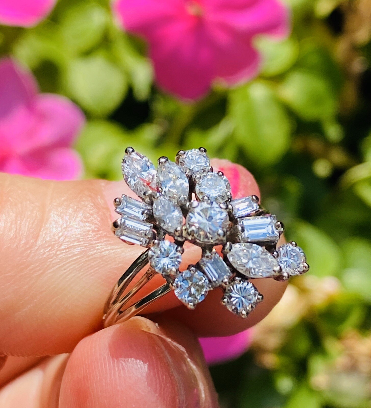 cluster of mixed cut diamonds in round, baguette and marquise shapes. Such a