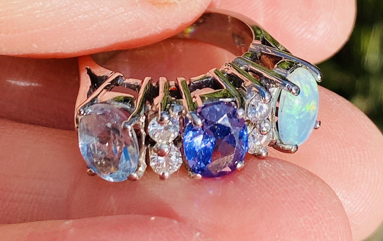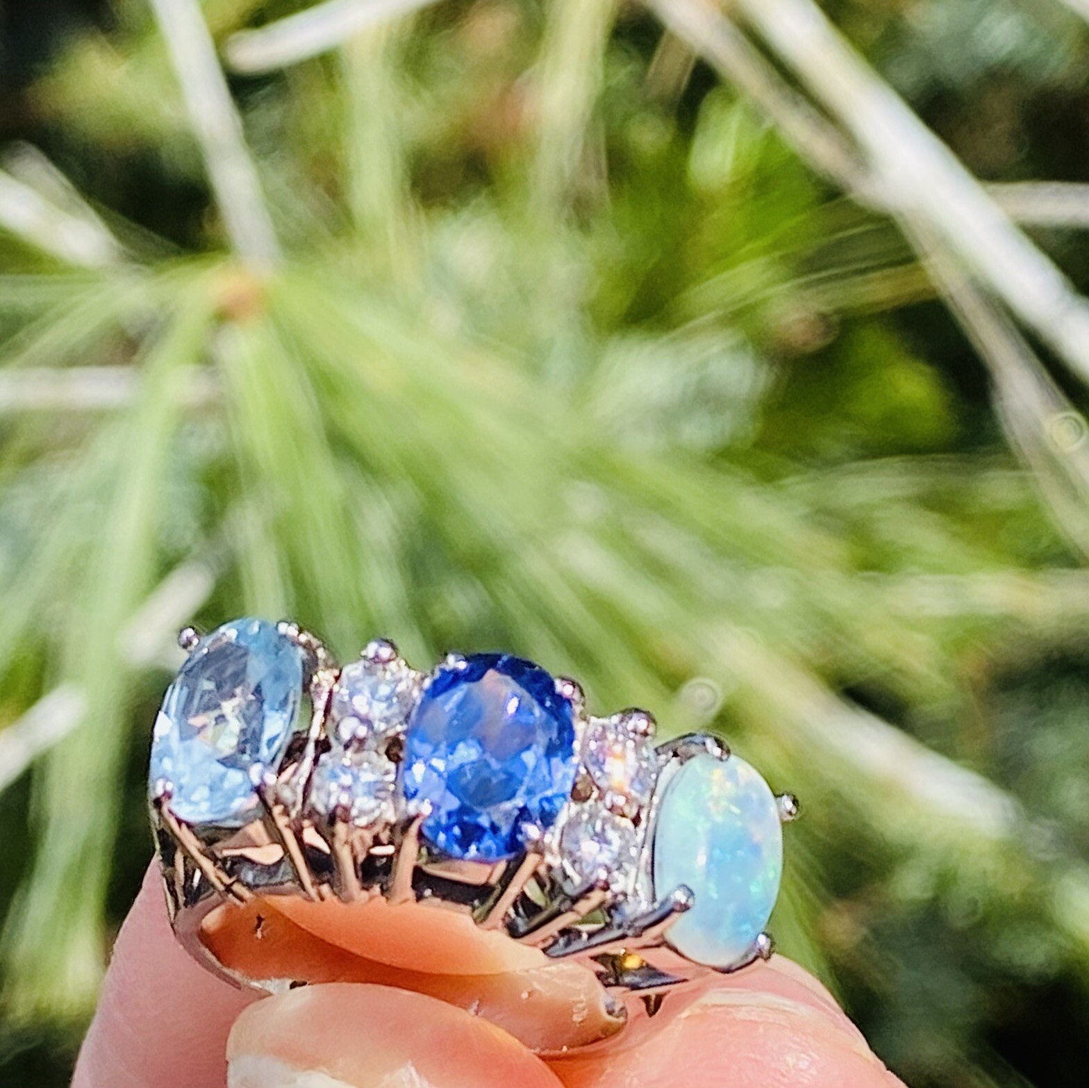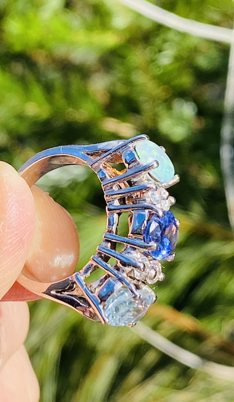 Vintage Estate 14k Gold Opal Tanzanite Blue Topaz Diamond Ring Retro Band