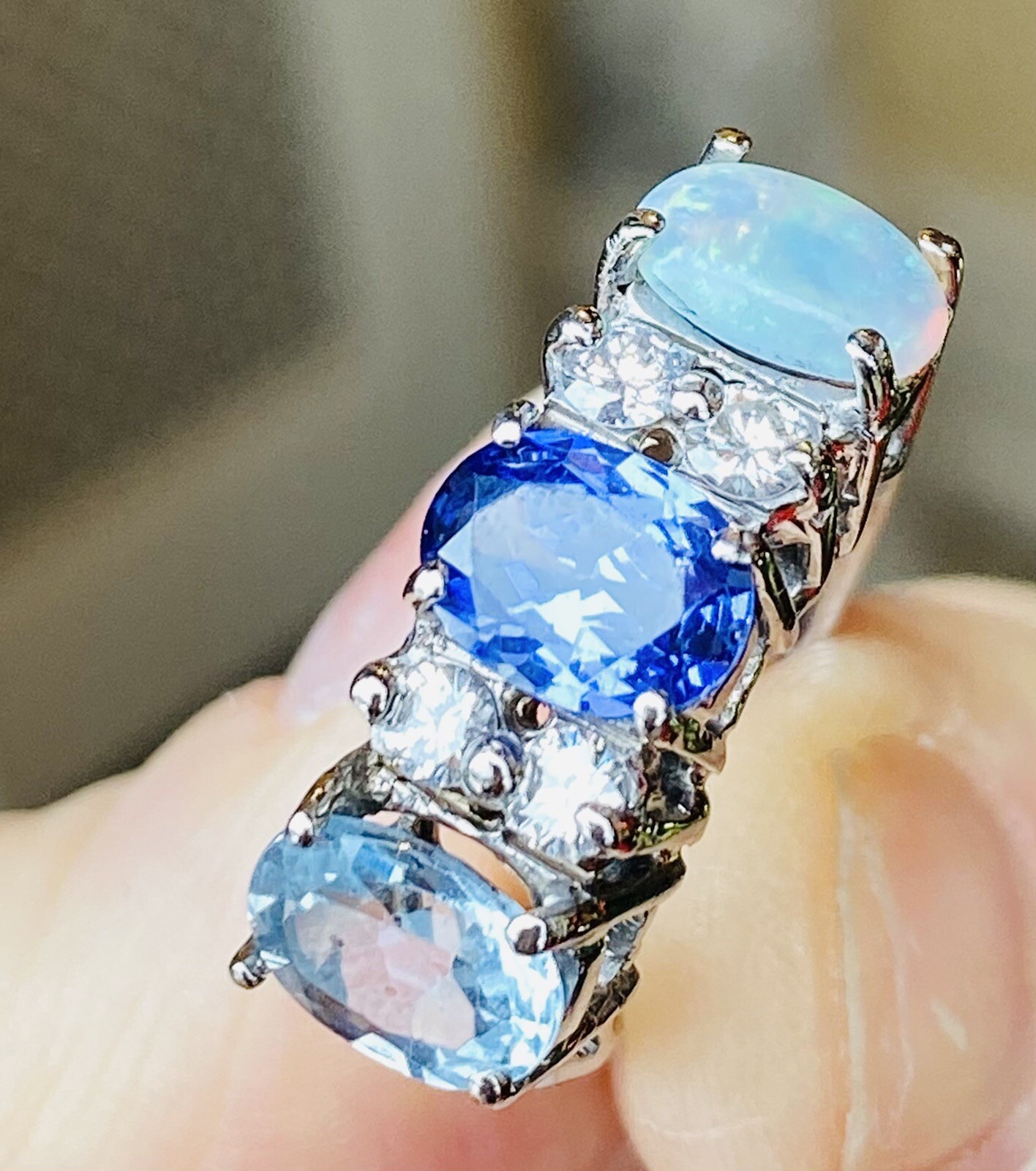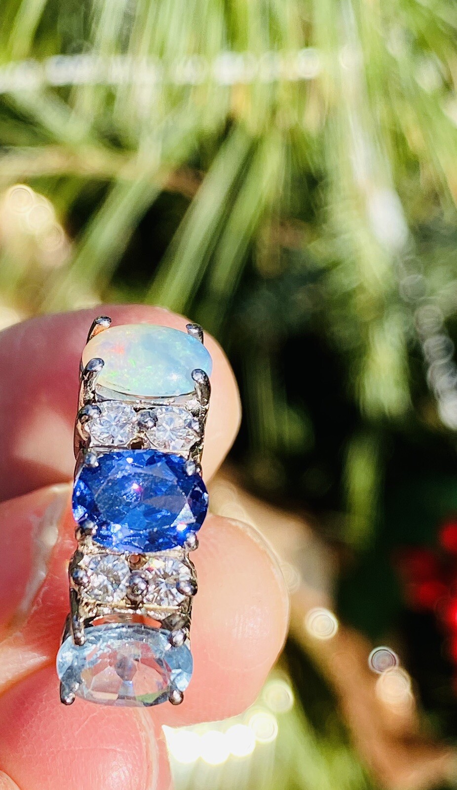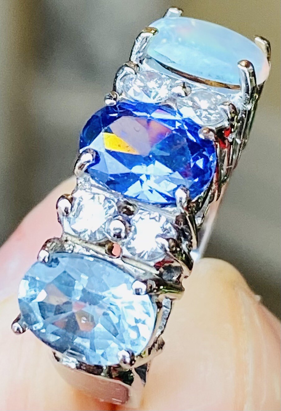 This stunning vintage estate ring is set in 14k white gold featuring three stunning prong set gemstones of opal, tanzanite and blue topaz.  Each of the gemstones measure approximately 1.0 carats each.  Set between the larger stones are beautiful round cut diamonds that total approximately 0.40 carats of G-H color and SI1 clarity.