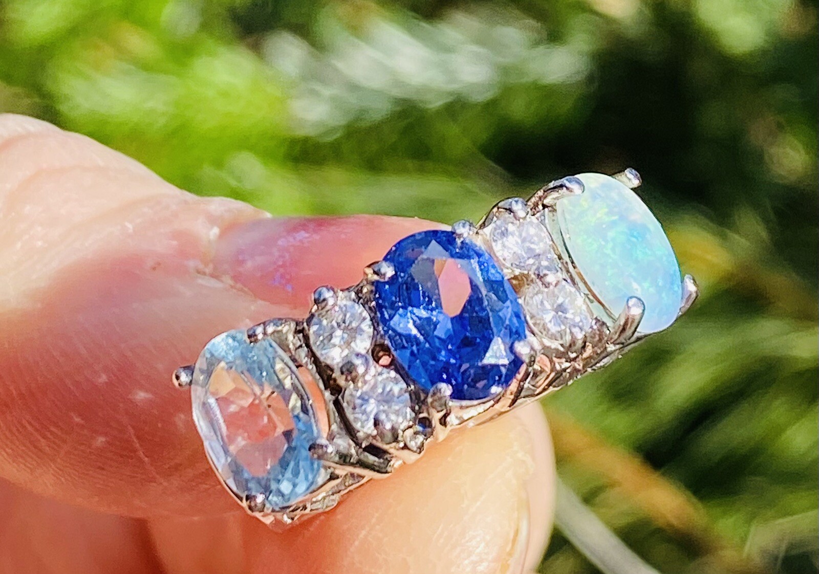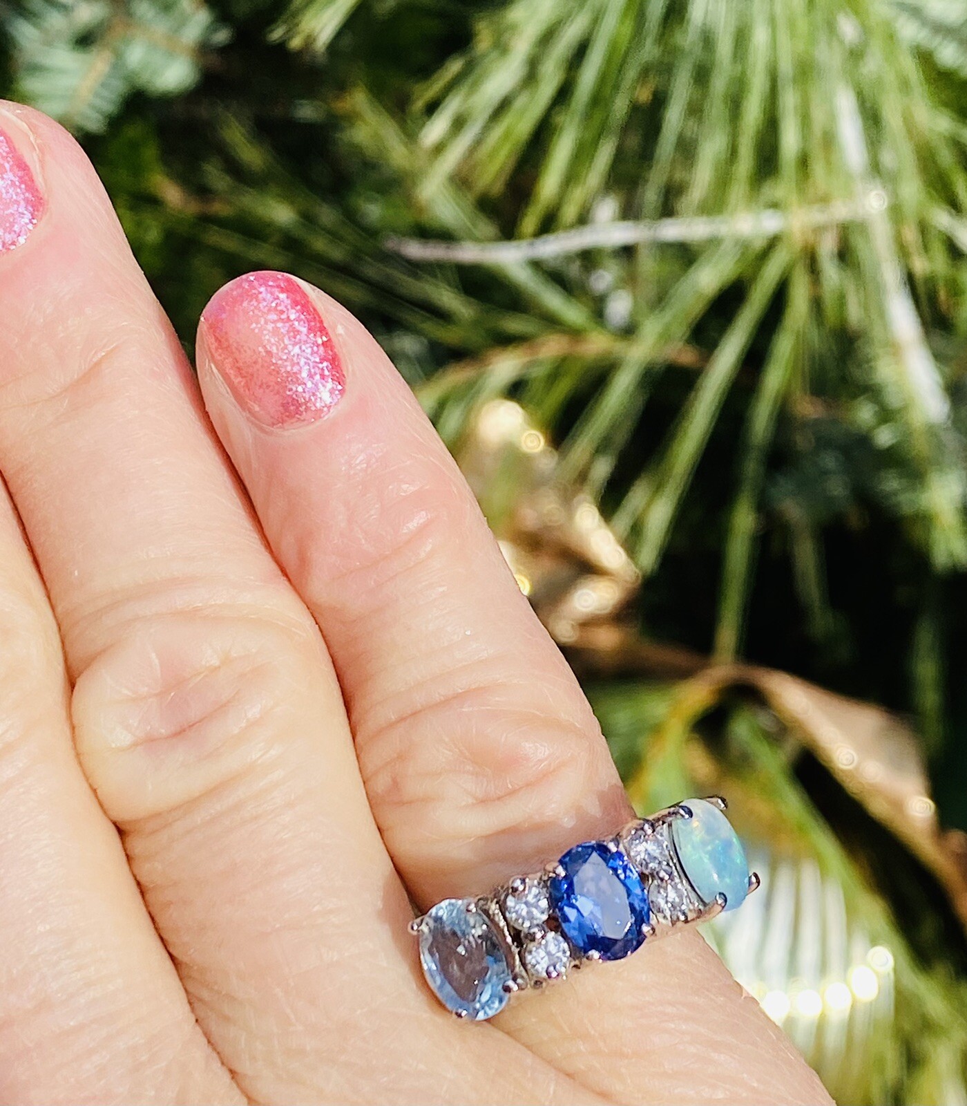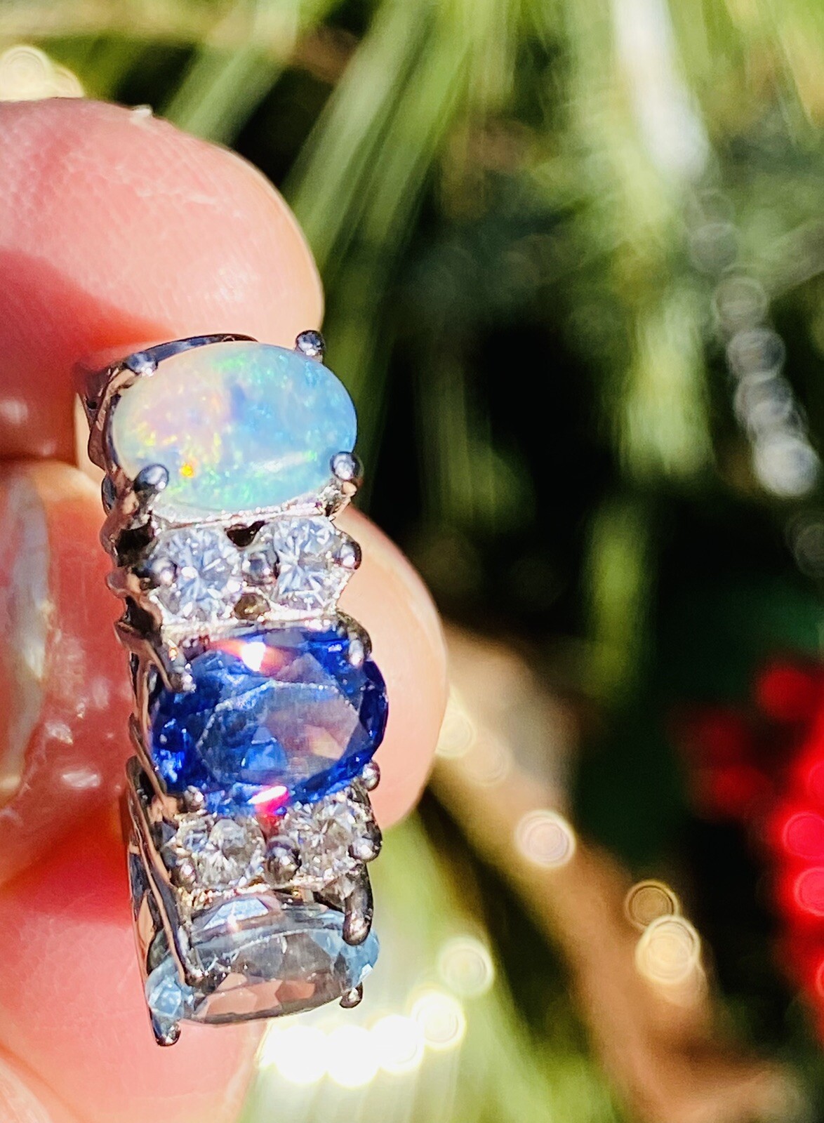 This stunning vintage estate ring is set in 14k white gold featuring three stunning prong set gemstones of opal, tanzanite and blue topaz.  Each of the gemstones measure approximately 1.0 carats each.  Set between the larger stones are beautiful round cut diamonds that total approximately 0.40 carats of G-H color and SI1 clarity.
