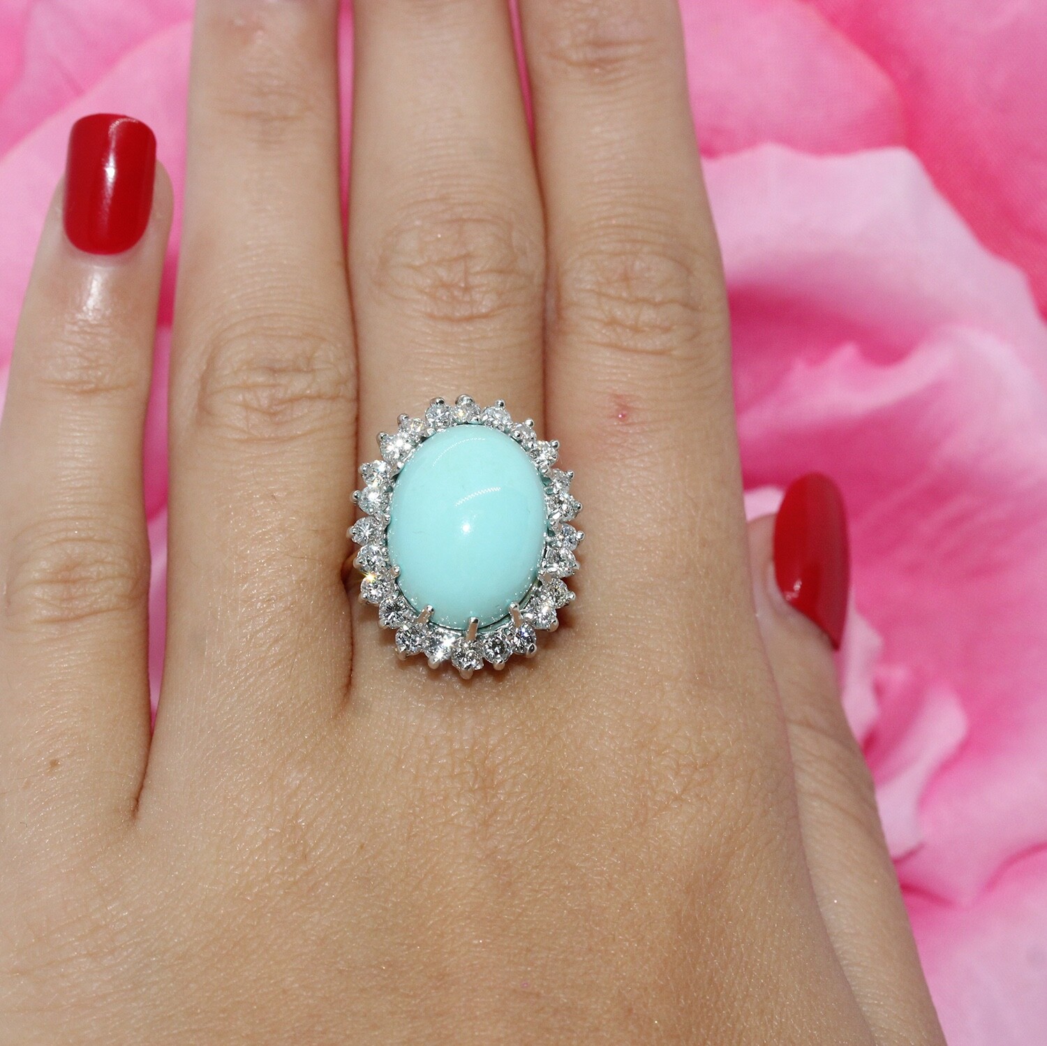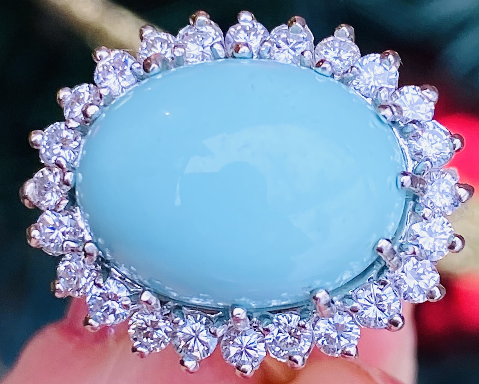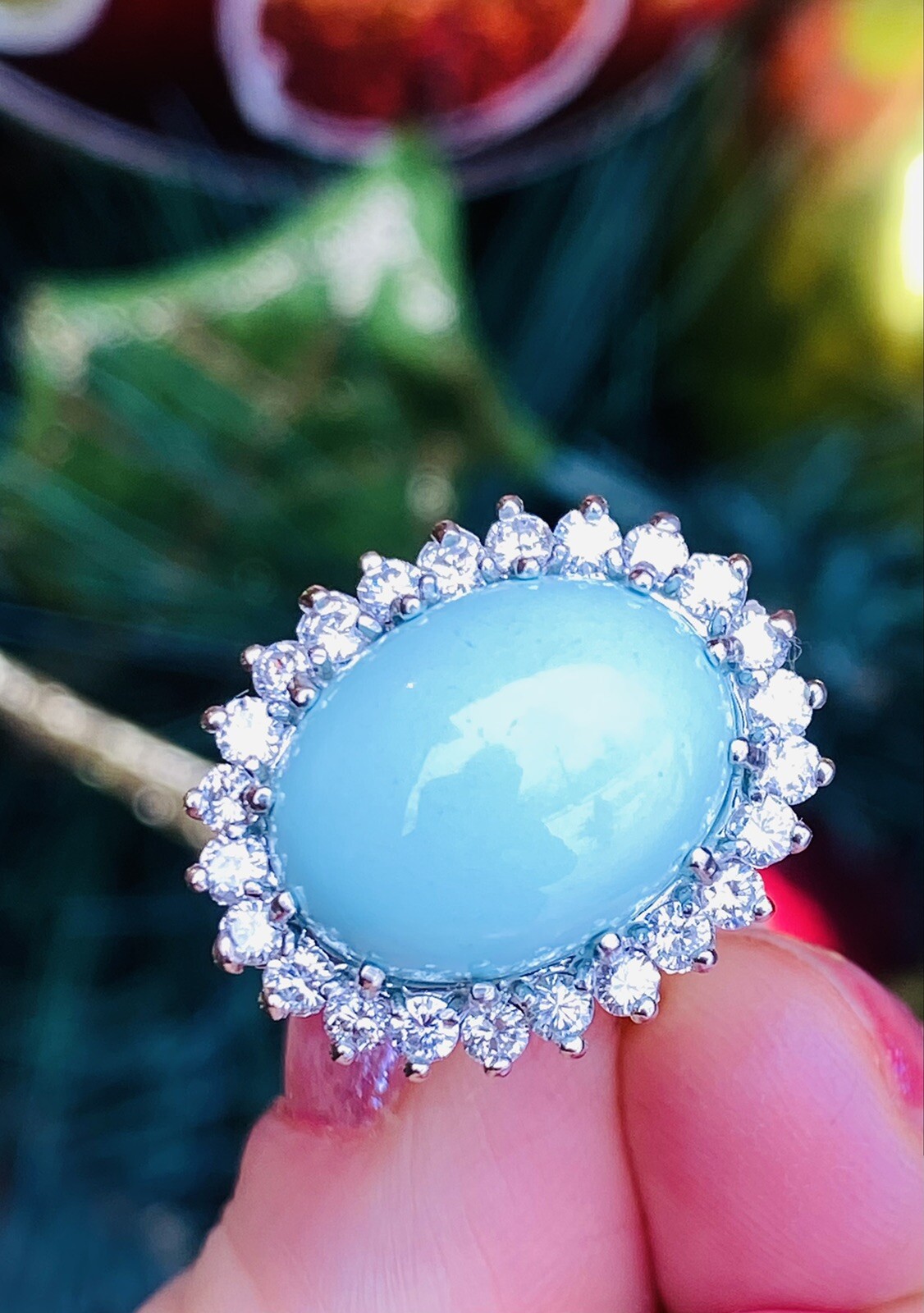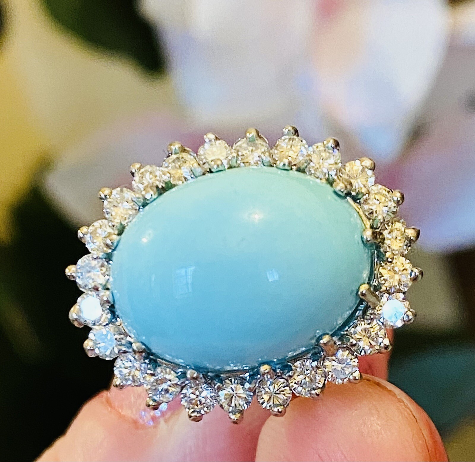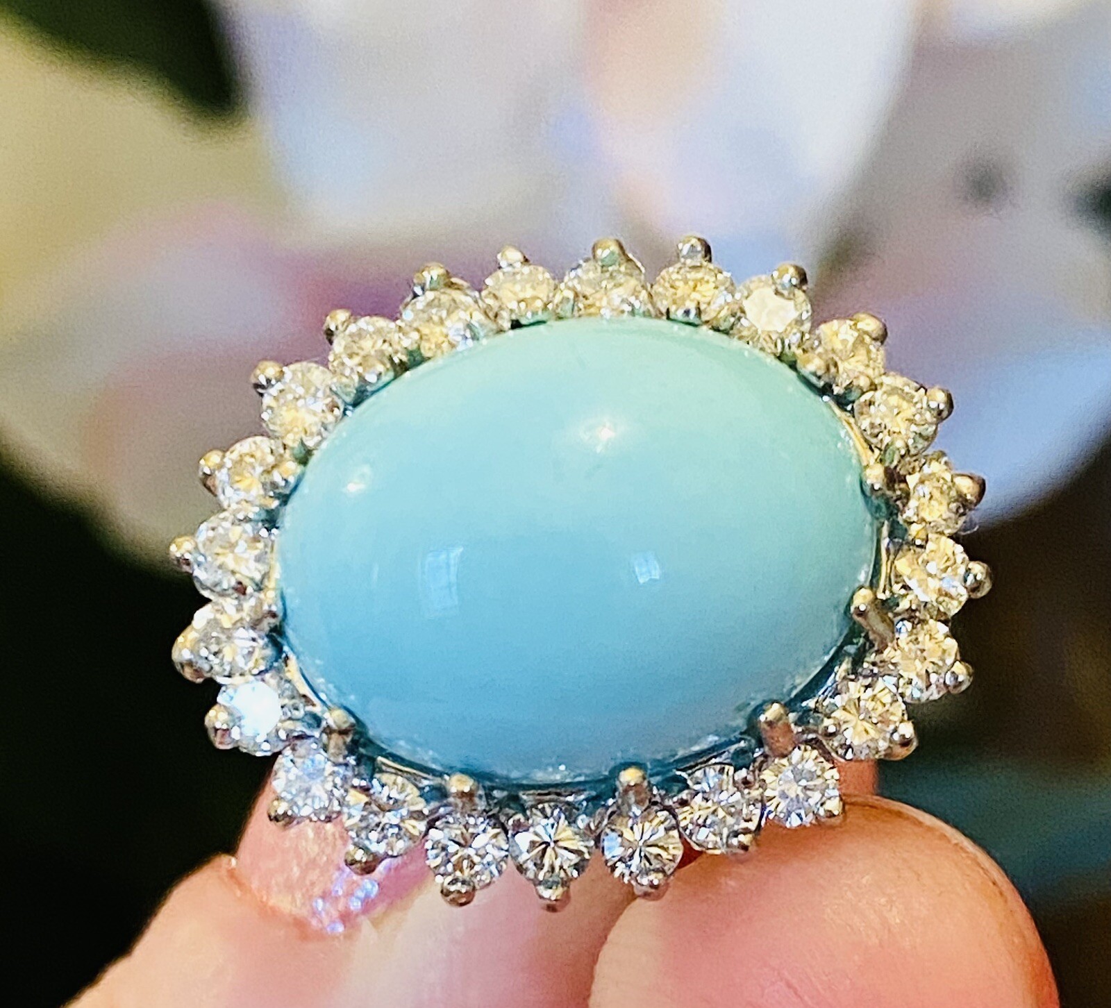 This stunning vintage estate ring is set in 14k white and yellow gold featuring a beautiful robins egg blue turquoise cabochon gemstone measuring 15mm x 12mm. The stone is further set in a glittering halo of G-H VS brilliant cut white diamonds, total diamond weight approximately 1.08 carats.