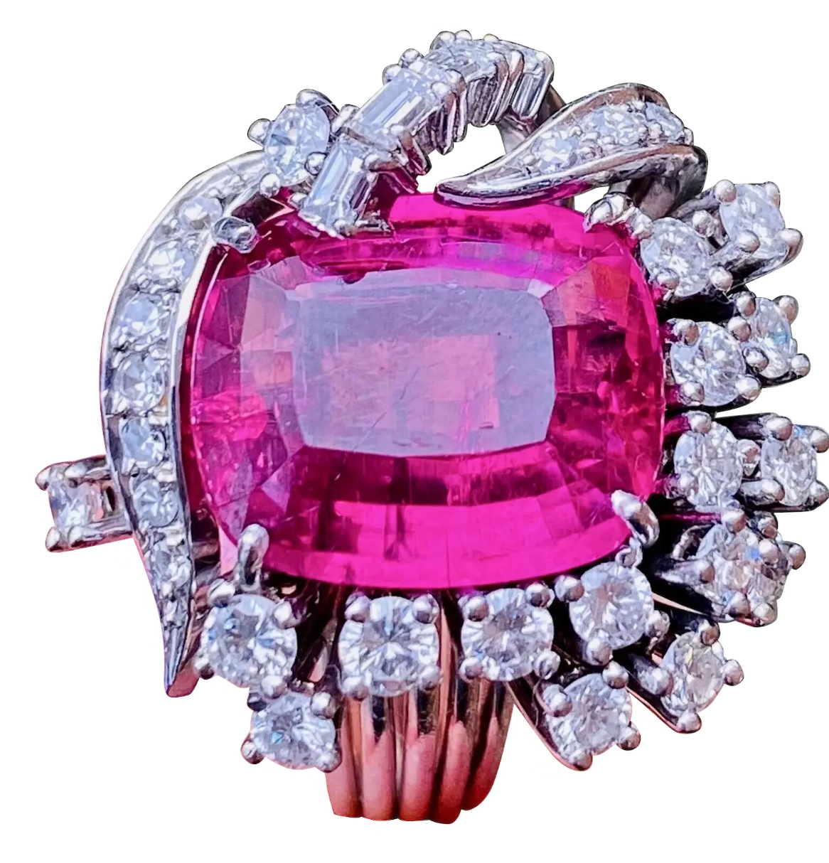 Vintage 1950s 18k White Gold Pink Tourmaline 1.00ct Diamond Retro Cocktail Ring