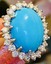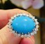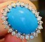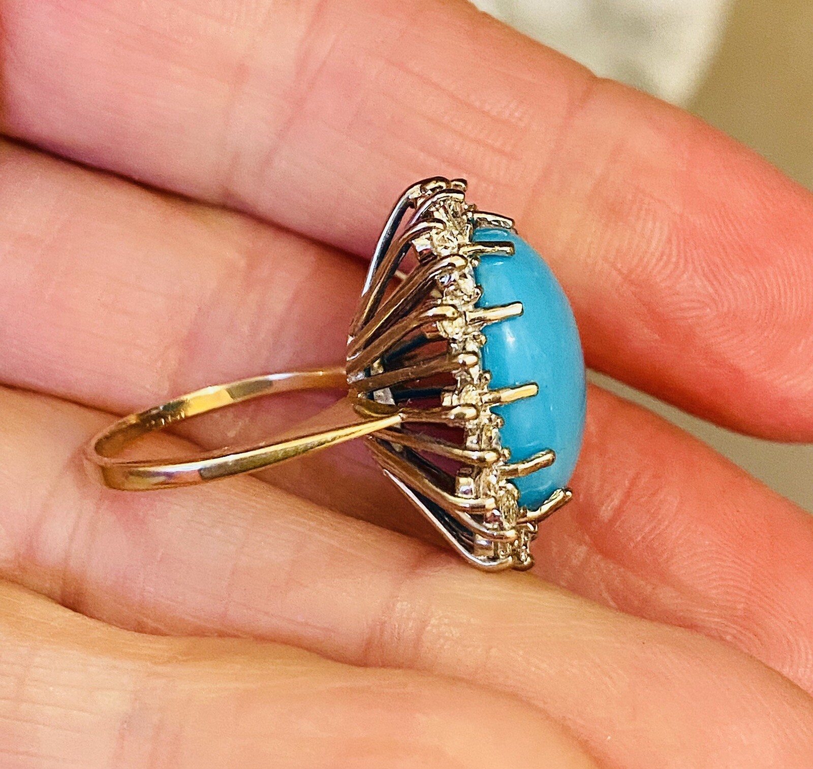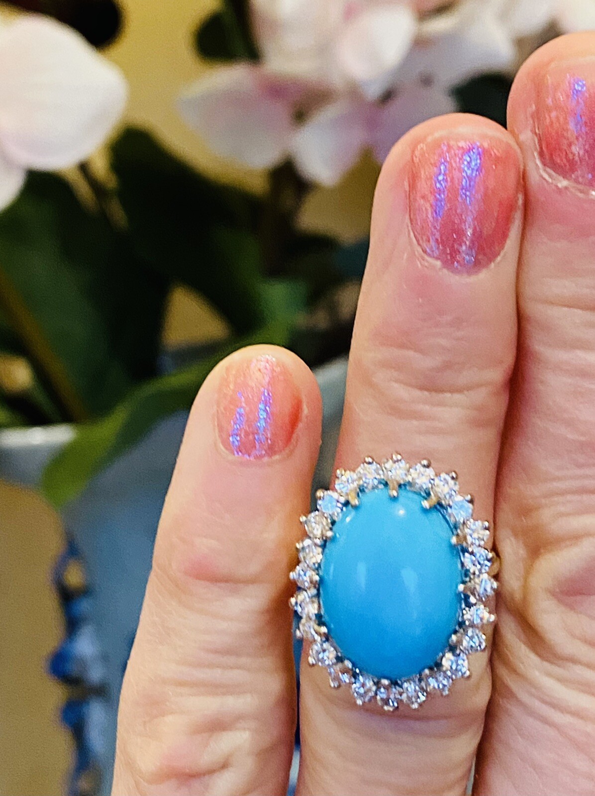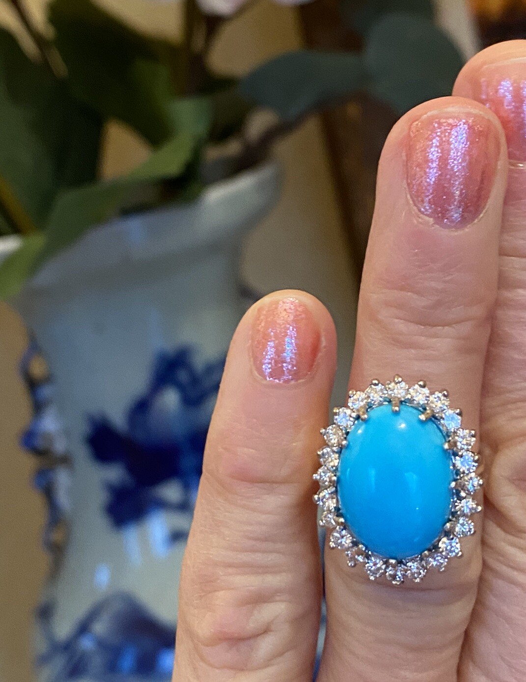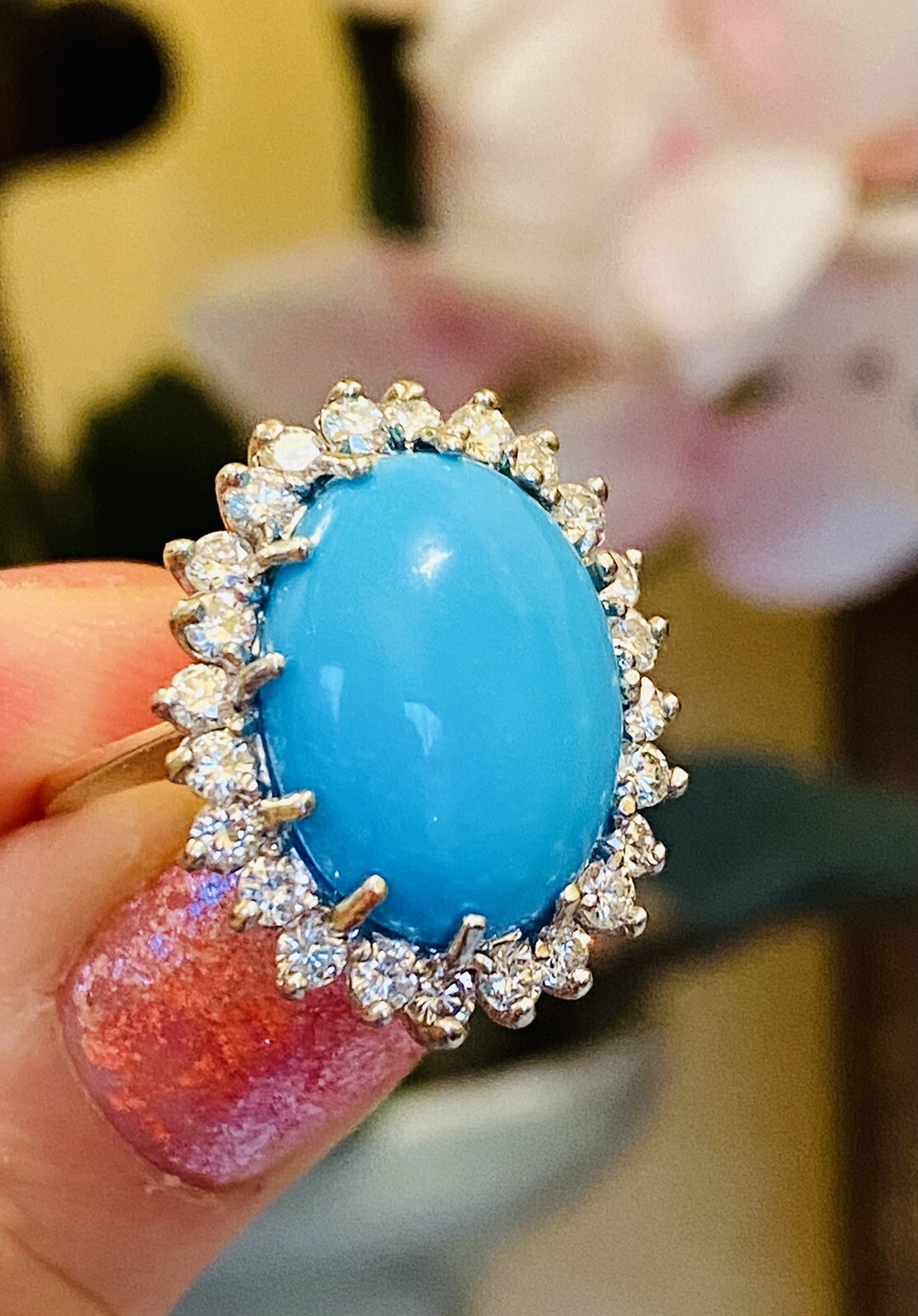 This stunning vintage estate ring is set in 14k white and yellow gold featuring a beautiful Persian blue turquoise cabochon gemstone measuring 15mm x 12mm. The stone is further set in a glittering halo of G-H VS brilliant cut white diamonds, total diamond weight approximately 1.08 carats.