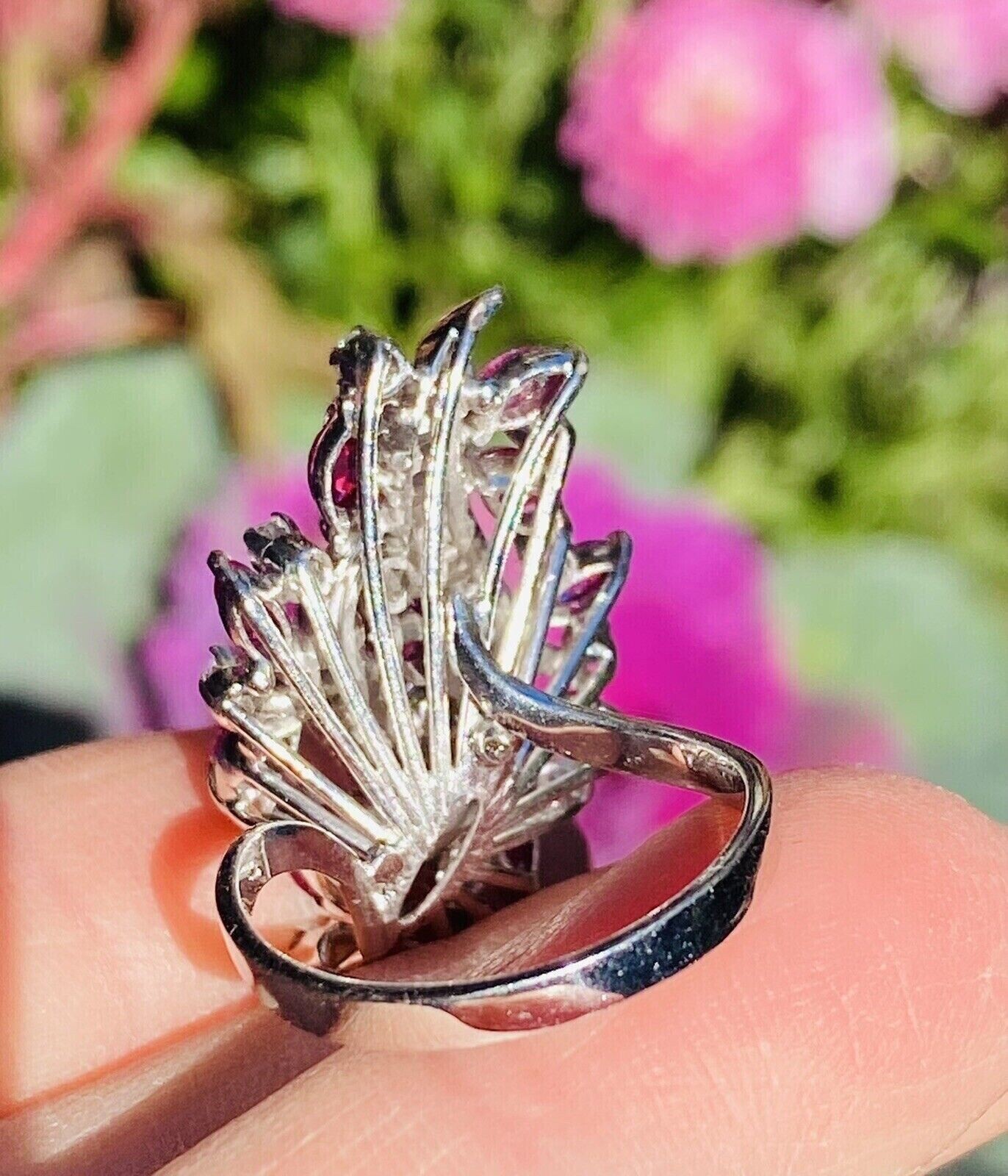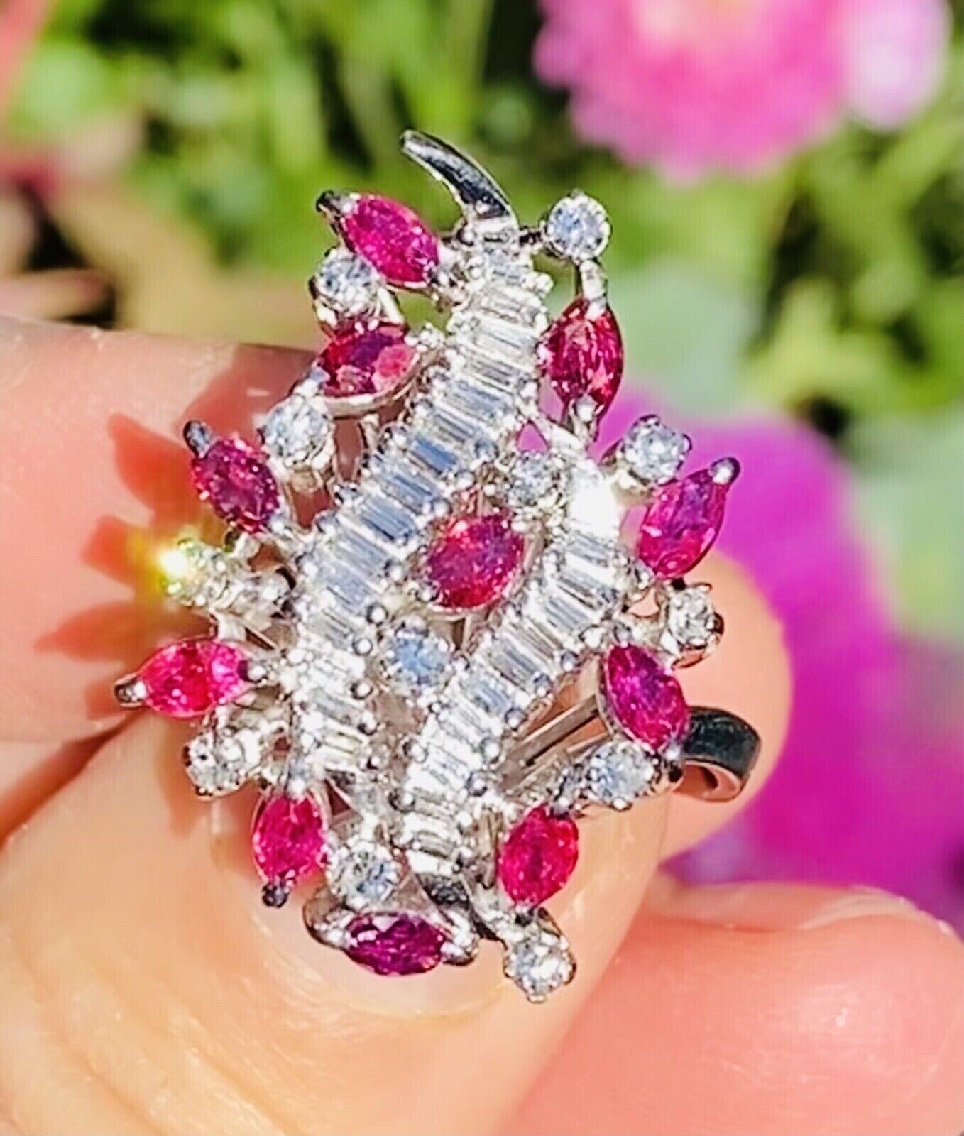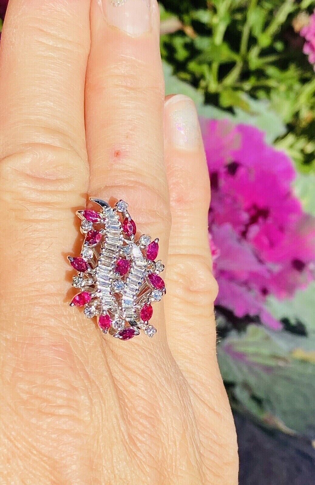 Vintage Retro 14k White Gold 2ct Ruby VS Diamond Cluster Cocktail Ring