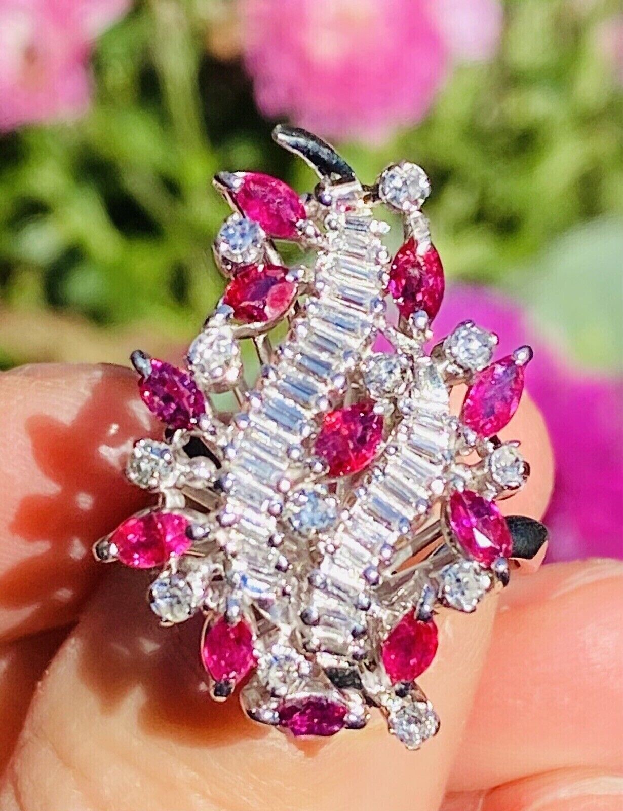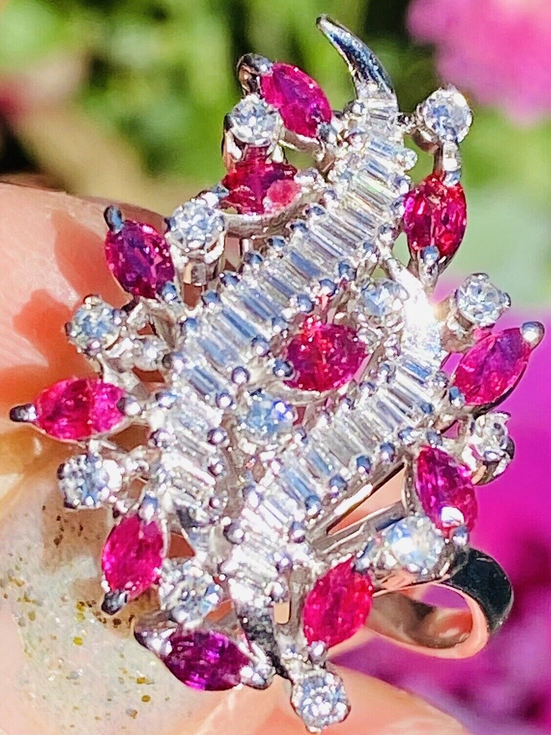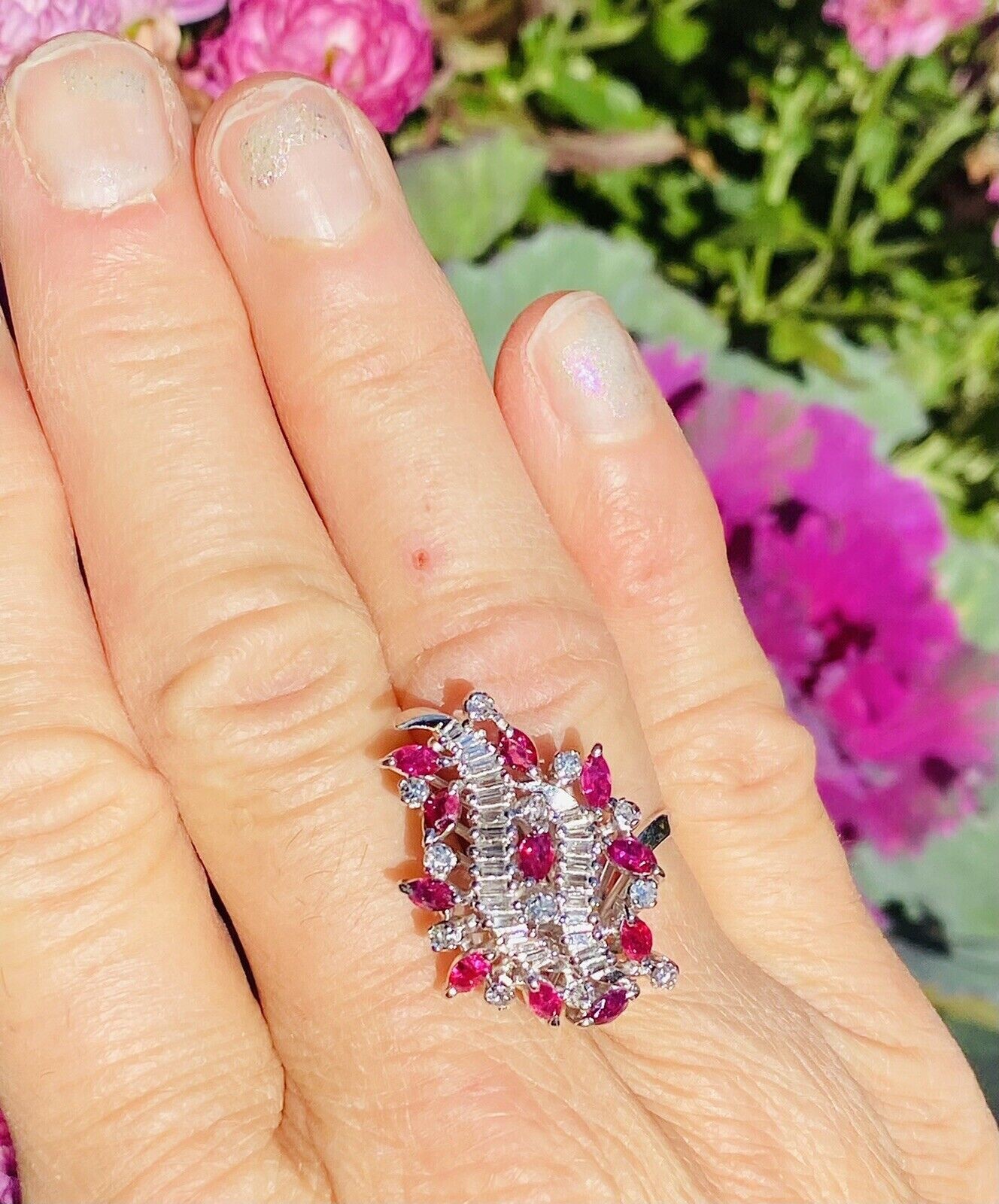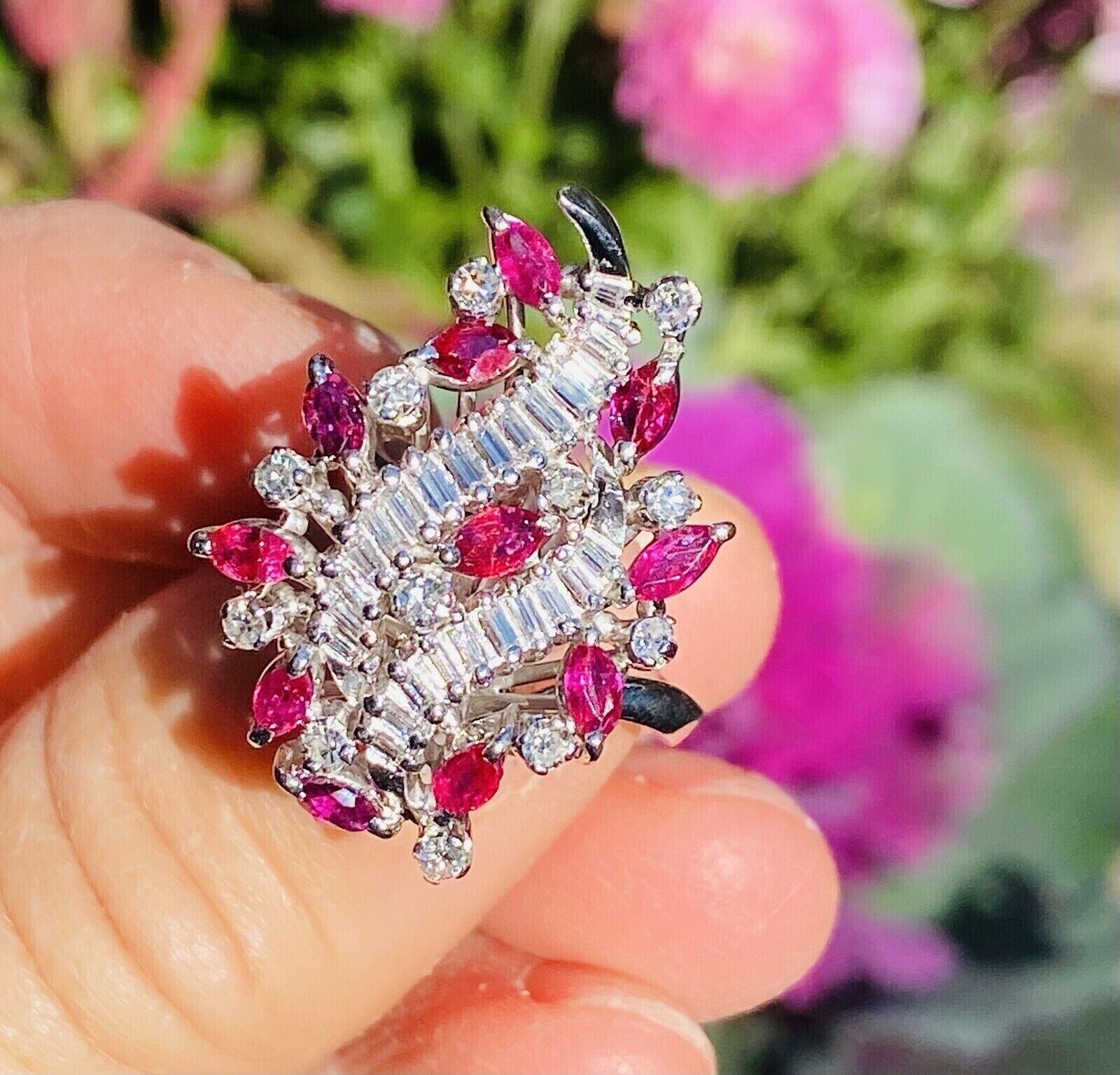 Vintage Retro 14k White Gold 2ct Ruby VS Diamond Cluster Cocktail Ring