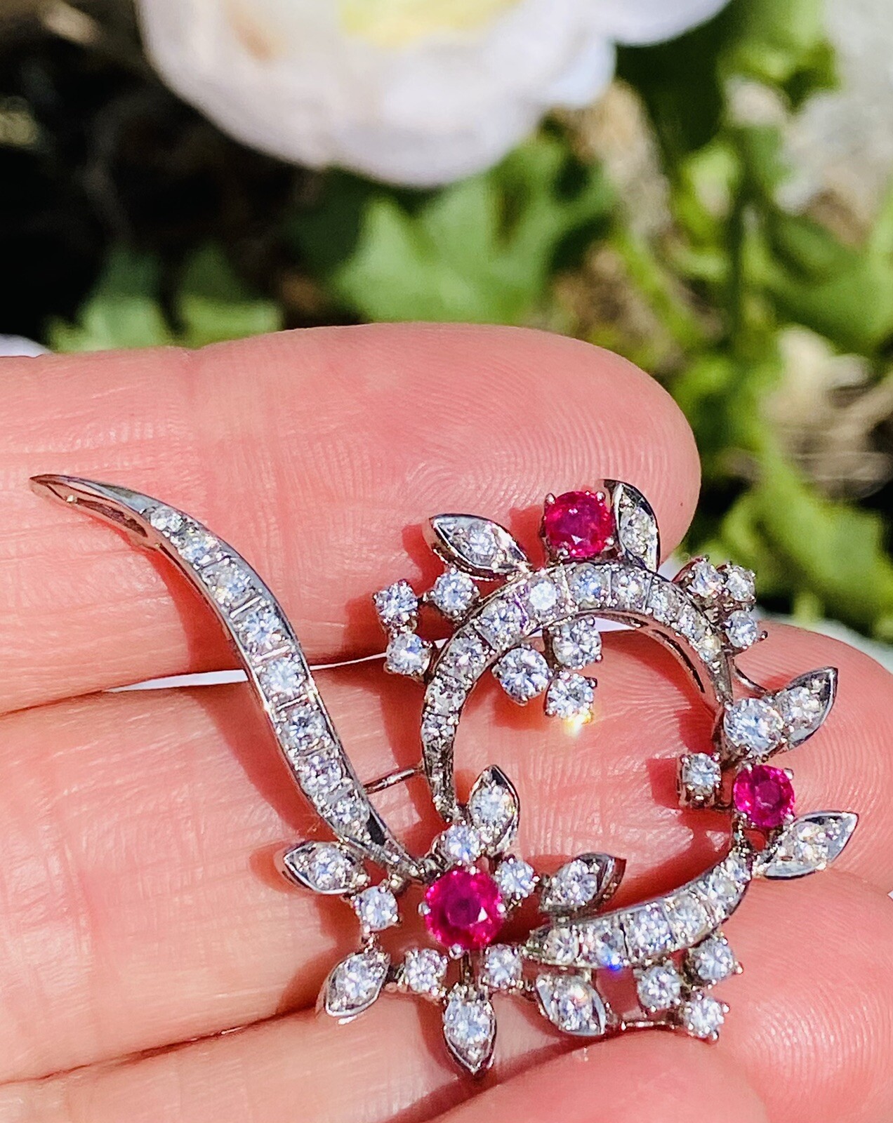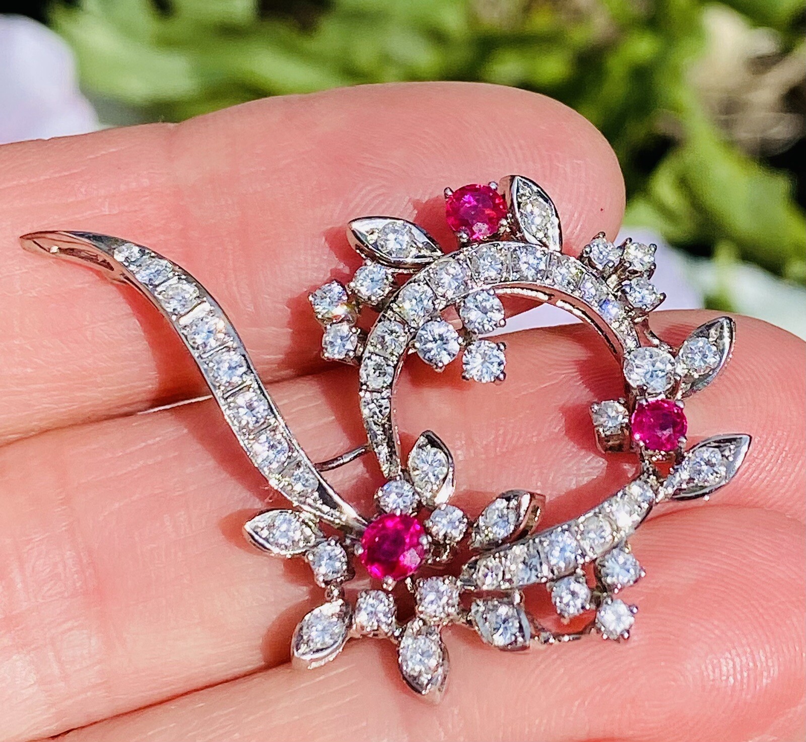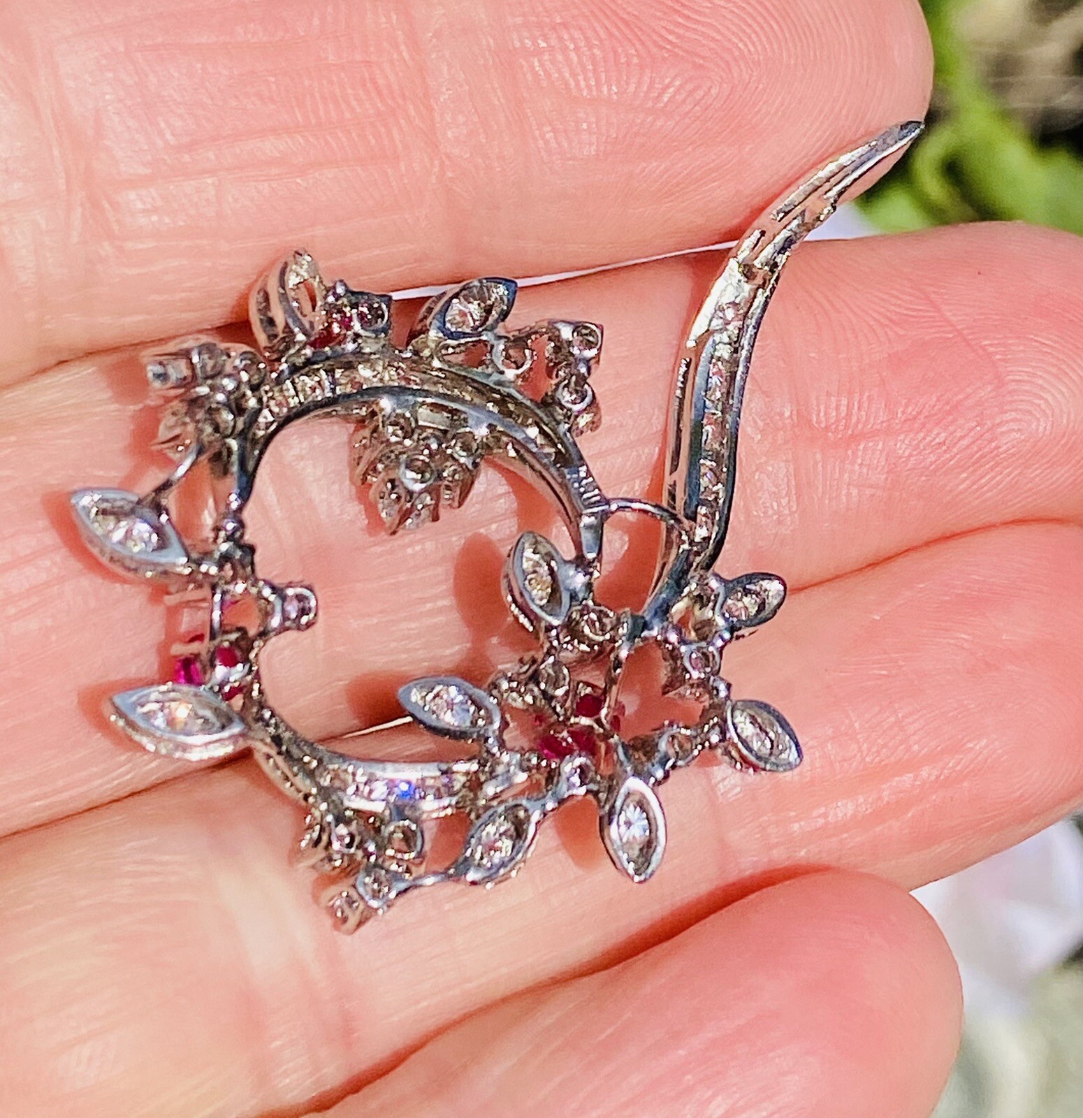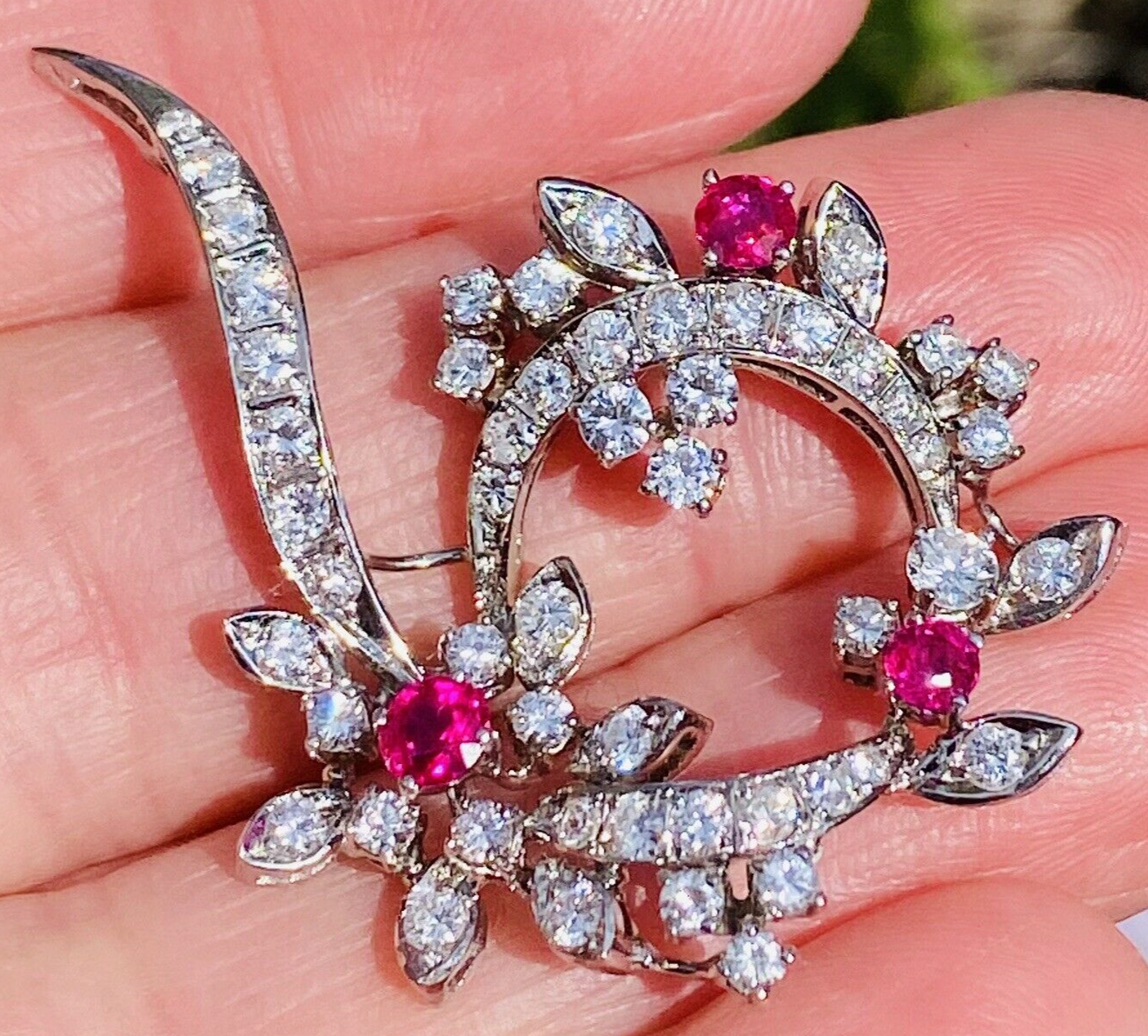 Vintage Estate 18k 2ct Diamond & Ruby Wreath Brooch Pendant