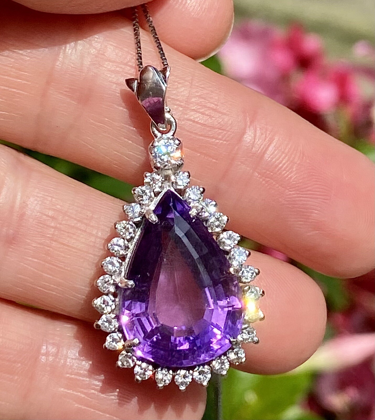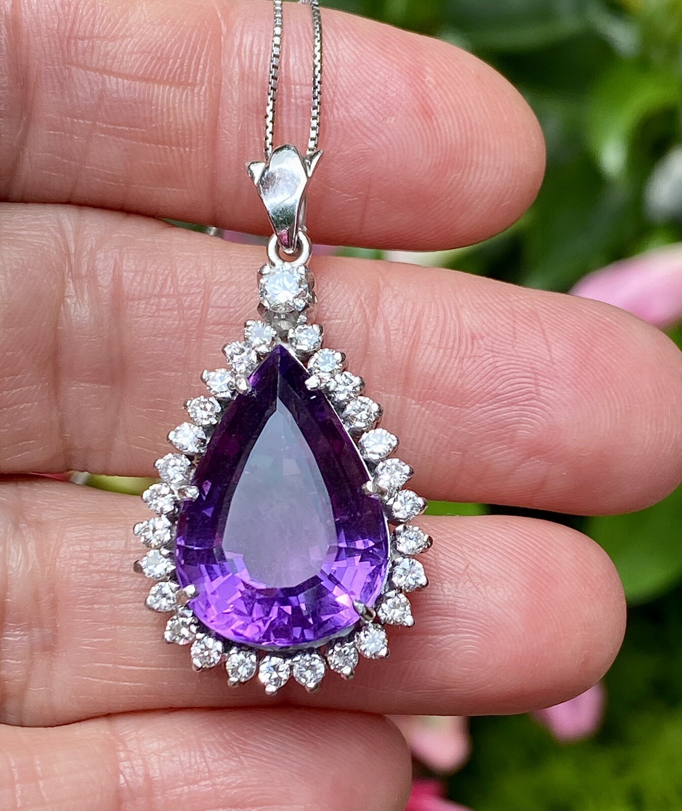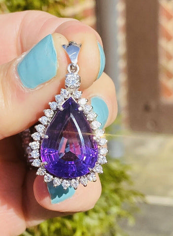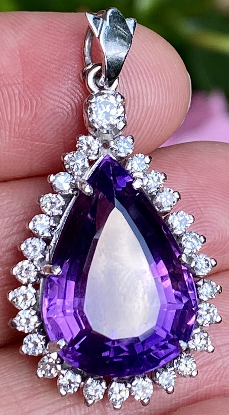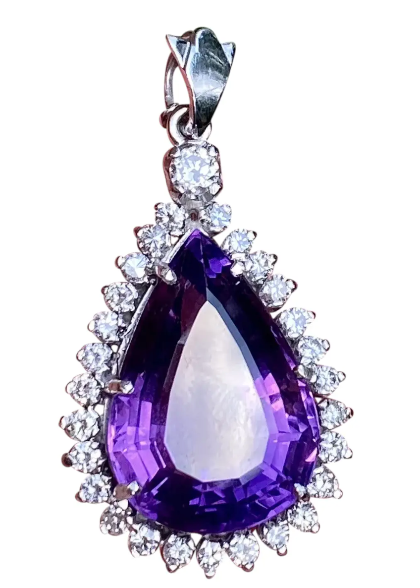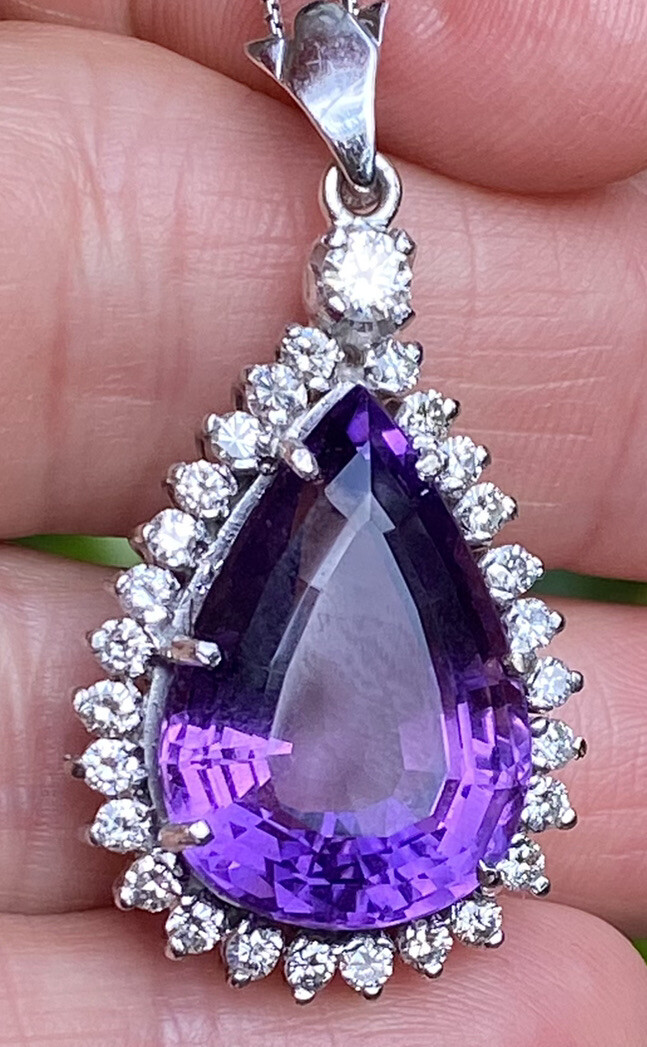 This beautiful vintage necklace pendant is set in 18k white gold setting with a large pear cut purple amethyst gemstone measuring 20.6mm long x 14.7mm wide x 10.3mm deep.  The gem is surrounded by a striking halo of brilliant cut white diamonds.  The total diamond weight is 0.97 carats.