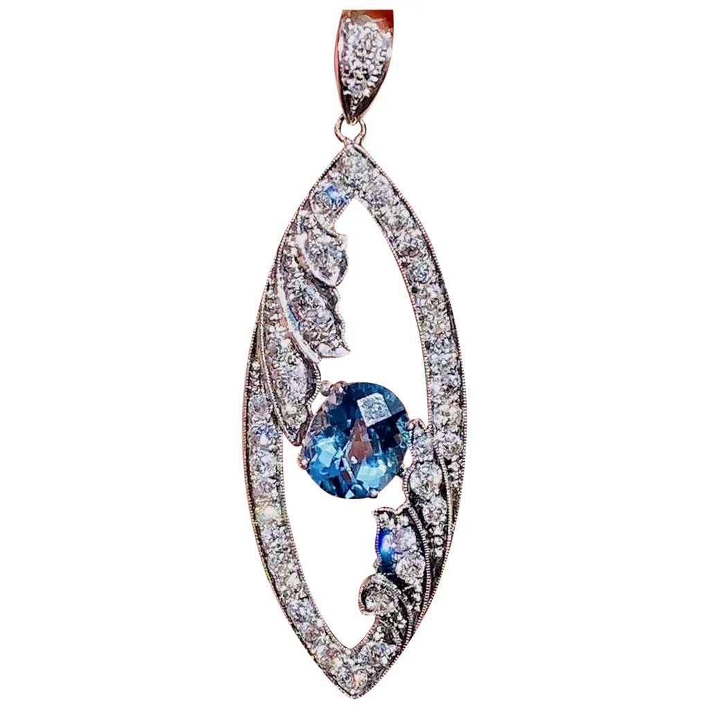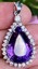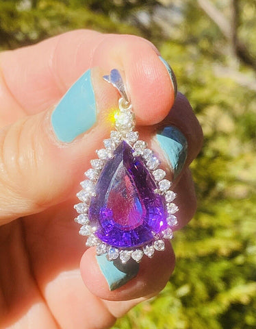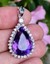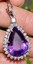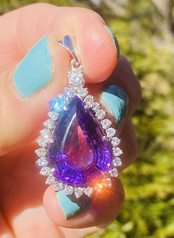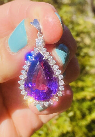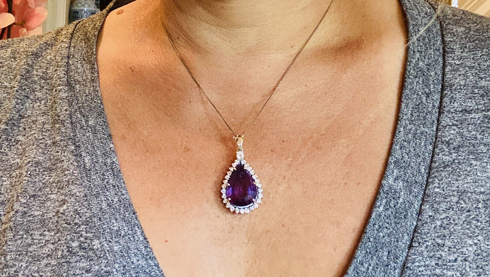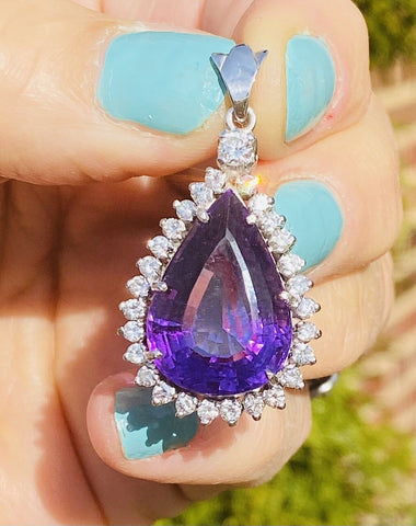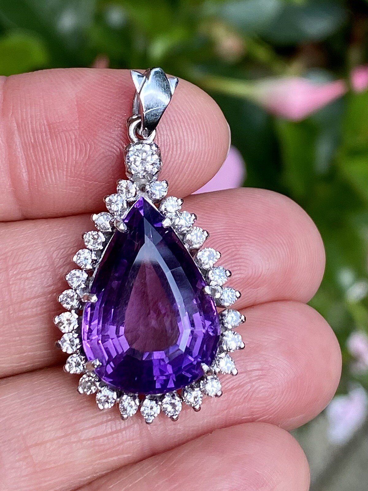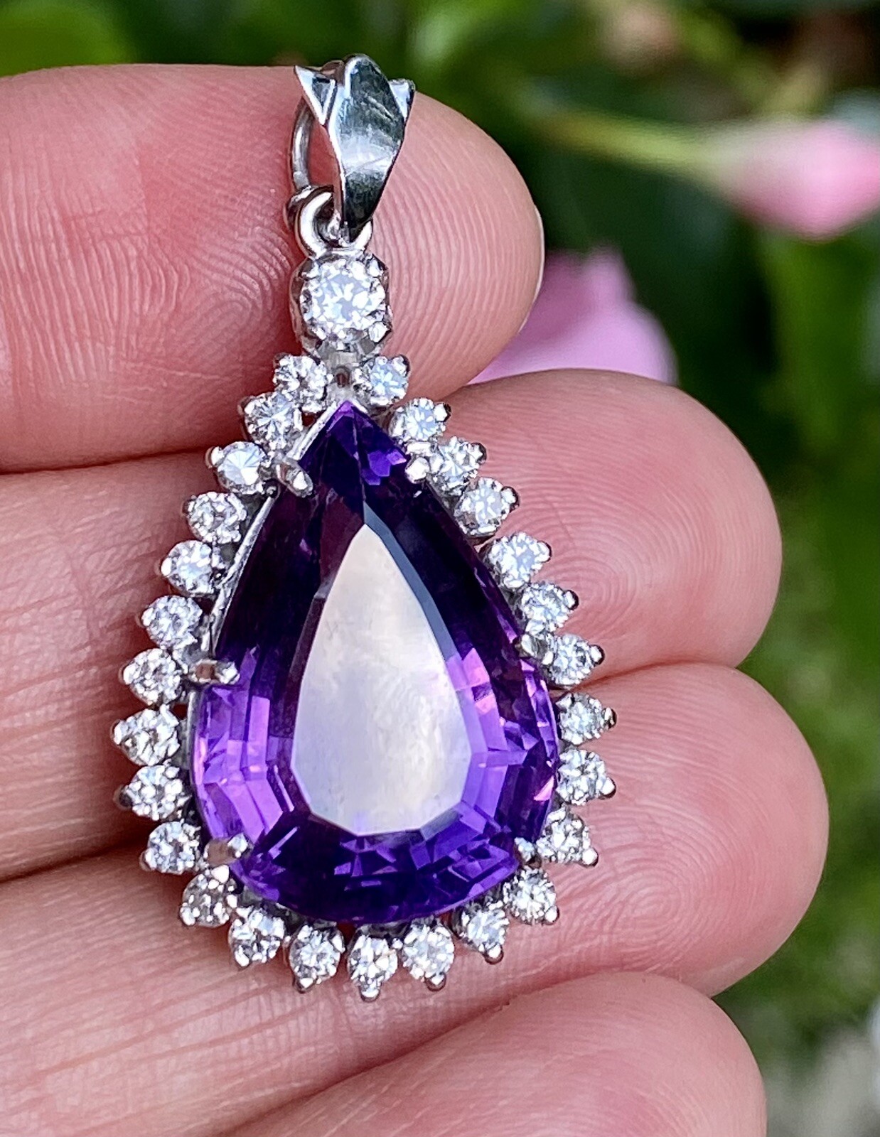 This beautiful vintage necklace pendant is set in 18k white gold setting with a large pear cut purple amethyst gemstone measuring 20.6mm long x 14.7mm wide x 10.3mm deep.  The gem is surrounded by a striking halo of brilliant cut white diamonds.  The total diamond weight is 0.97 carats.