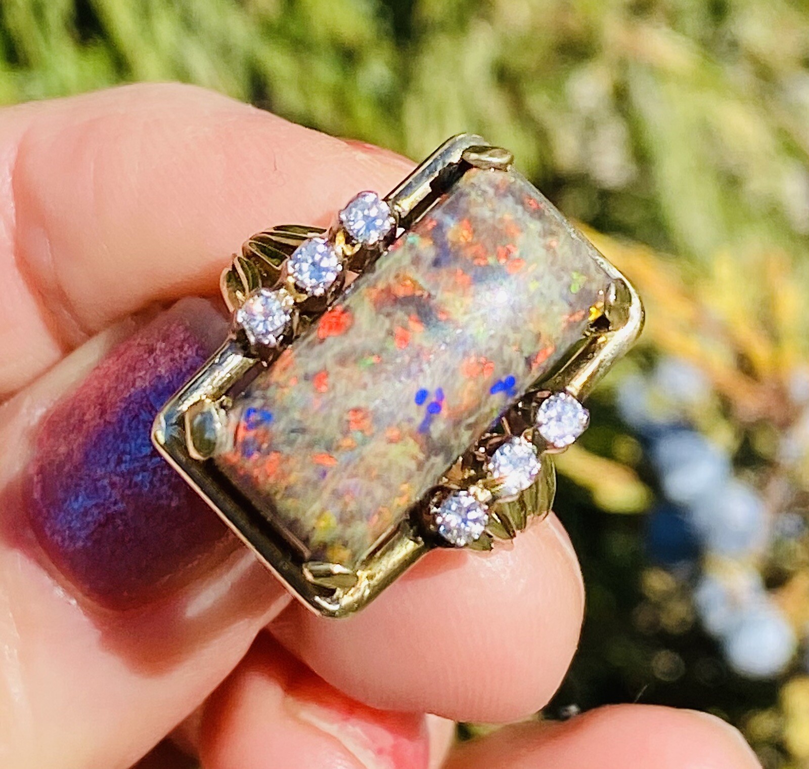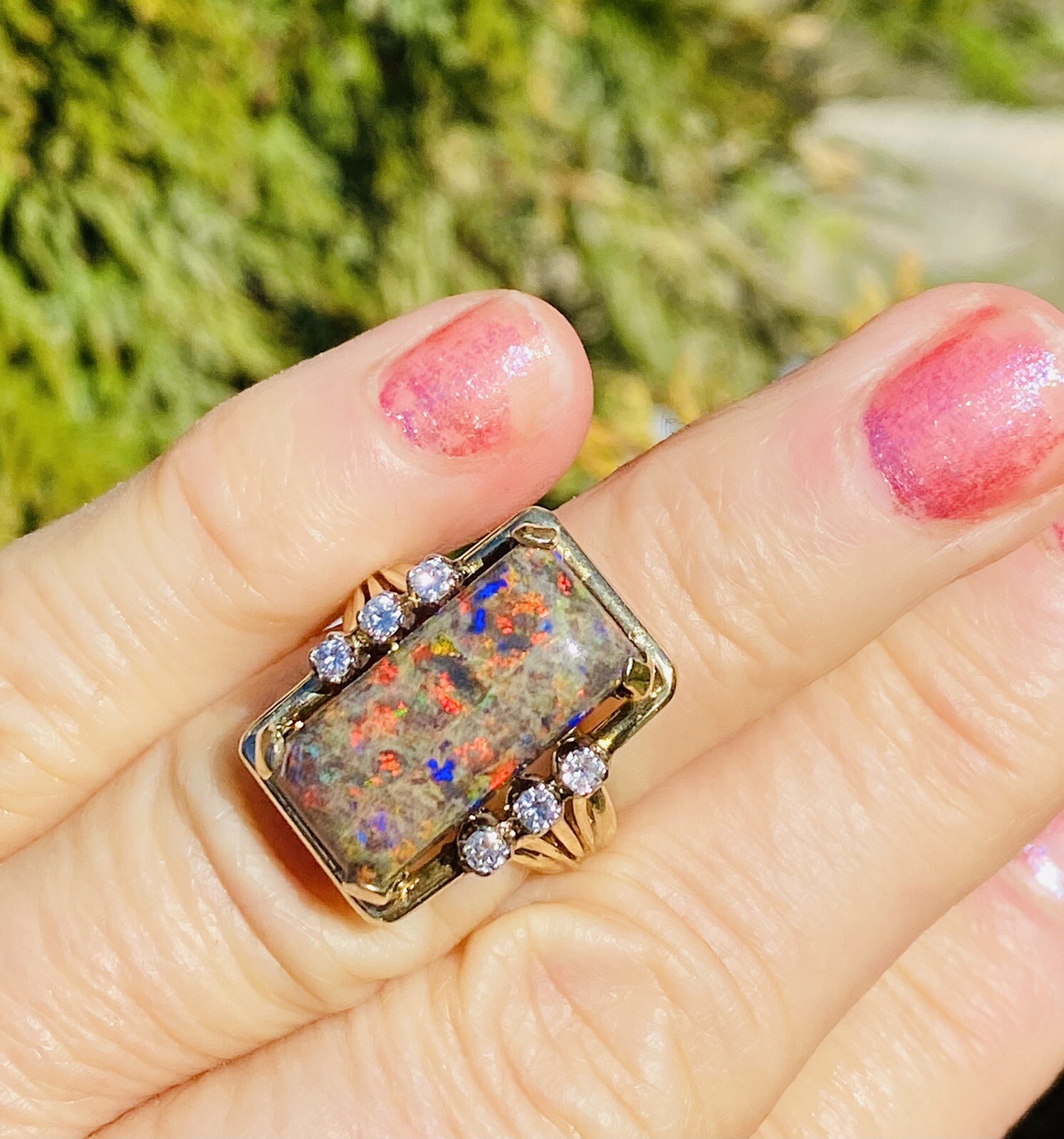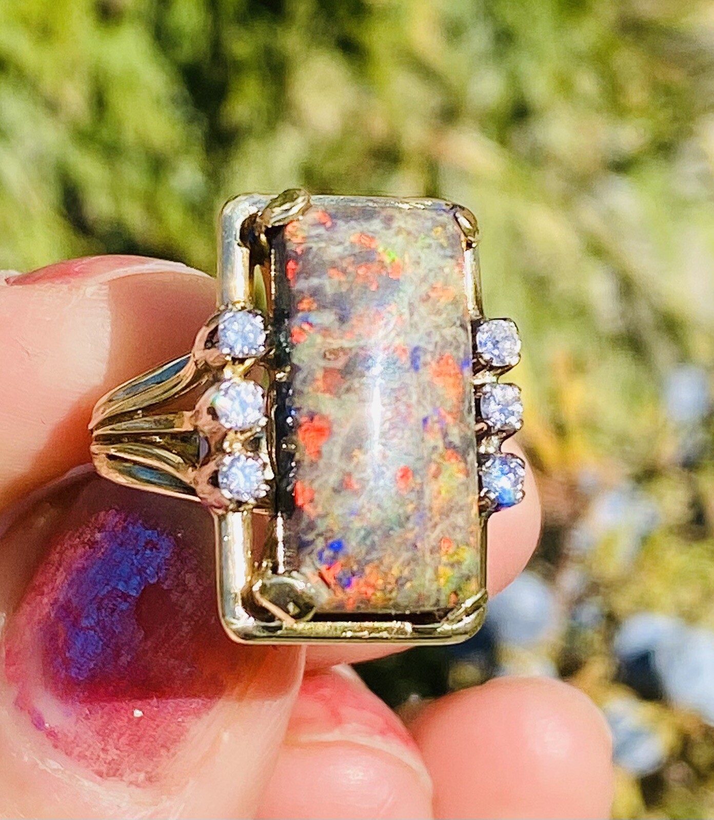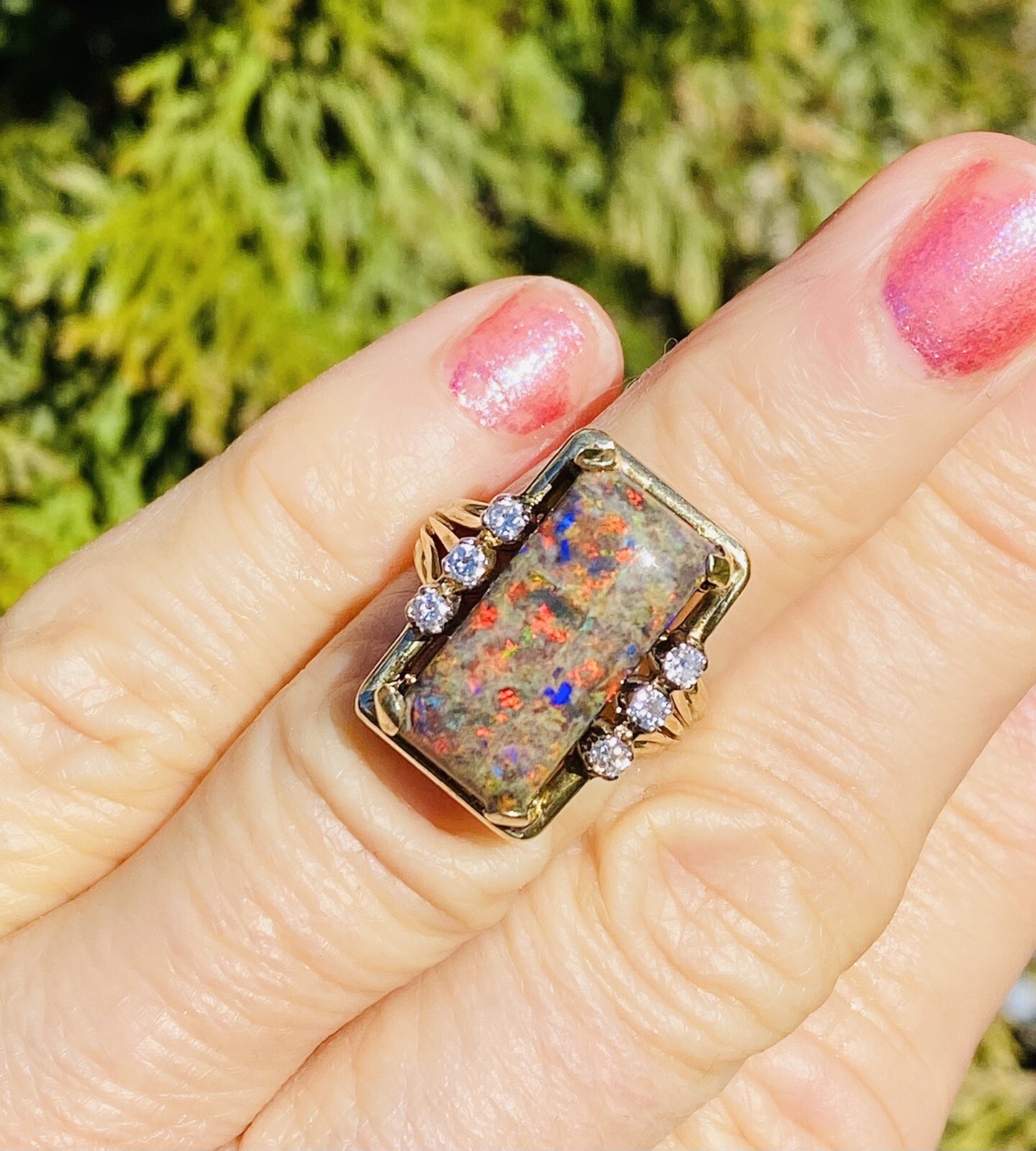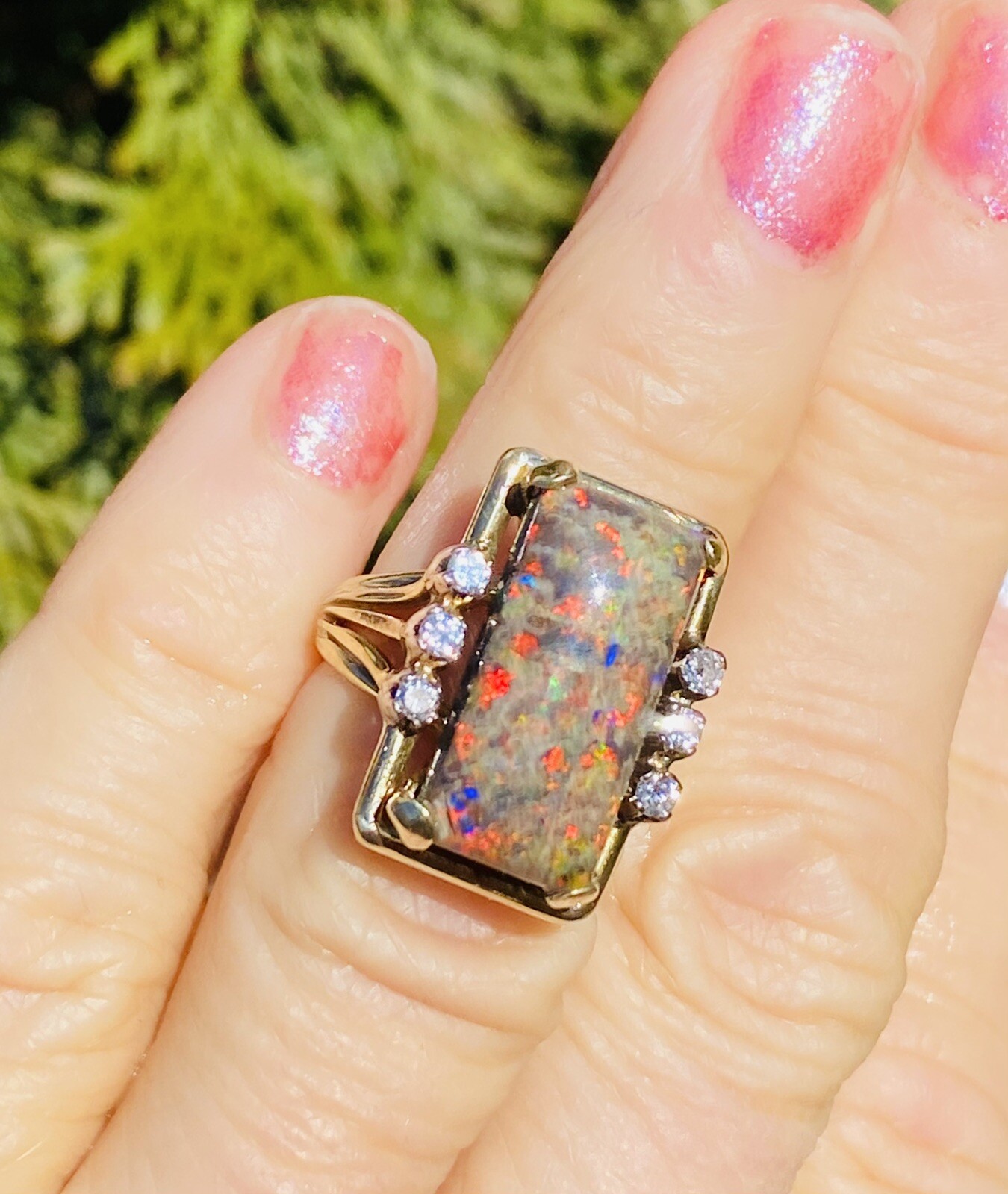 Vintage 1950s Estate 14k Gold Opal VS Diamond Cocktail Ring